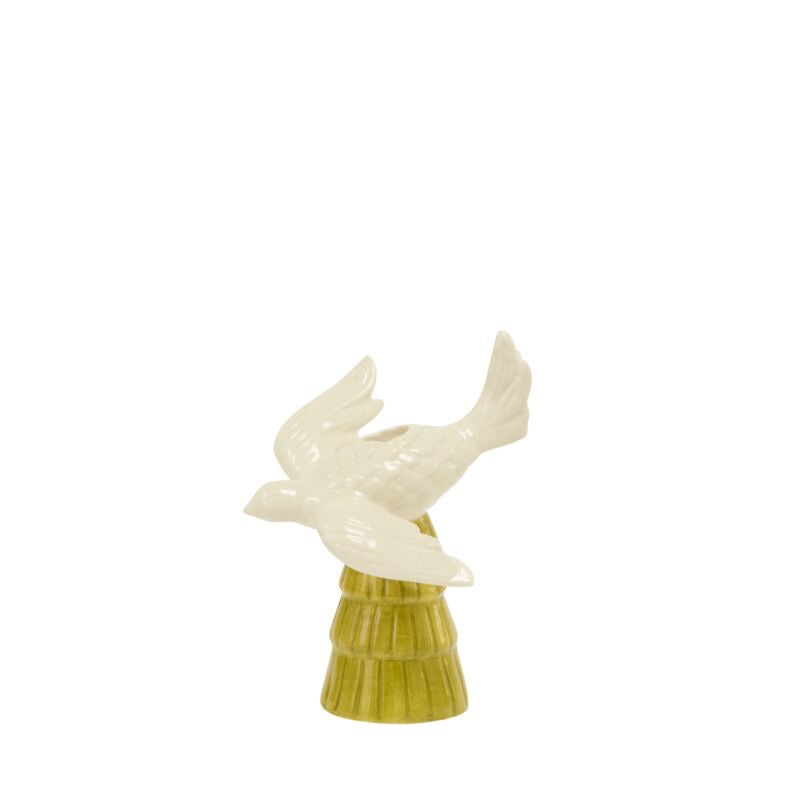 Add a touch of vintage cheer to your holiday setup with the small Peace Tree Candleholder. This adorable ceramic piece showcases a white dove perched on a vibrant green tree, hand-painted with delicate details and finished in glossy shine. Perfect for holding festive taper candles, it also shines as a sweet decorative figurine. Measuring 5" wide by 5.5" long and 7.5" tall, it’s a delightful accent that spreads holiday joy.