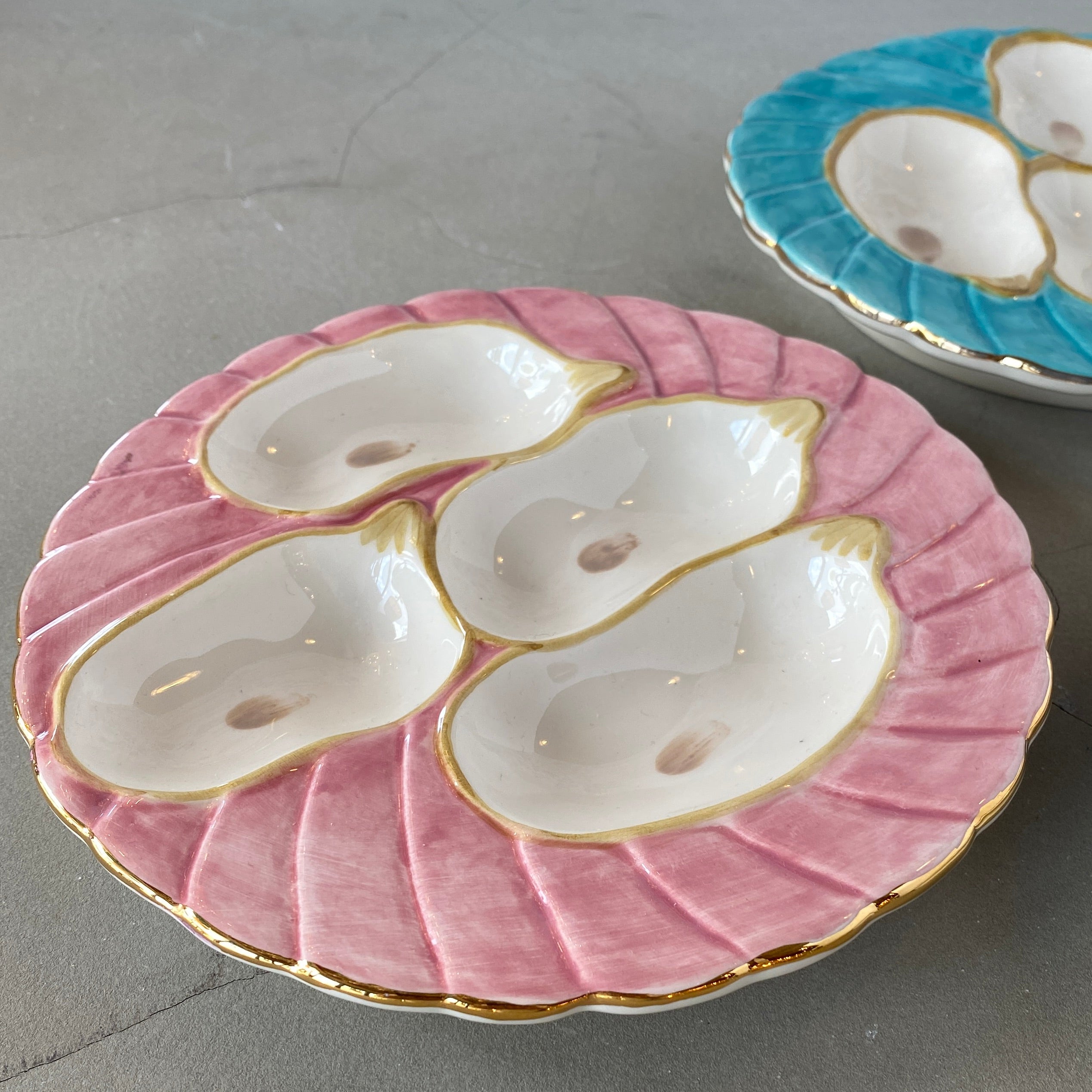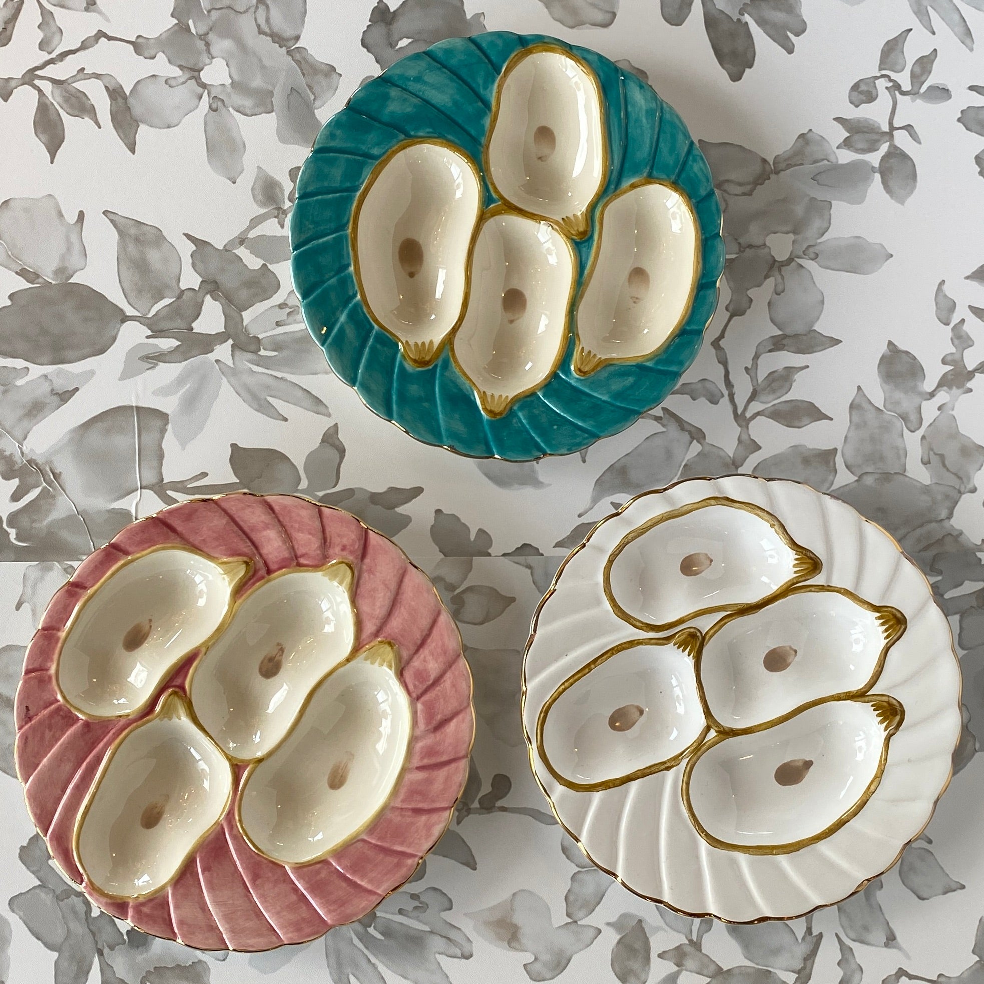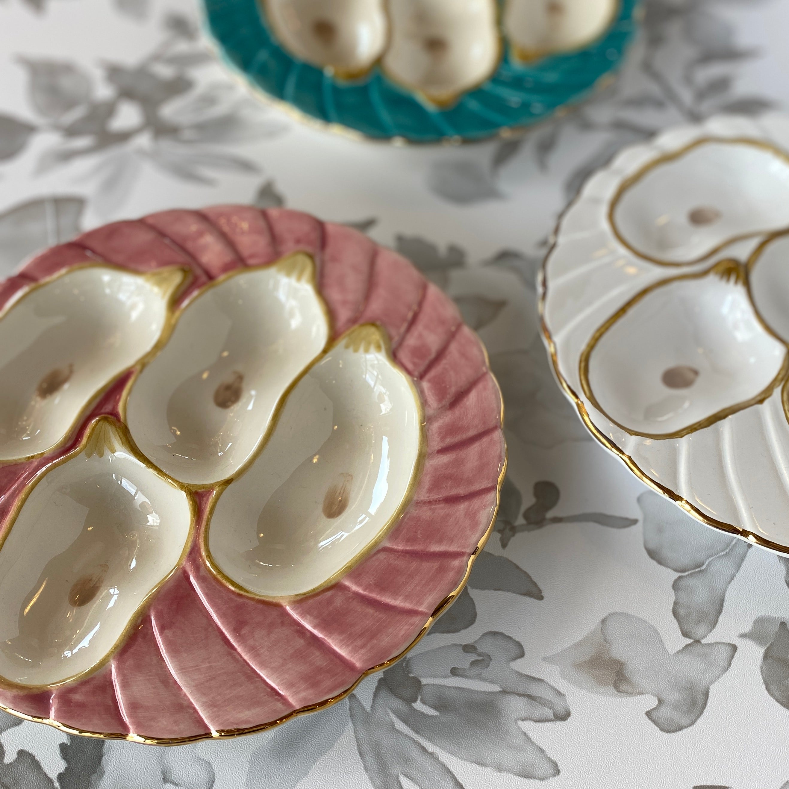 Oyster plates are traditional favorites in New Orleans best restaurants. Ours are perfect for serving raw oysters or any seafood creation. The gold trim and detail add a special element you can dress up or down on your table. Hand-wash. 7.25"Wx1"H
