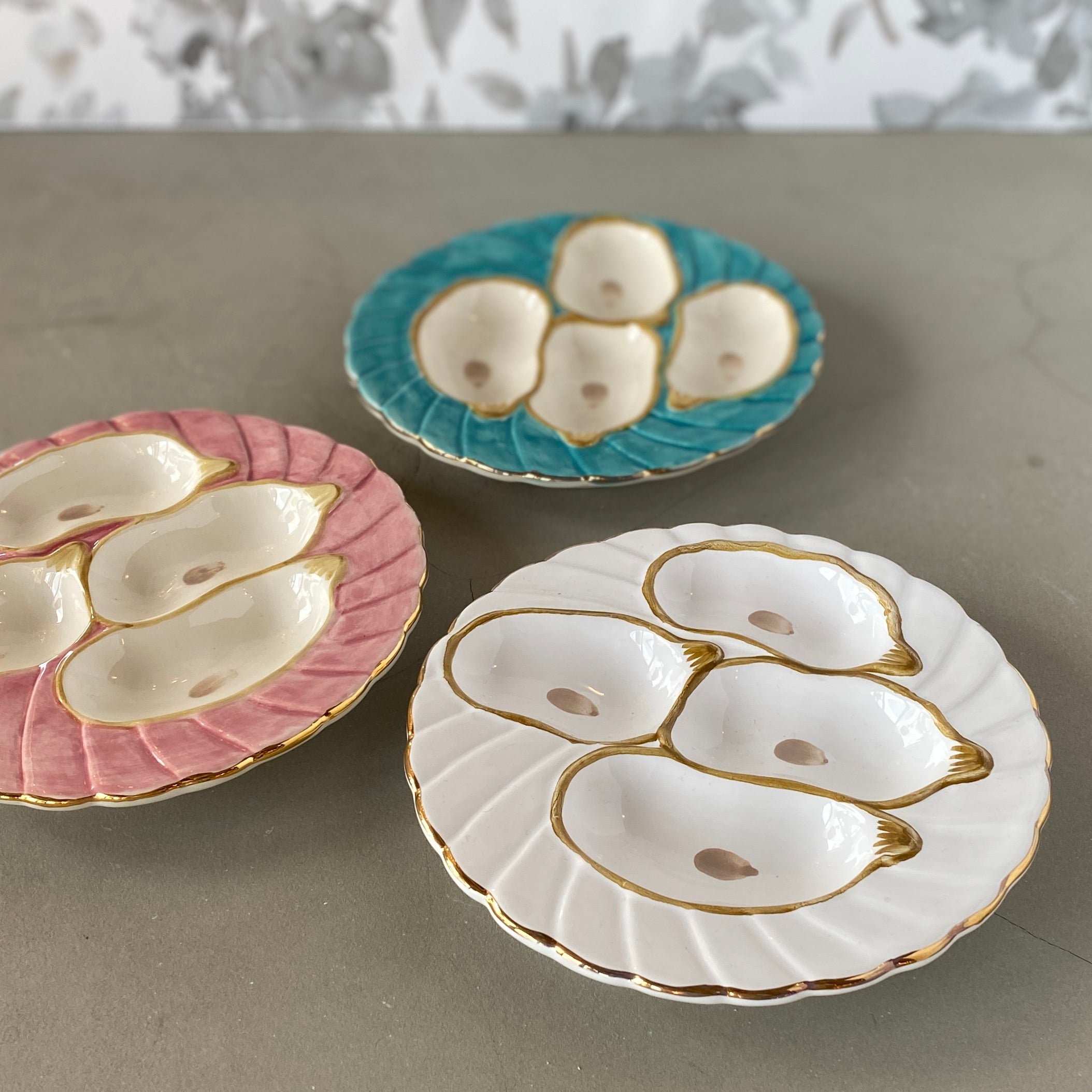 Oyster plates are traditional favorites in New Orleans best restaurants. Ours are perfect for serving raw oysters or any seafood creation. The gold trim and detail add a special element you can dress up or down on your table. Hand-wash. 7.25"Wx1"H