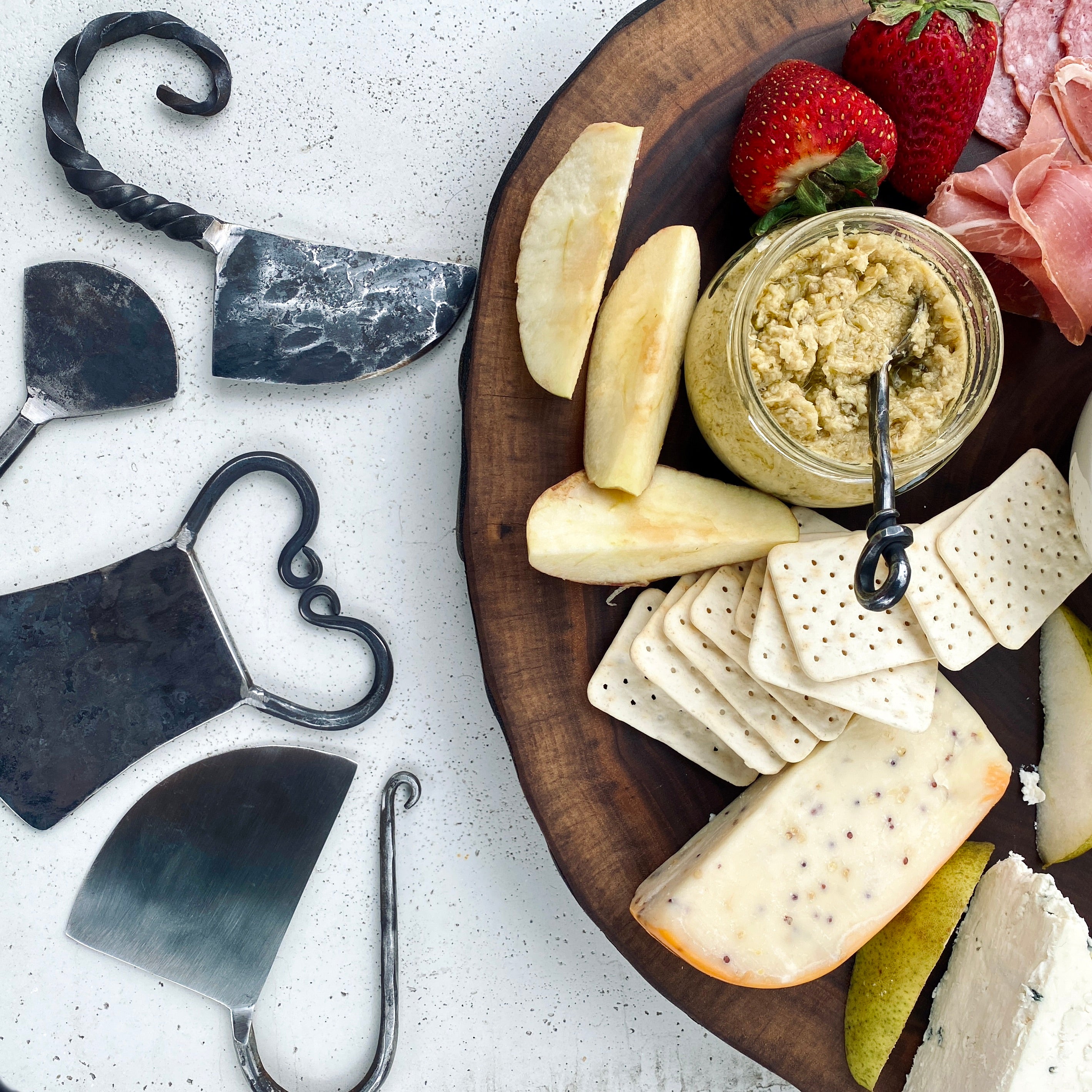 Beautifully hand-forged cheese chopper from solid steel. We love how the handle makes it easy to cut even the hardest cheeses. The Chopper is also great for cutting herbs and garlic. Solid steel construction. Made in the USA.Dimensions: 5″ Wx 5″L