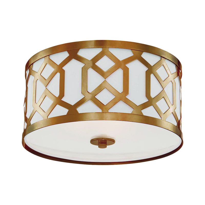 The Jasper Three Light Ceiling Mount is sophisticated and graceful with its classic geometric pattern and aged brass finish. The timeless silk drum shade adds a luxurious touch, creating a look of modern elegance with a classic flair.