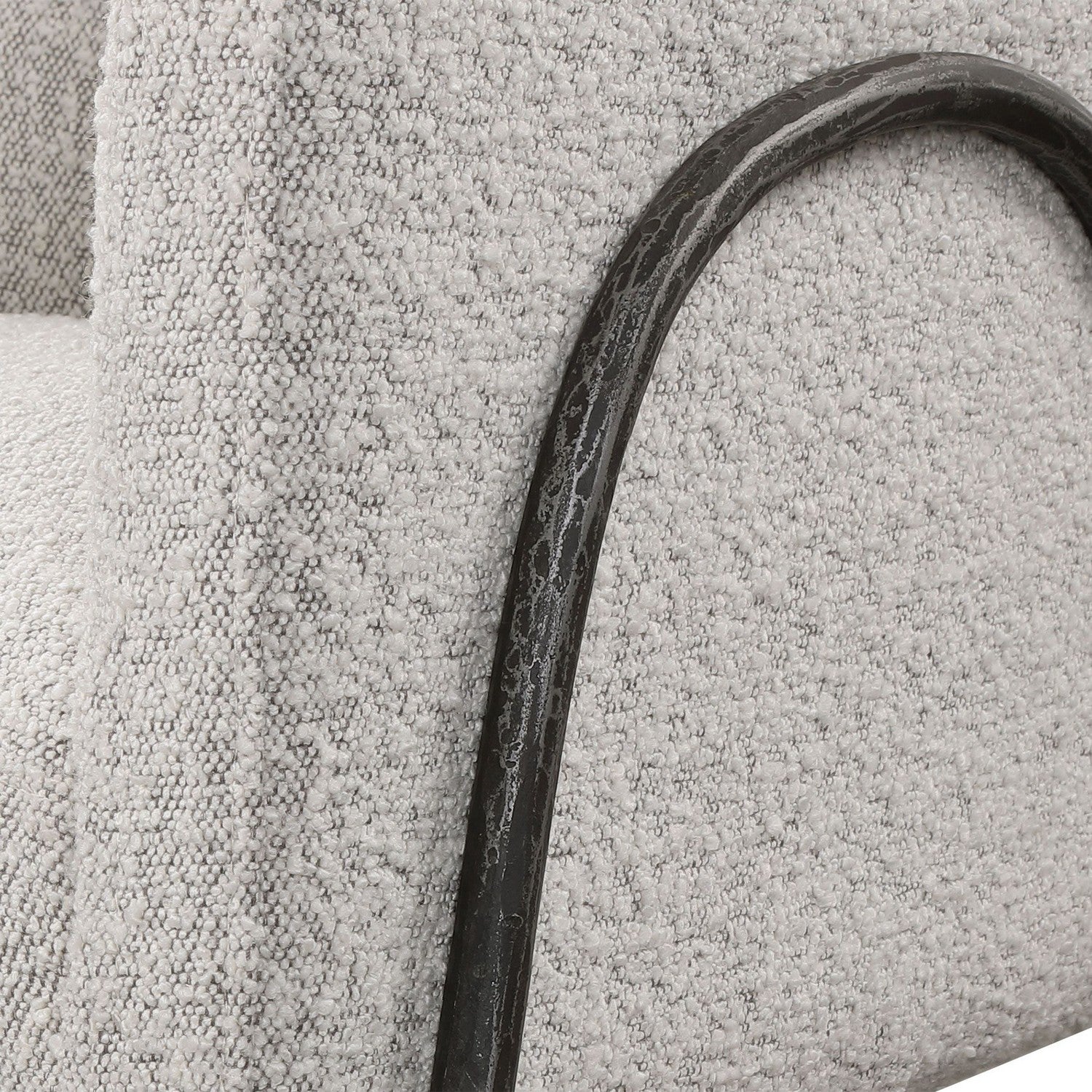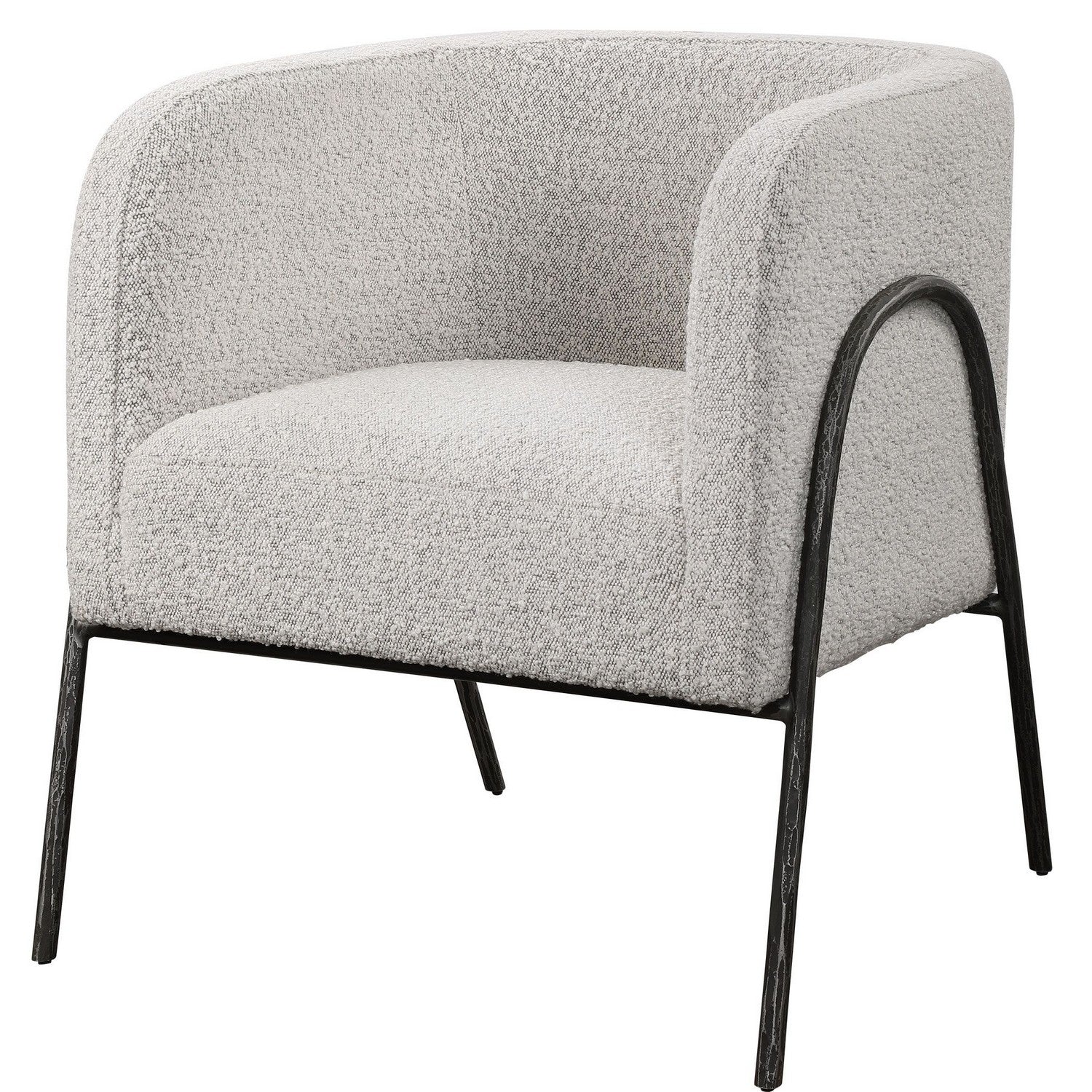 Inspired By Scandinavian Designs, This Barrel Back Style Chair Showcases Elegant Curved Lines With A Chiseled Iron Frame In A Natural Aged Black Iron Finish. A Casual Ivory And Warm Gray Boucle Fabric Accents This Modern Look. Seat Height Is 19".