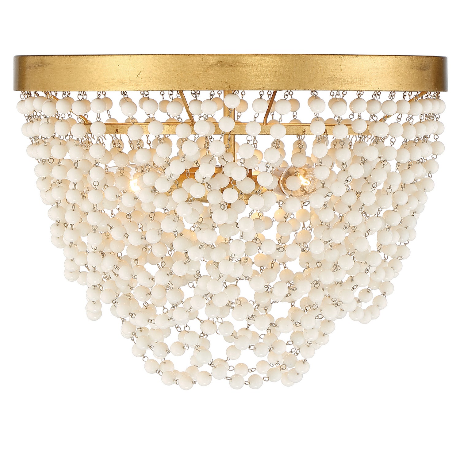 This contemporary, traditional empire-style ceiling light features an intricate display of cascading white beads and comes in a stunning gold finish. Perfect for adding a touch of elegance and luxury to any living space.