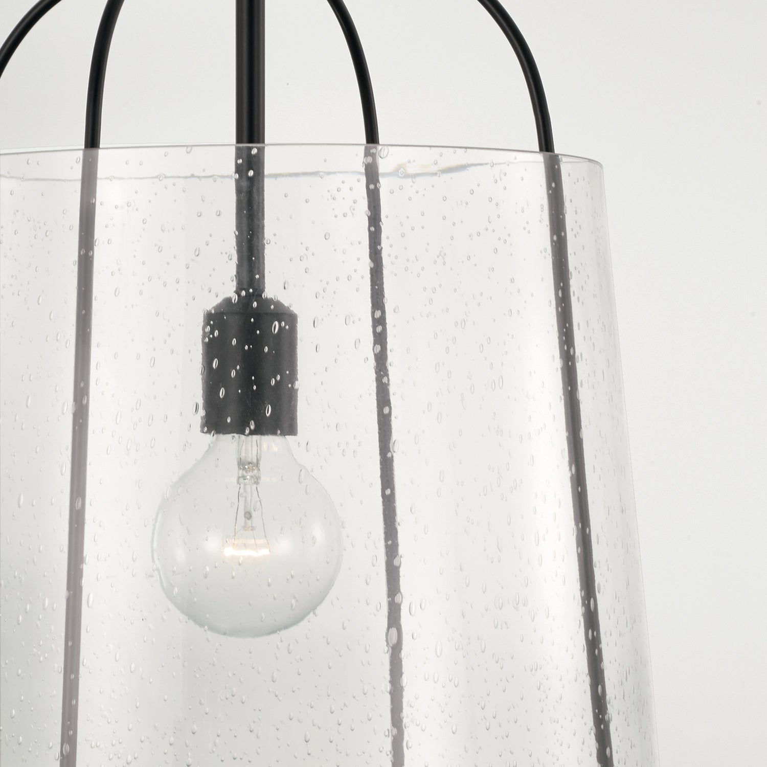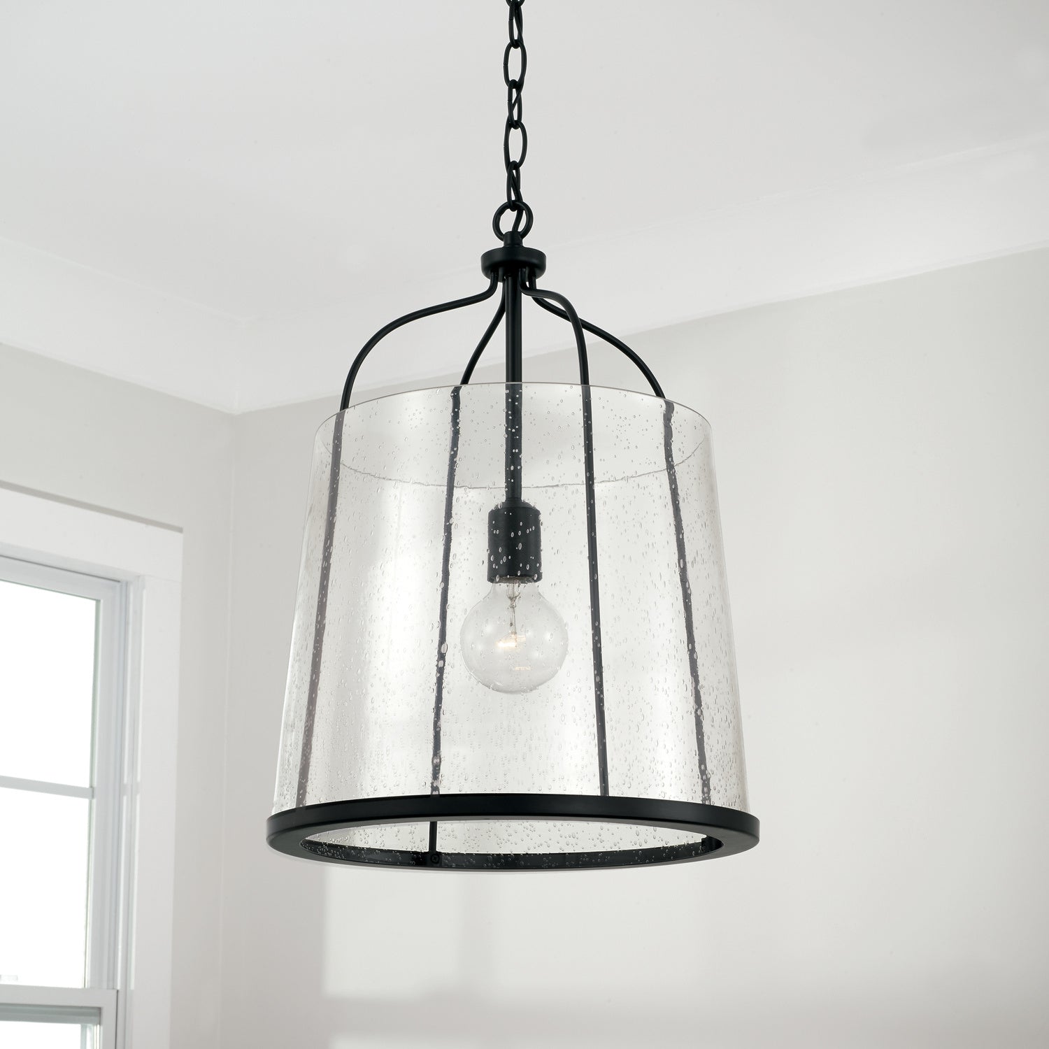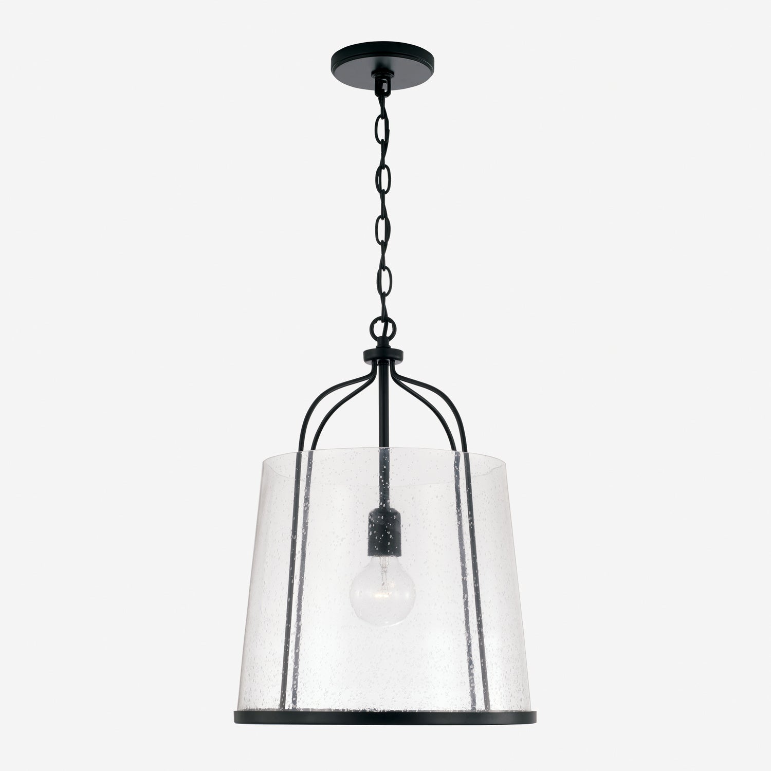 This stylish Macon One Light Pendant features a black finish and seedy glass, perfect for injecting a touch of transitional elegance into the home.