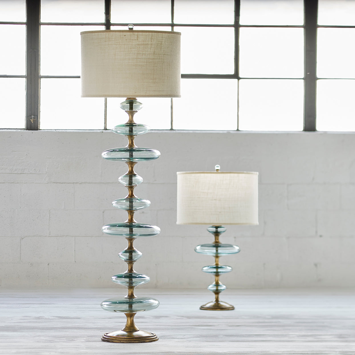 The Edisto Floor Lamp is made of hand-blown recycled glass discs layered on an antique gold metal finish base with a cream burlap round drum shade and a glass and metal finial.