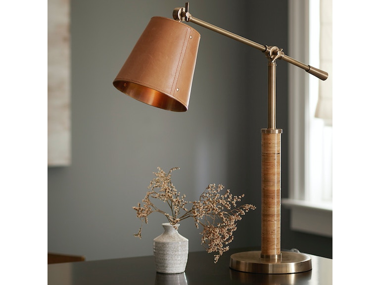 The Kotor Task Lamp features a metal shade hand-wrapped in leather and accented with brass rivets and an antique brass finished metal body and base with hand-wrapped rattan details. Handsome and sophisticated with a coastal style.