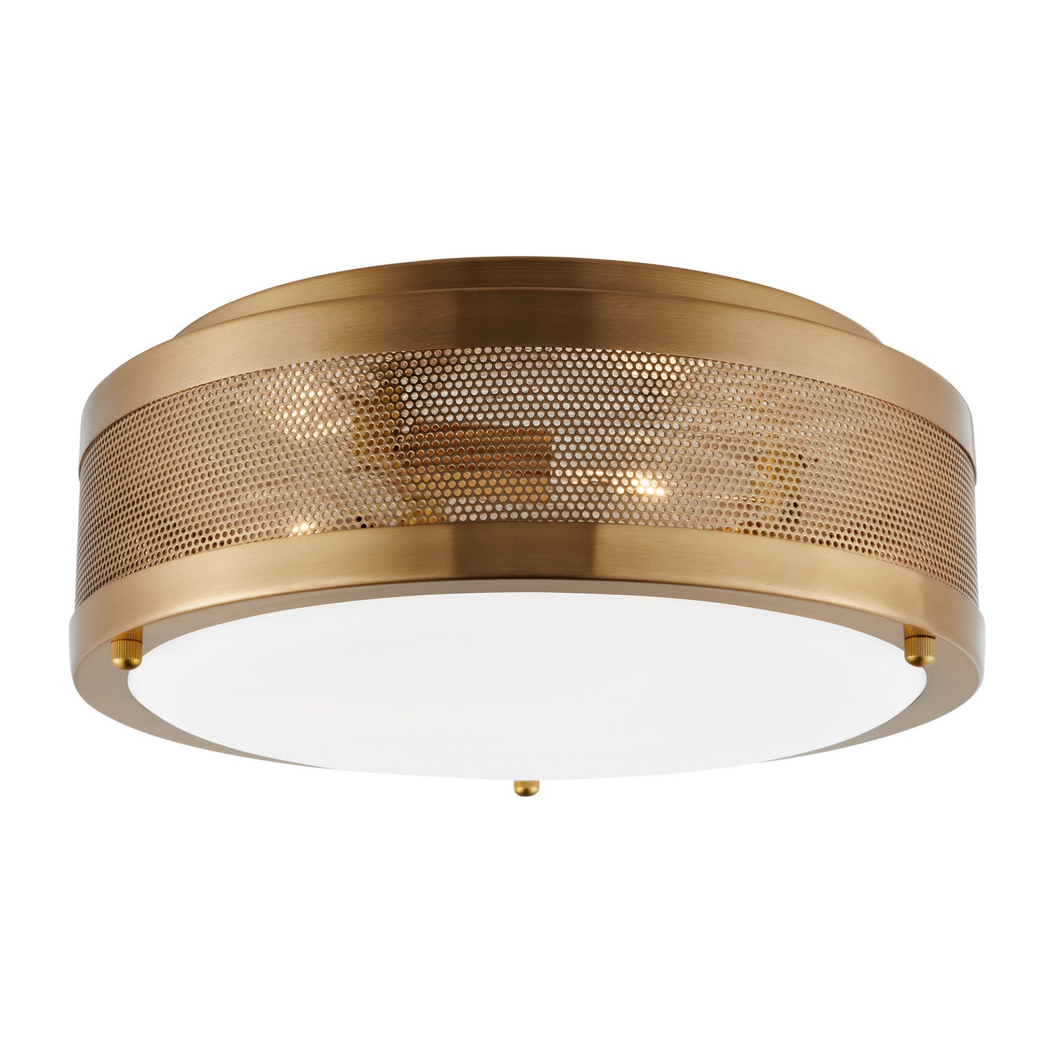 The Sea Gull Collection Vander three light flush mount fixture in Satin Brass Vander is a loft-style flush mount featuring a perforated metal exterior bandnd an opal etched diffuser. Use it in a mudroom or laundry room for unfettered, functional light.
