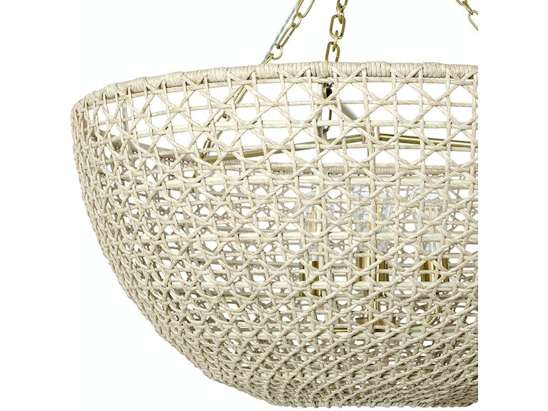 Outdoors or inside, the Cannon Chandelier will make heads turn. A truly stunning addition to your outdoor space. Hand-woven all-weather synthetic rope in an oatmeal color wrapped around a powder coated metal frame. Chandelier comes with an antique brass finished chain and canopy hanging kit. Suitable for covered outdoor use in a damp location with no direct water contact.The Details Matter