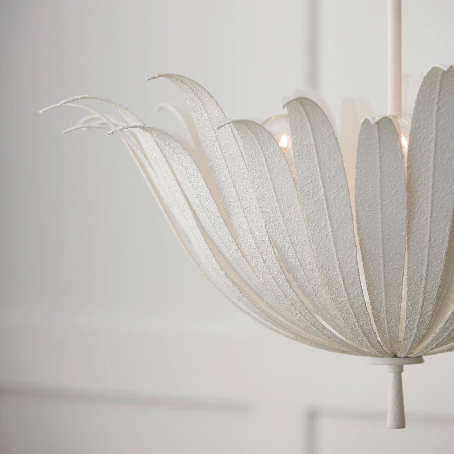 The botanically inspired Sardis pendant in a textured white finish blooms with style and beauty. The graceful metal leaves are highlighted by the soft light and semi to come to life. The Details Matter