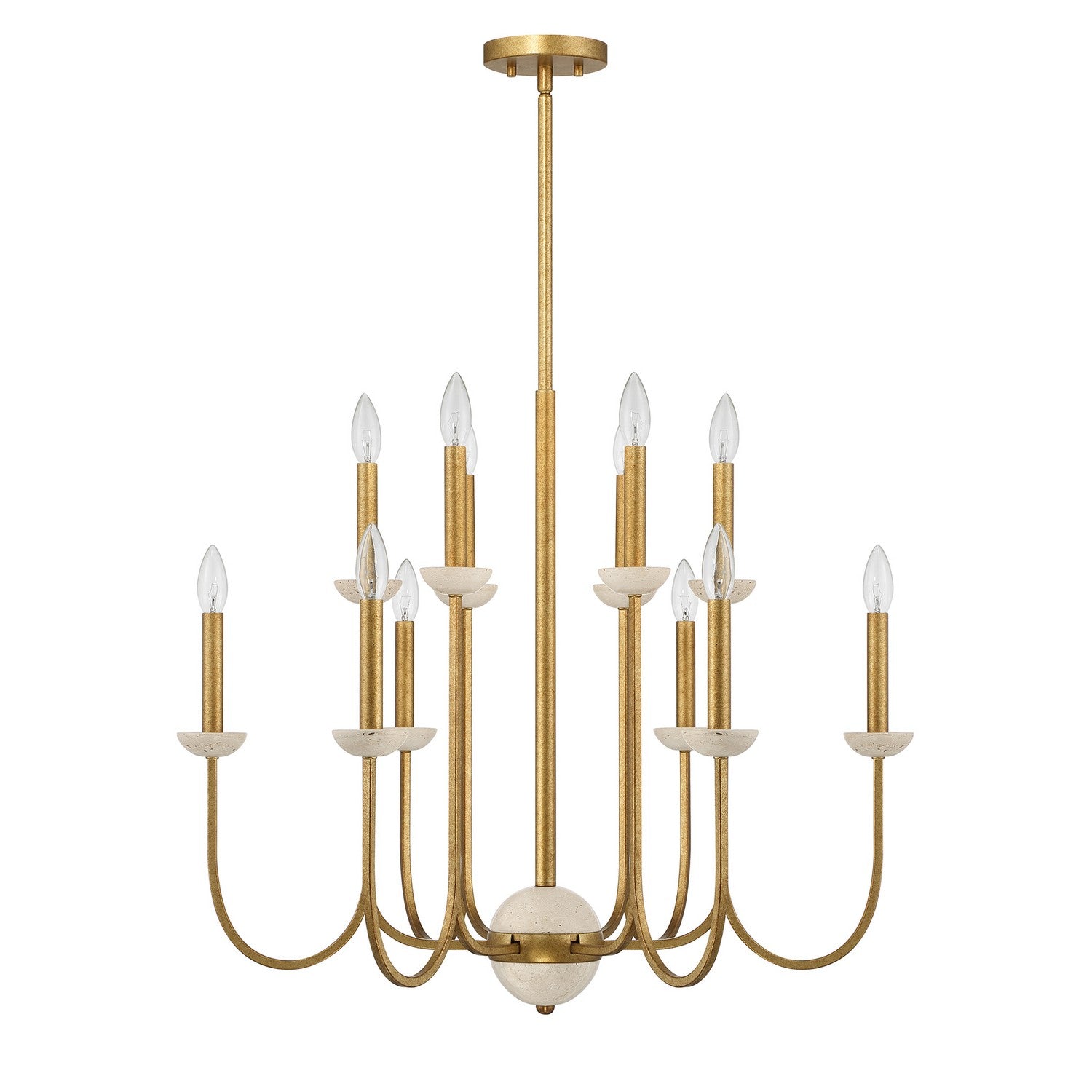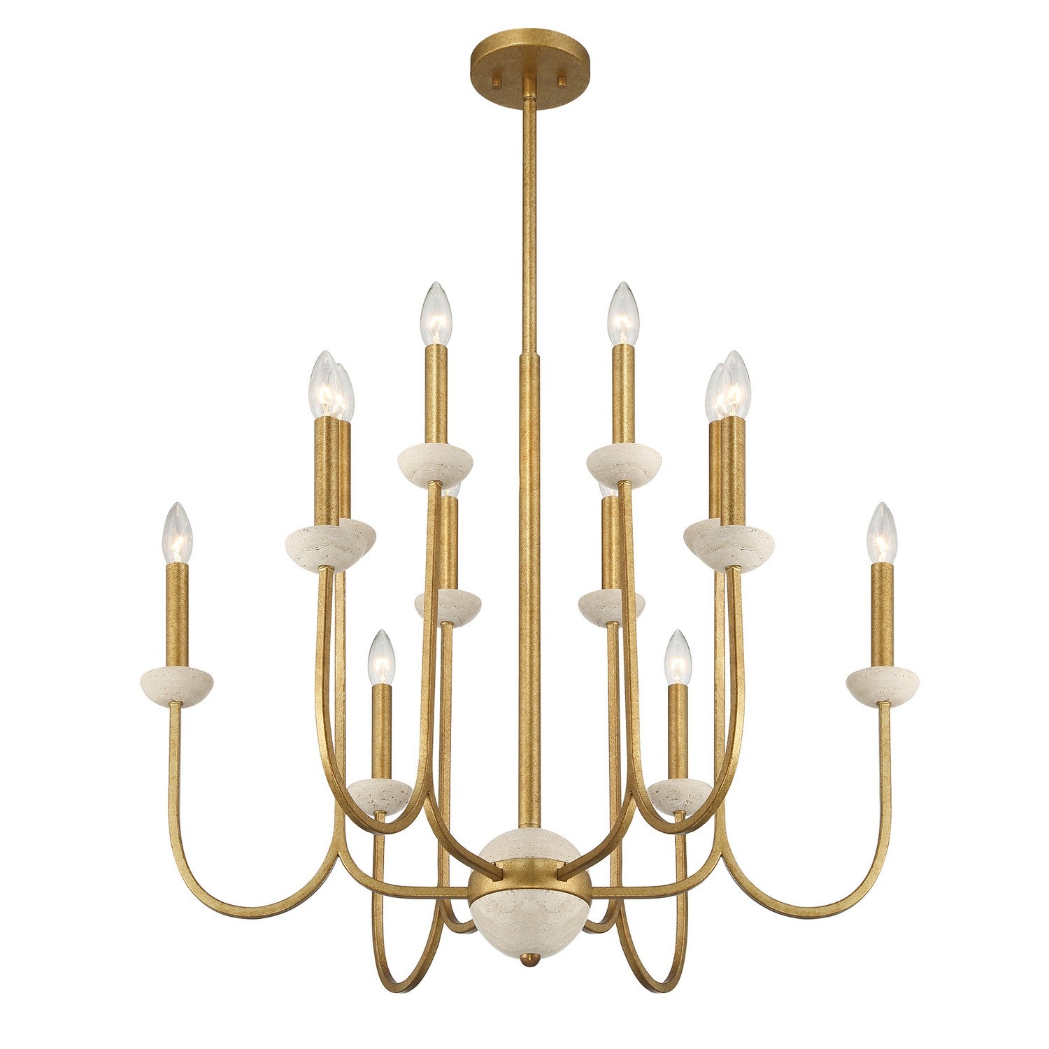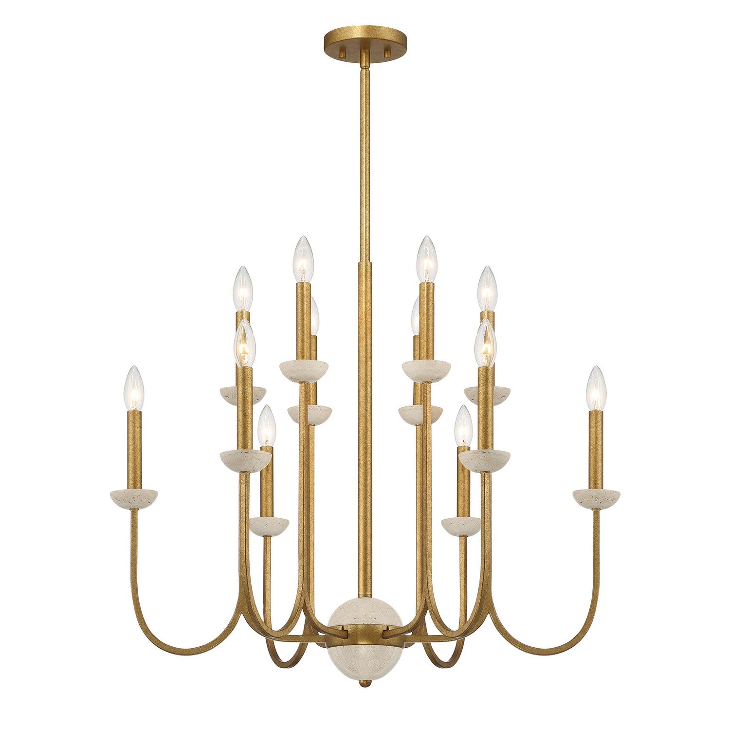 The Savoy House Oakhurst 12-light chandelier expertly blends Art Deco boldness with an inviting organic touch. Dramatically curved arms are topped with candle cups crafted from natural travertine. This beautiful stone features small holes and gaps, an example of the perfect imperfection of nature. An Antique Gold finish amps up the texture and glamour. Oakhurst is 30" in width and has an adjustable height ranging from 25" to 79". Comes with four 12" downrods and one 6" downrod. Uses twelve candelabra size bulbs of up to 60 watts per bulb. Bulbs not included.