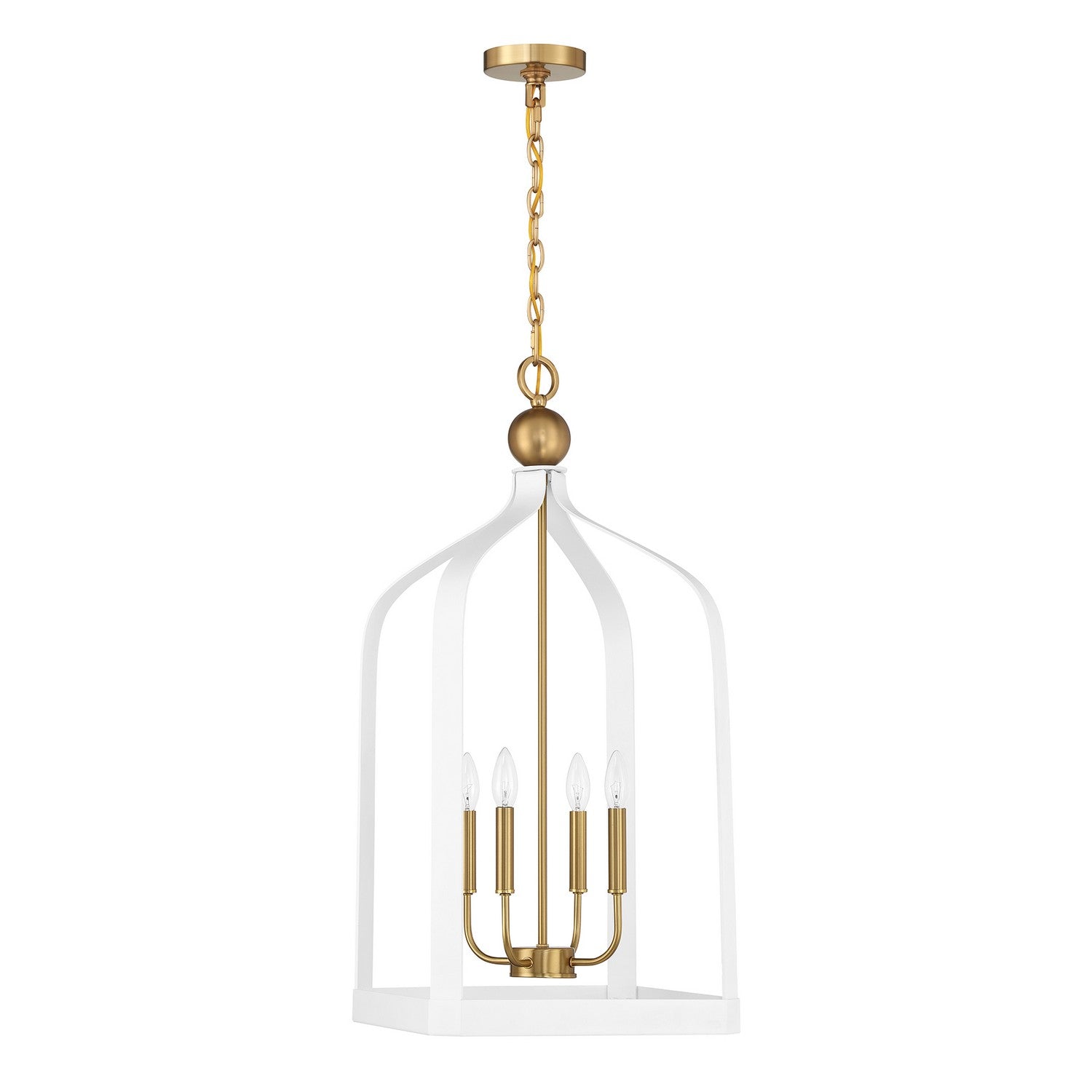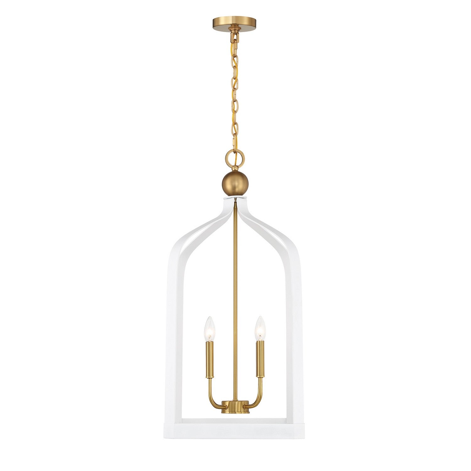 The Savoy House Sheffield 4-light pendant offers up a beautiful, elegant and classic look with a lantern-like style, airy openness and a White finish with Warm Brass accents. It is 32" in height and 15" in width. It uses four candelabra size bulbs of up to 60 watts per bulb. Bulbs not included.