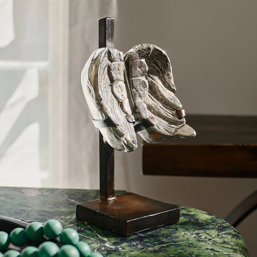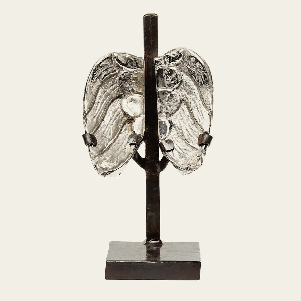 Artist, Jan Barboglio is known for her angels and this angel wing sculpture is truly a collector's must have. The nickel wings are done in a heavy wax cast and the stand is a substantial heavy iron stand. A beautiful additional to a bedroom dresser or bookcase. Heavy wax cast nickel wings on iron stand. 13"Hx6"Wx7"L