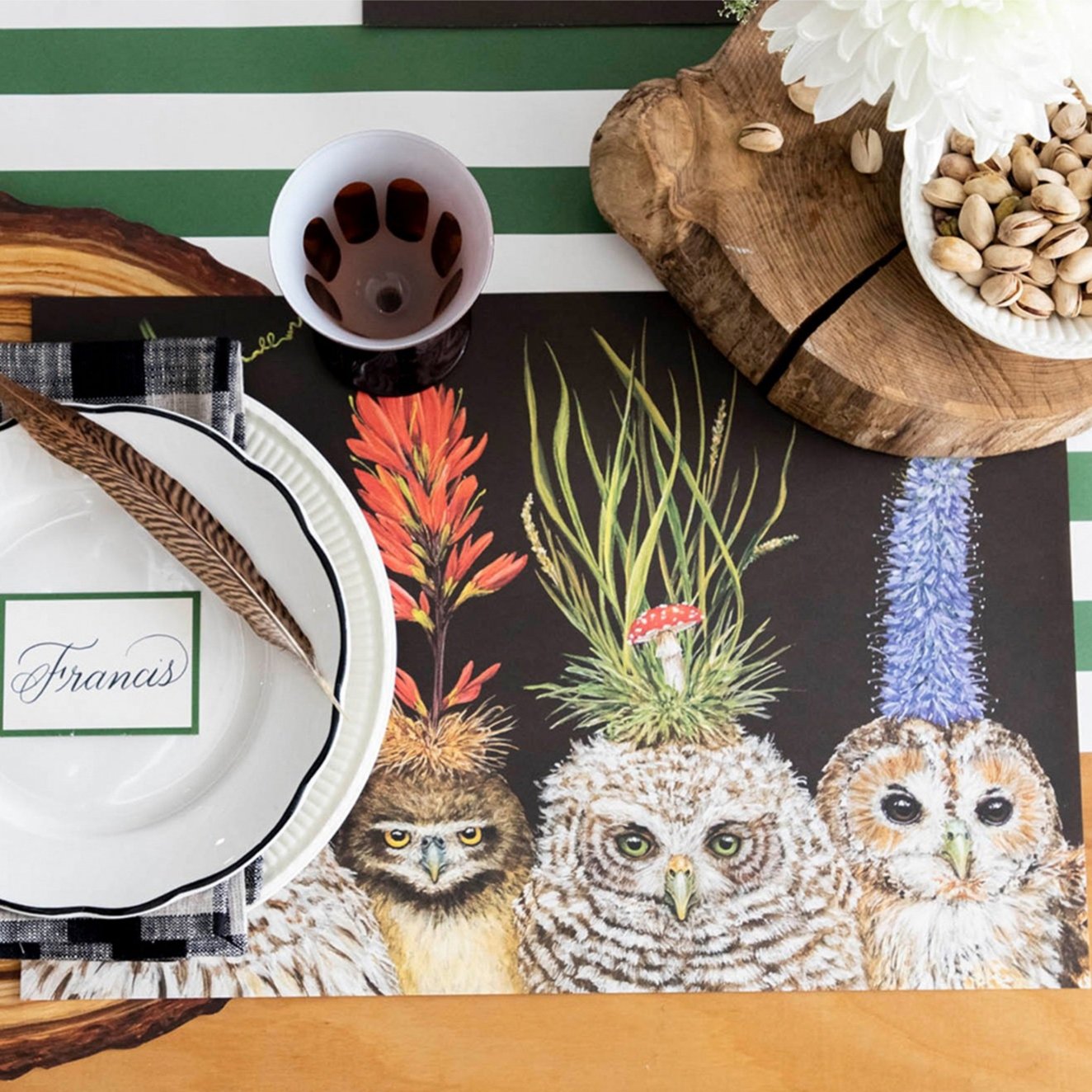 Enhance any tablescape with our whimsical Paper Placemats. These charming owls will pique interest at your next dinner soirée. Craft a forest-inspired feast and complement it with our Enchanted Forest Place Card Holders and Black Check Napkins.Rectangular Placemats come in pads, Includes 18 sheets and measures approximately 18.5"x12.5"