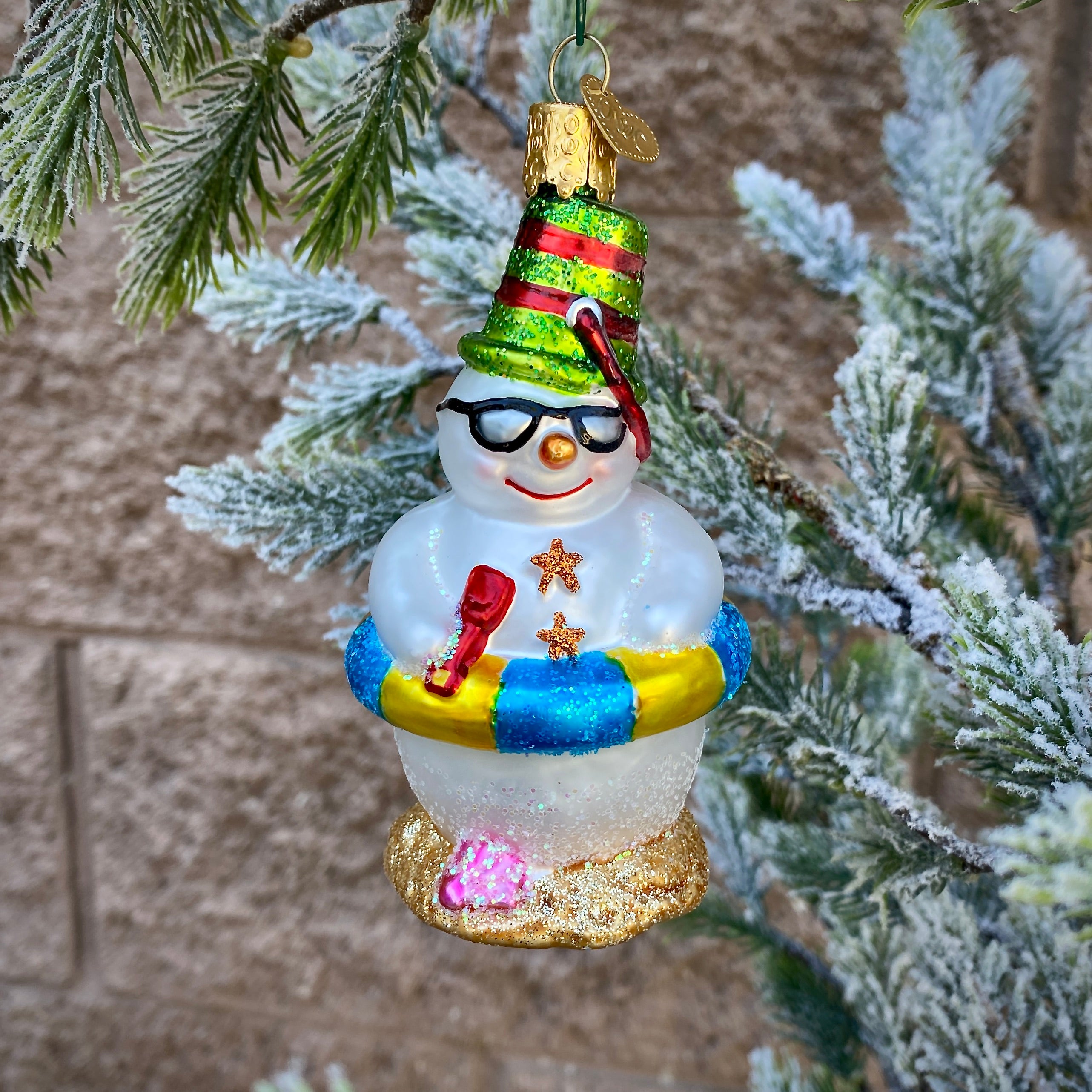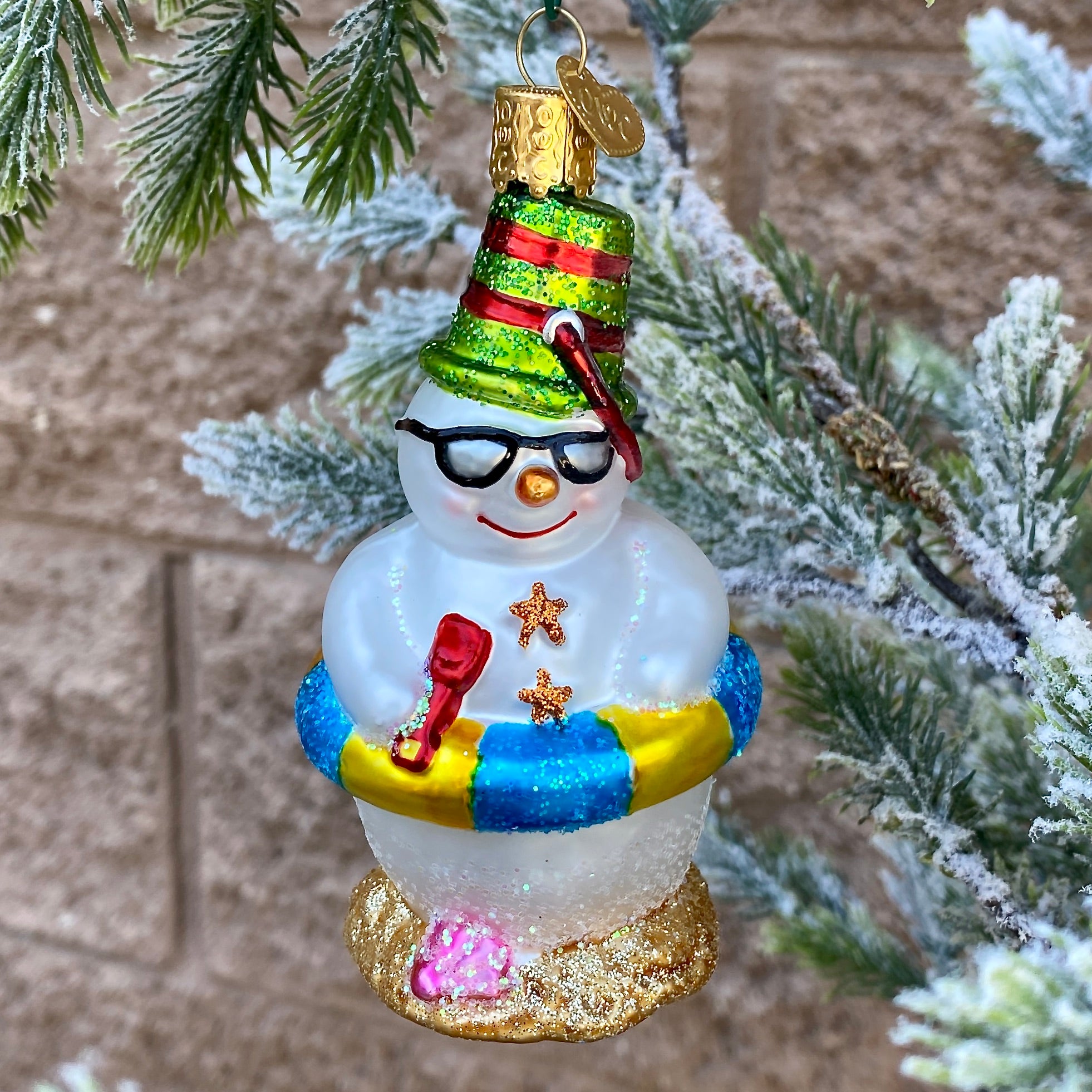 Winter can be filled with cold, blustery and harsh weather. Occasionally, a snowman sneaks away to a hot summer beach, even if only in his imagination. Our friend has gathered his sunglasses, sand toys, floaties and seashells for some fun in the sun! Each ornament is mouth blown into finely carved molds. 4"H X 2.25"L X 2.25"W