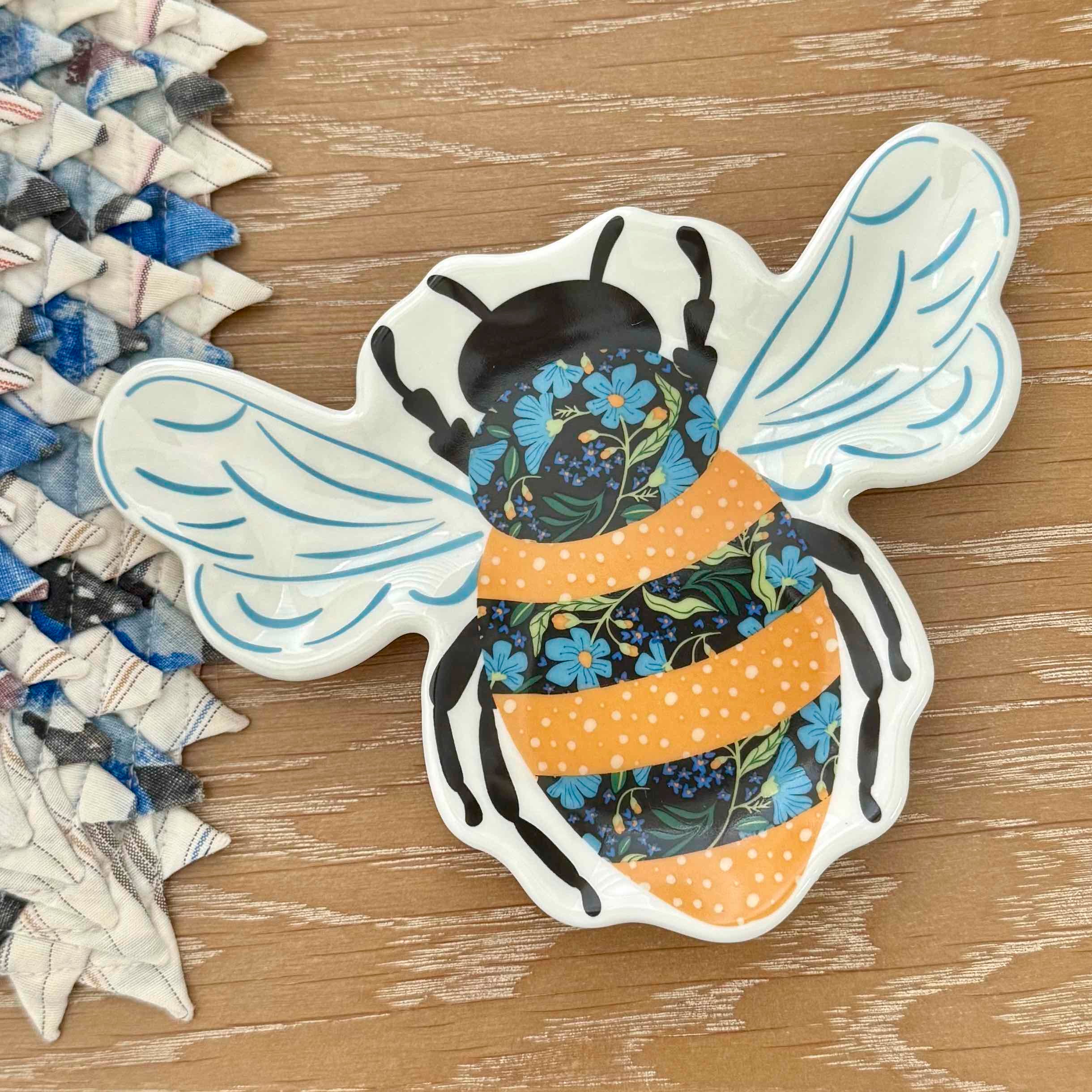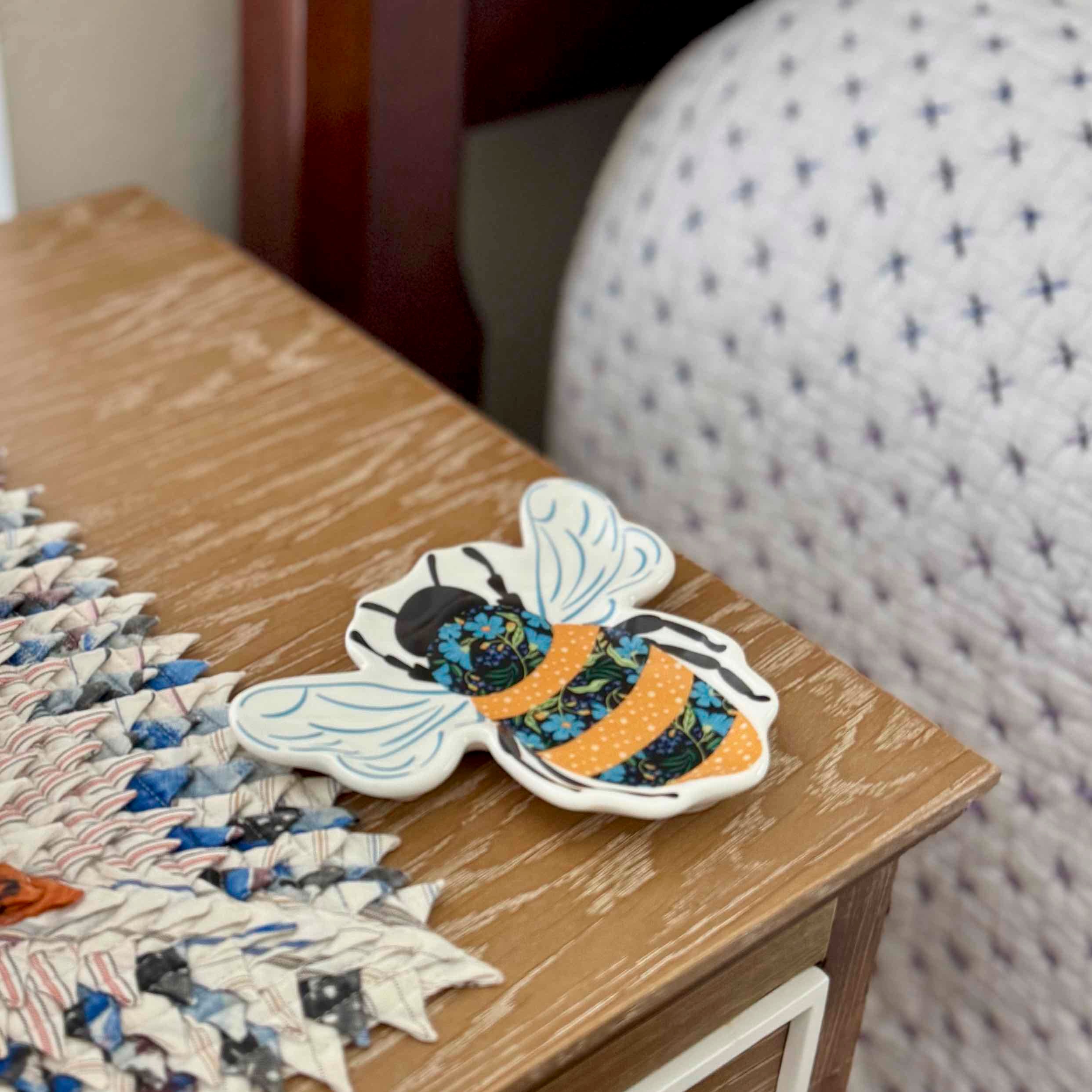 Bring a little buzz of joy into your space with the charming Bee Happy trinket tray, adorned with a cute bee design. Ideal for keeping your jewelry, keys, or tiny treasures organized, this tray combines practicality with fun style. Its vibrant hues and fine details brighten up any spot, while the sturdy stoneware construction ensures lasting use and easy cleaning. At 5”L x 3”W x 0.625”H, it’s perfect for bedrooms, living rooms, or entryways—guaranteed to put a smile on your face every time you spot it.