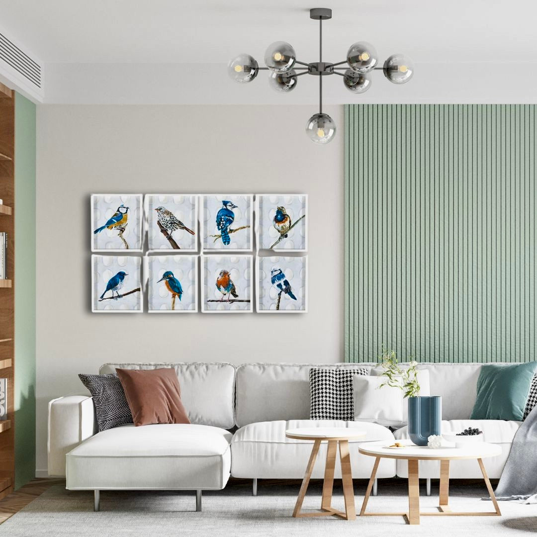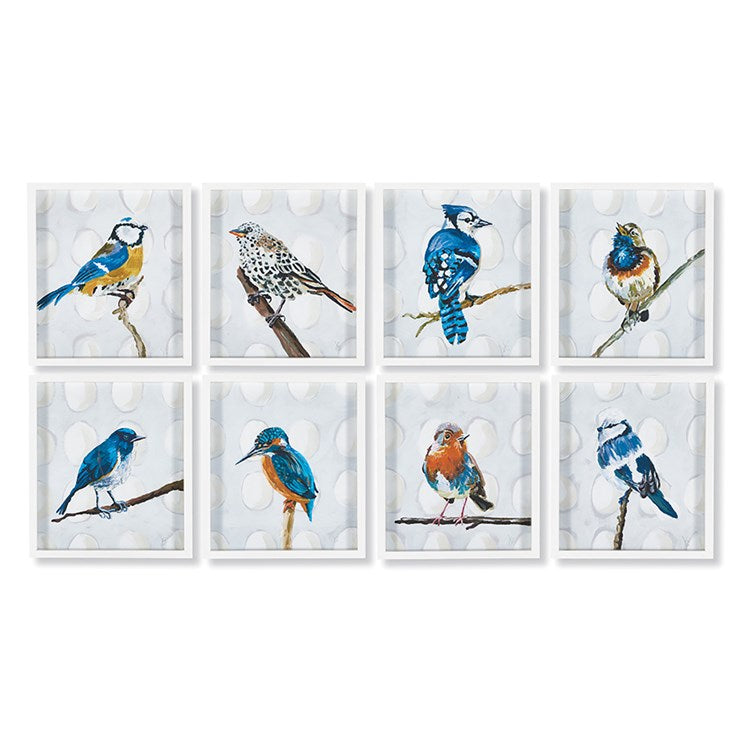 This exquisite Bird Prints Set of 8 by the talented artist conjures up a family of feathery friends anticipating the arrival of Spring. An enthralling set reflecting the bliss of nature and the creativity of the artist. 14"Hx12.5"Wx1"D