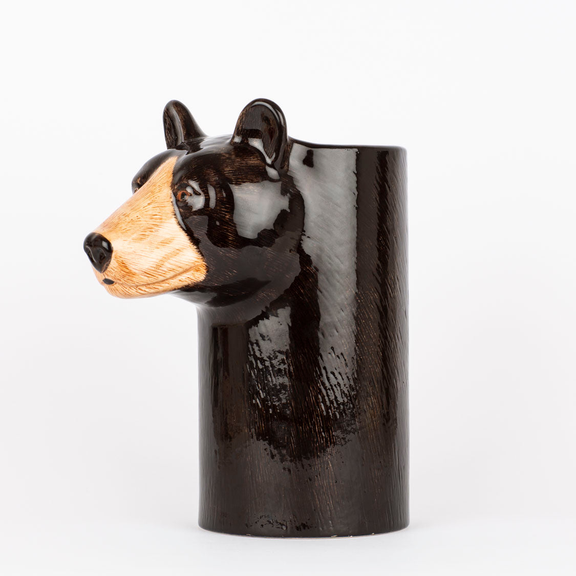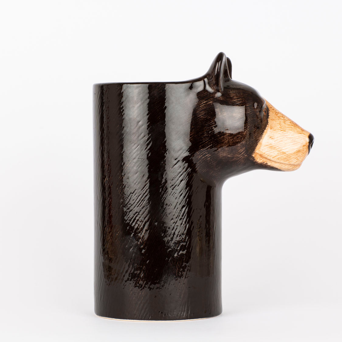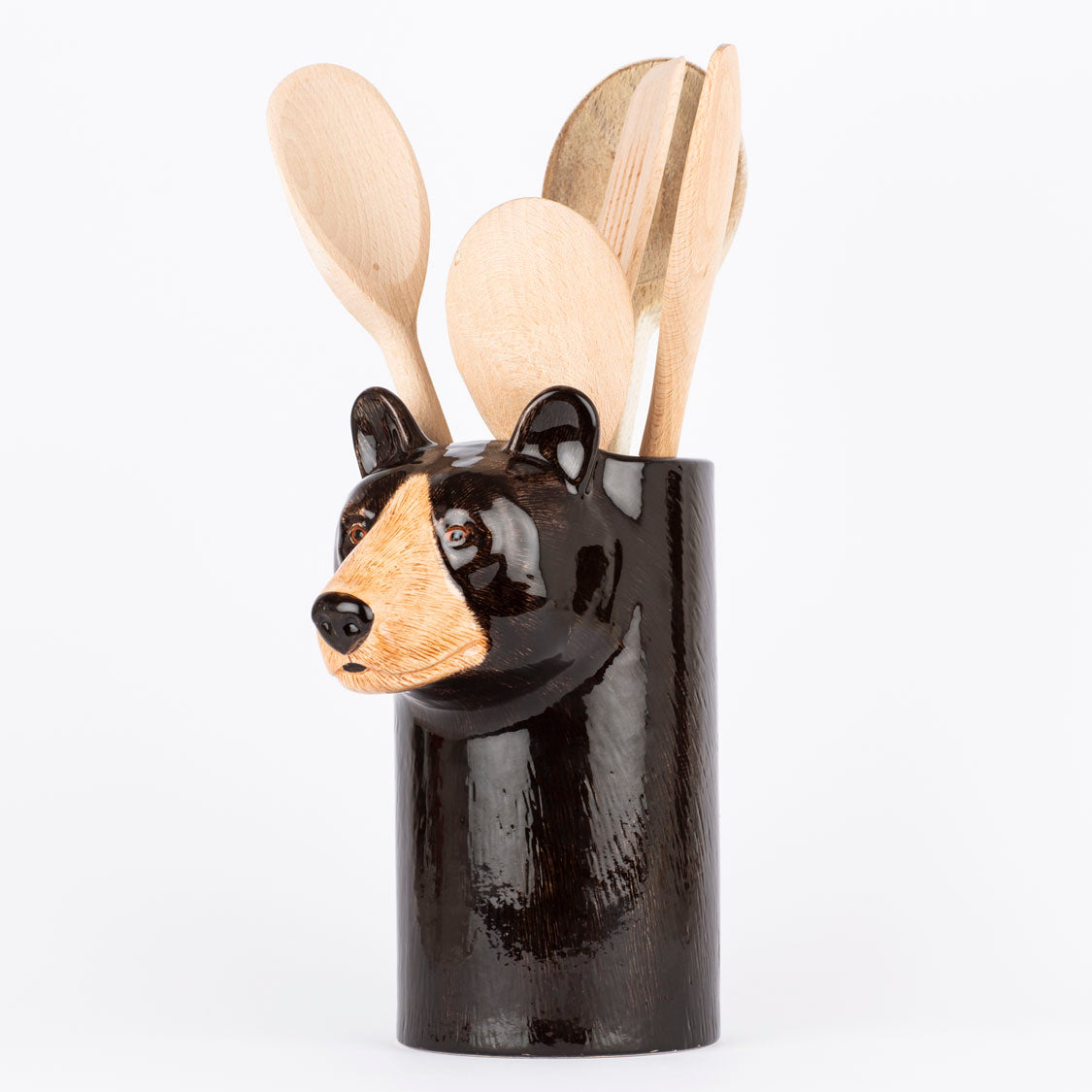 This charming black bear stands ready to corral your kitchen tools with personality. Doubling as a delightful vase or shelf accent, his classic monochrome appearance complements any kitchen style from rustic to contemporary. UK-designed and crafted from hand-painted, dishwasher-safe stoneware, he measures 3.5"W by 7.75"H. Add him to your growing ceramic animal collection for a whimsical touch of the wild in your home!
