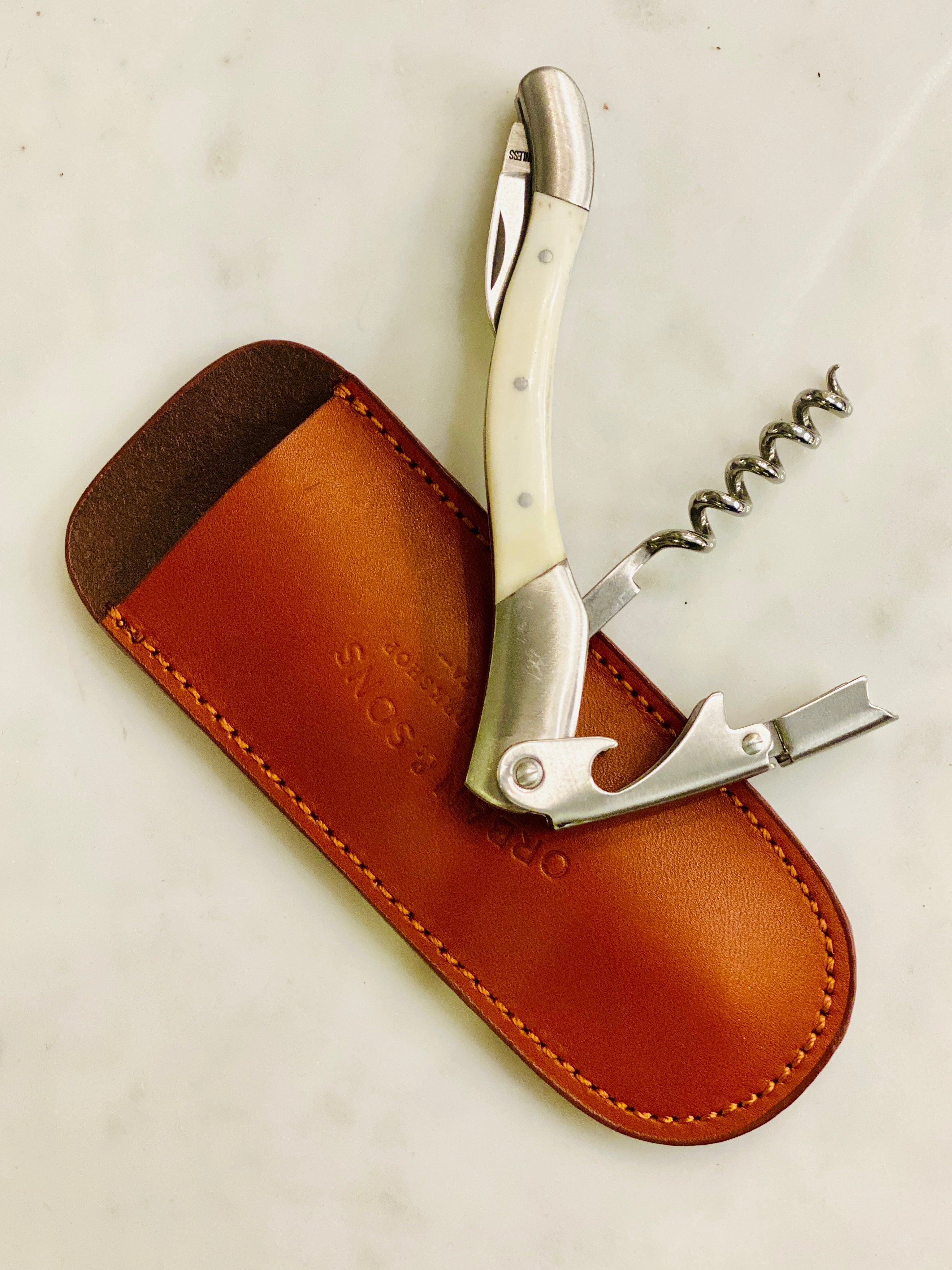 High-quality, double-hinged corkscrew with natural bone handle. This classic style gives the person the greatest amount of control when opening a bottle and extracting the cork cleanly. There is a small blade for removing foil from the wine bottle. 4.75"L x 1"W x .5"H. Comes in a brown leather case.