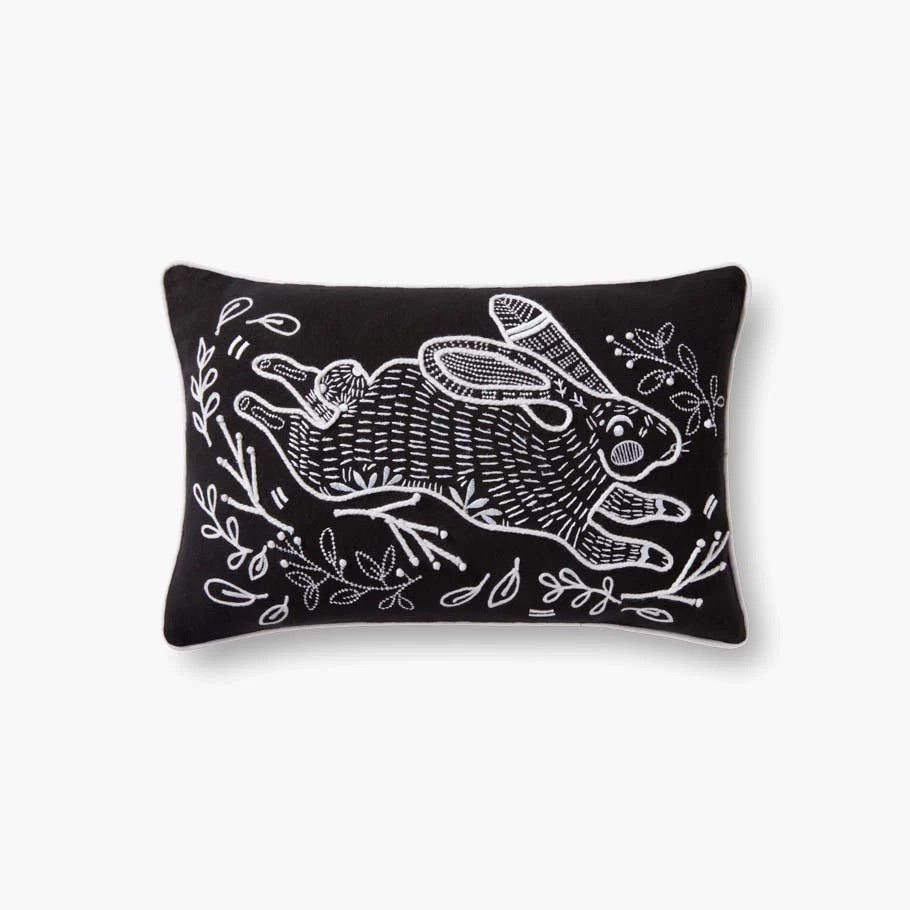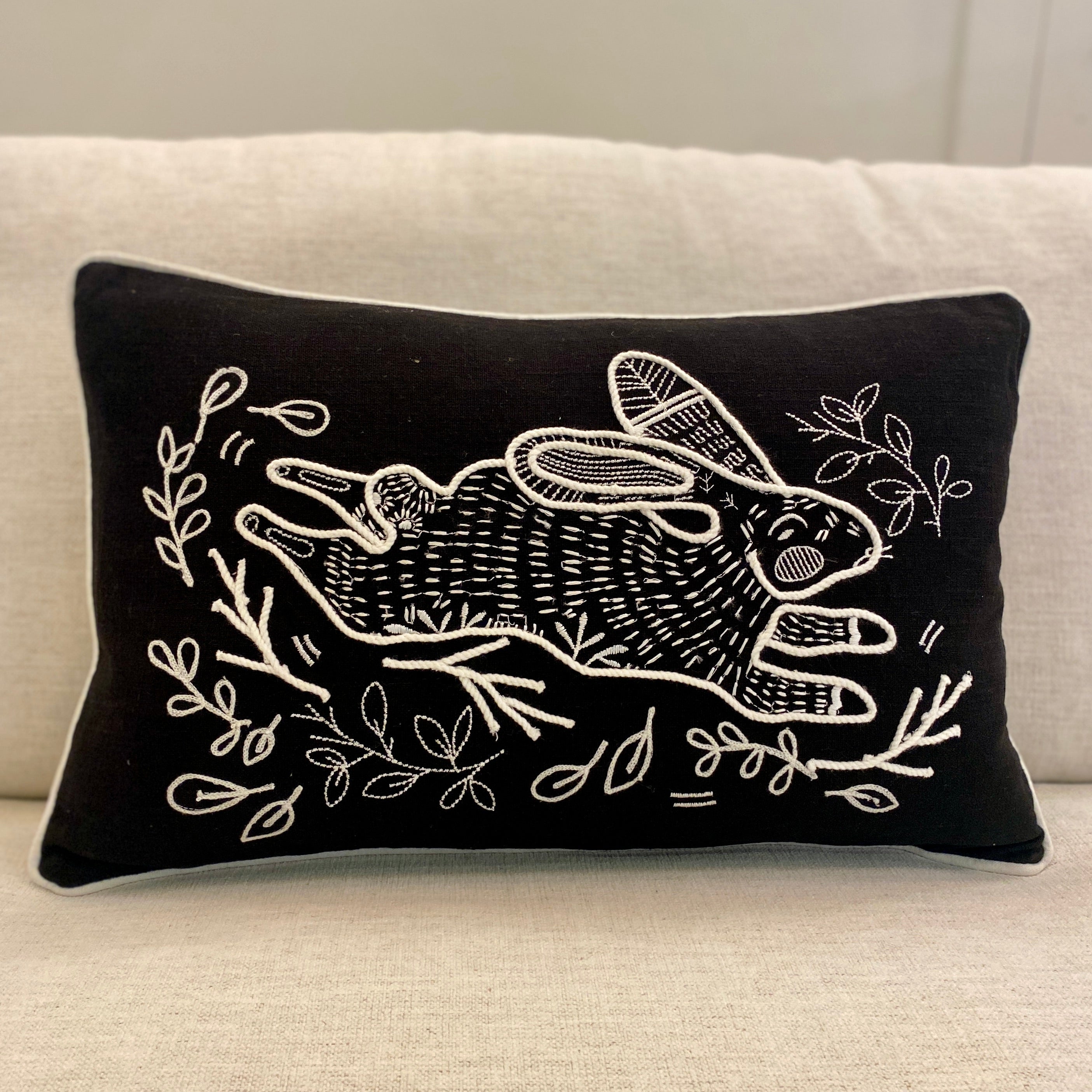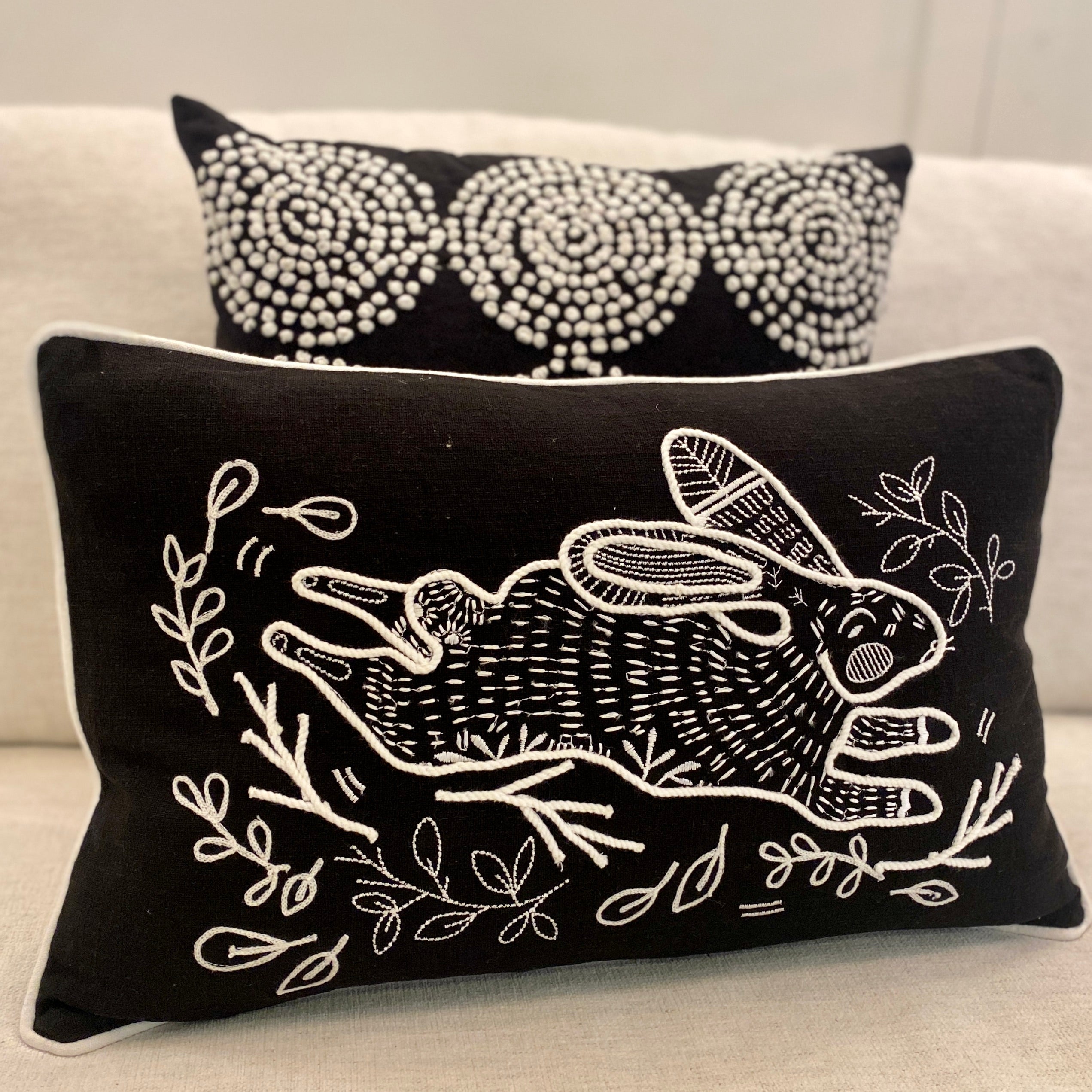 This bunny just wants to play and hop right on a chair, bed or sofa. Layer it with our Pom Pom Flower Pillow for a complete look. You know how much we love crewel and the crewel bunny scene adds extra texture and a whimsical feel. Cover zips off for cleaning. Down-filled insert included. 13"x21". Cotton/Acrylic/Rayon. Hidden zipper and self welt.
