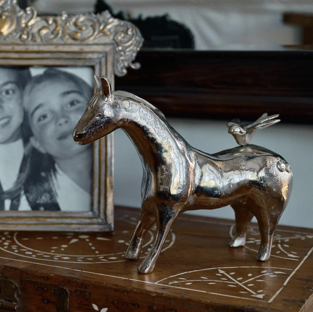 The Caballo Con Golondrina Horse is made from a wax cast from the Jan Barboglio studios. A beautiful nickel horse with a bird perched on it's back is ready to hold all your lucky pennies, hopes and dreams. A gorgeous addition to a bookcase or dresser. The details bring this piece to life. 12"Hx5"Wx13"L