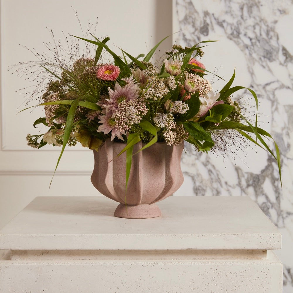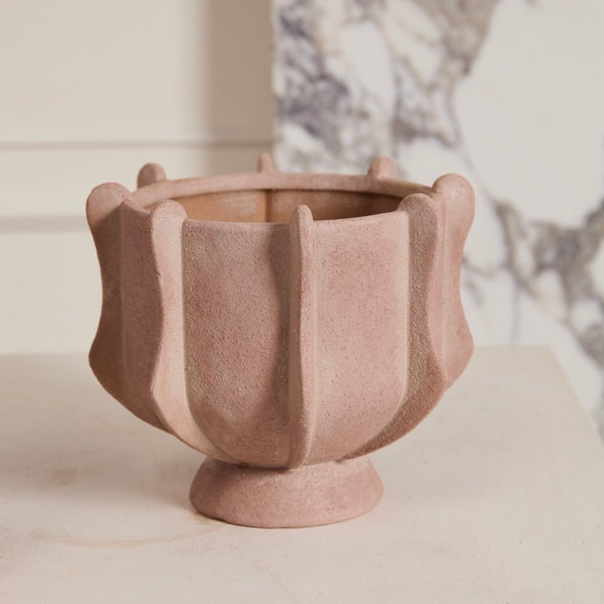 With its dimensional details and matte, textured surface, the Cassidy Compote is the ideal centerpiece for any home. The bowl of this ceramic stoneware vessel is adorned with vertical curvy tabs and a subtle white washed finish over a soft pink base color. The muted hue perfectly complements the unique shape, creating the perfect canvas for a vibrant and eye-catching floral arrangement. Pair with the Claudia Vase to complete the charming display. 7.25"Wx6.25"H