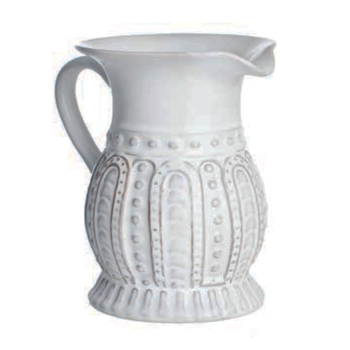 The charm of this ceramic pitcher can hardly be overstated. An intricate lace pattern surrounds the body. A nice vessel for just about anything. Fits in with any kind of table decor and a nice edition to your sideboard, bar or serving table. Made in Portugal. 7.25"Wx5.5'Lx7.5"H, 32 oz capacity.