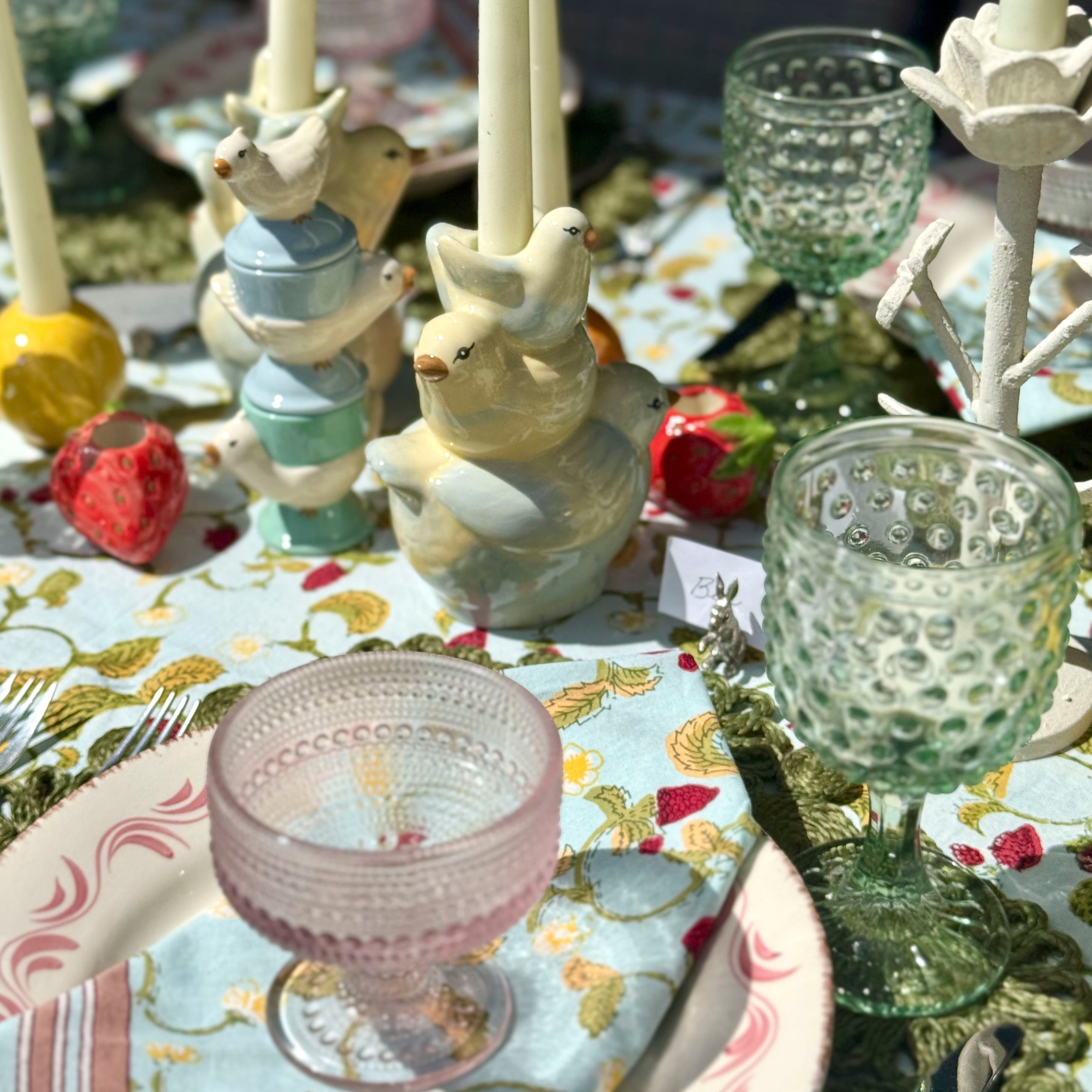 This Egg Cup Set is perfect for the breakfast table, as the chicken and egg happily coexist in hand painted ceramic form. The cups are stackable and boast a charming personality and vintage aesthetic. Measuring 3.25 inches in width and 7.25 inches in height.