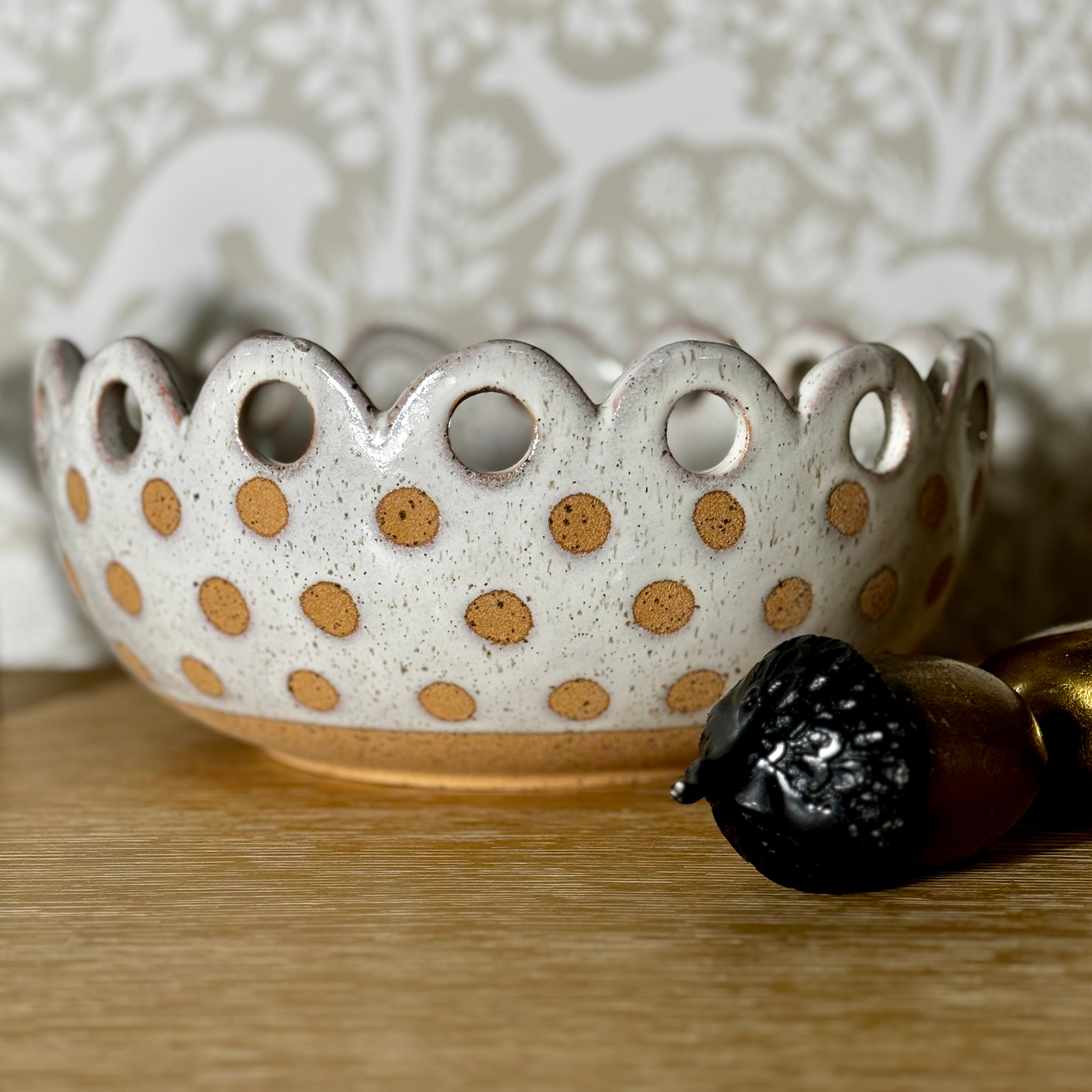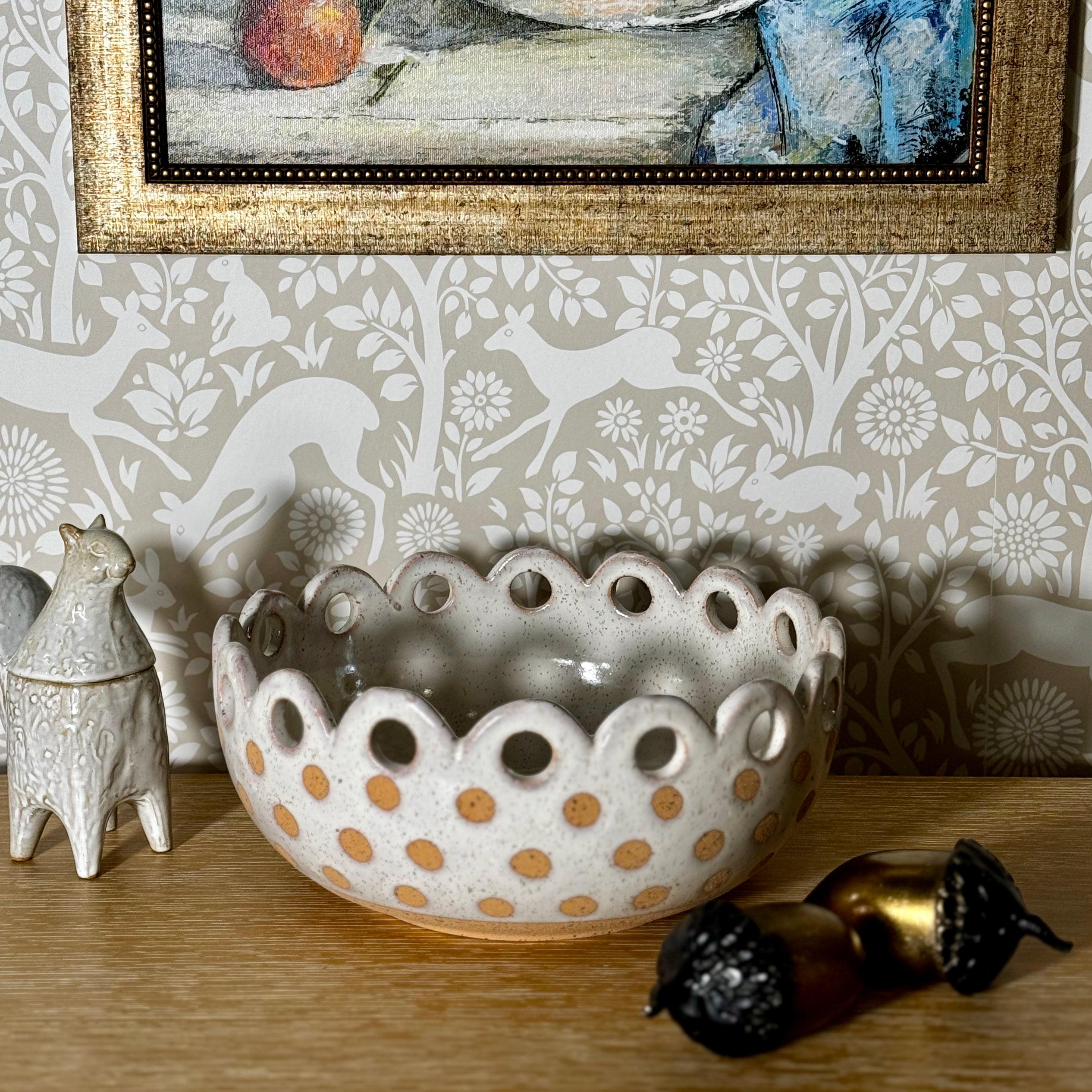 Transform your decor with our Dottie Bowl - a food-safe, textured ceramic delight that boasts a scalloped rim with unique cut-out holes on top, accentuated by a white reactive glaze on a warm bisque base. The natural bisque dots add a playful touch, perfect for serving food or displaying plants. This sophisticated piece is a must-have for spring and beyond. 10.5"Wx4.75"H
