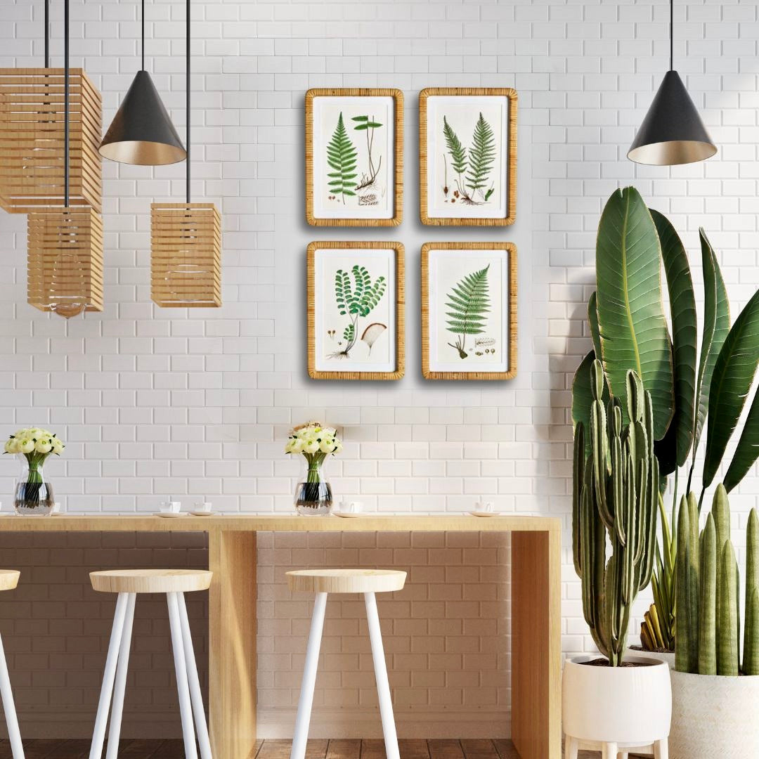 This exquisite quartet of traditional forest fern illustrations is the perfect accompaniment to any home office, hallway, or entrance way. Smartly complemented by a pristine white mat and rattan-wrapped frame, they bring a hint of the natural world into your home.Interior use only. Dust with dry cloth. -Includes mat; -Rattan wrapped frame 17.75"Hx12.5"Wx1"D