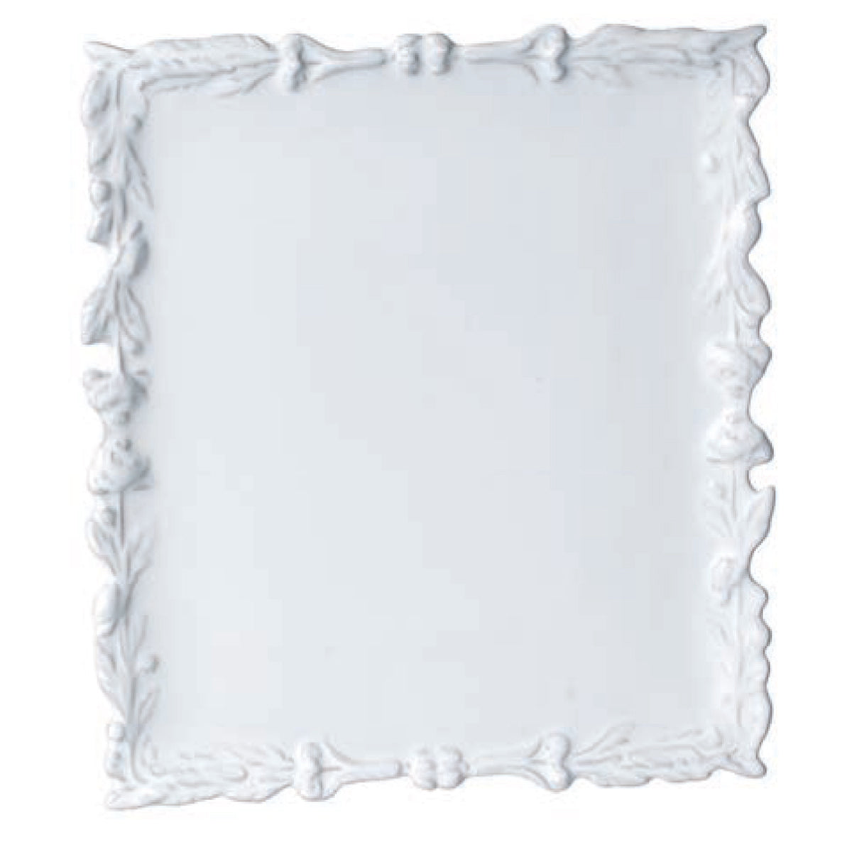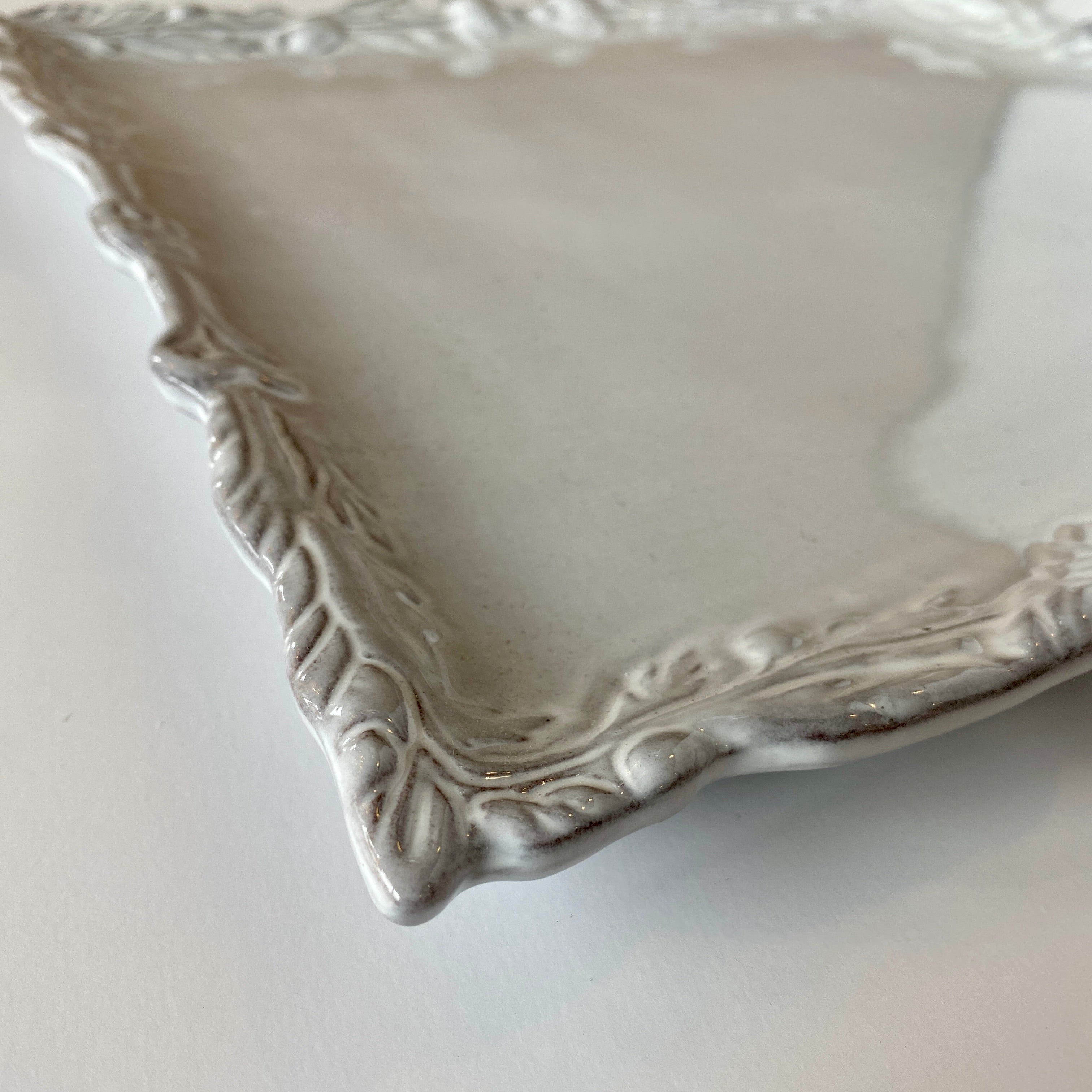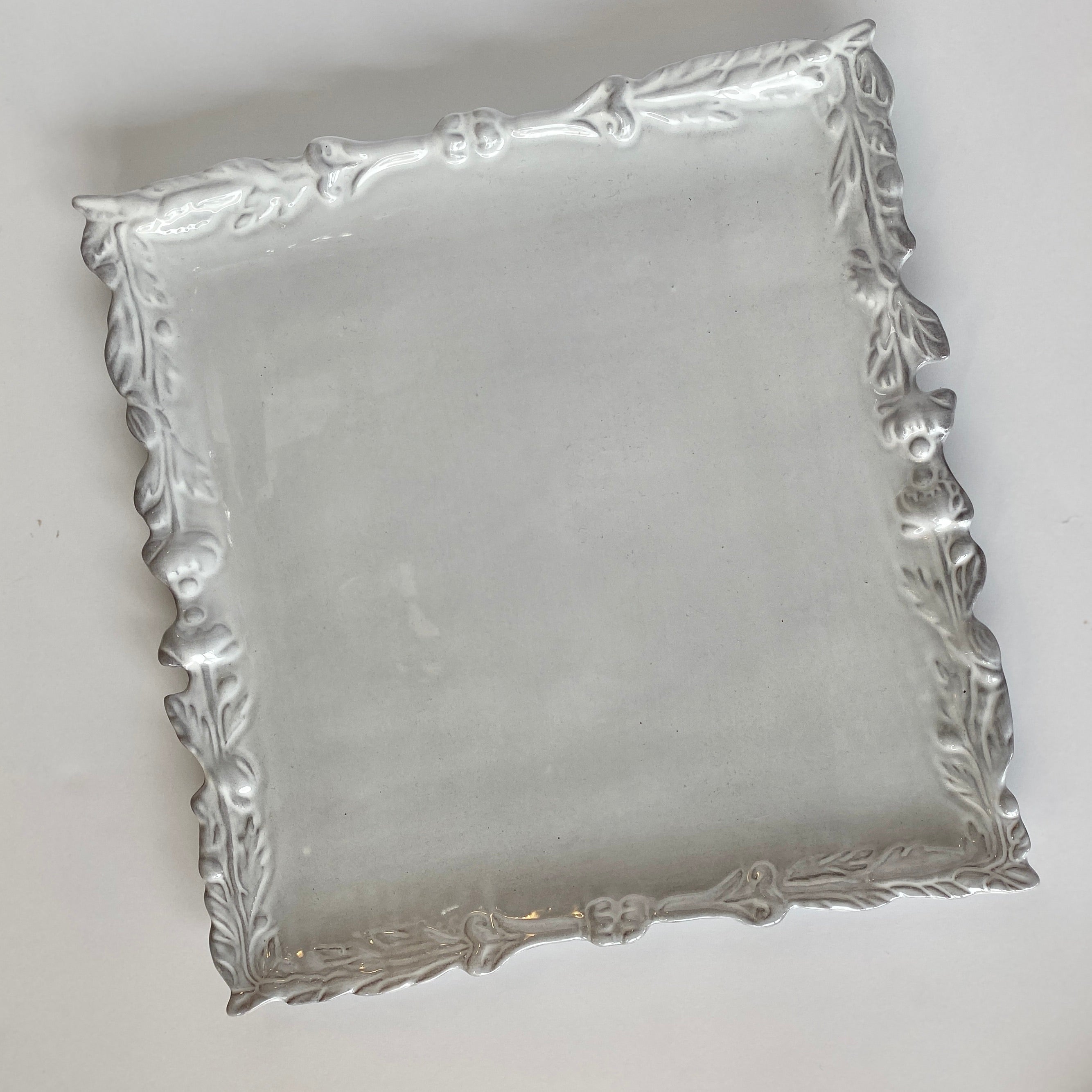This outstanding square ceramic charger makes one of the most handsome tables around. A detailed rim of subtle foliage and flowers surround the edges. Beautiful white washed glazed finish. This beautiful design works well with so many plate patterns and makes for a practical placemat for everyday use. Consider using as a serving tray for cheeses or pastries. 13"Wx13"L