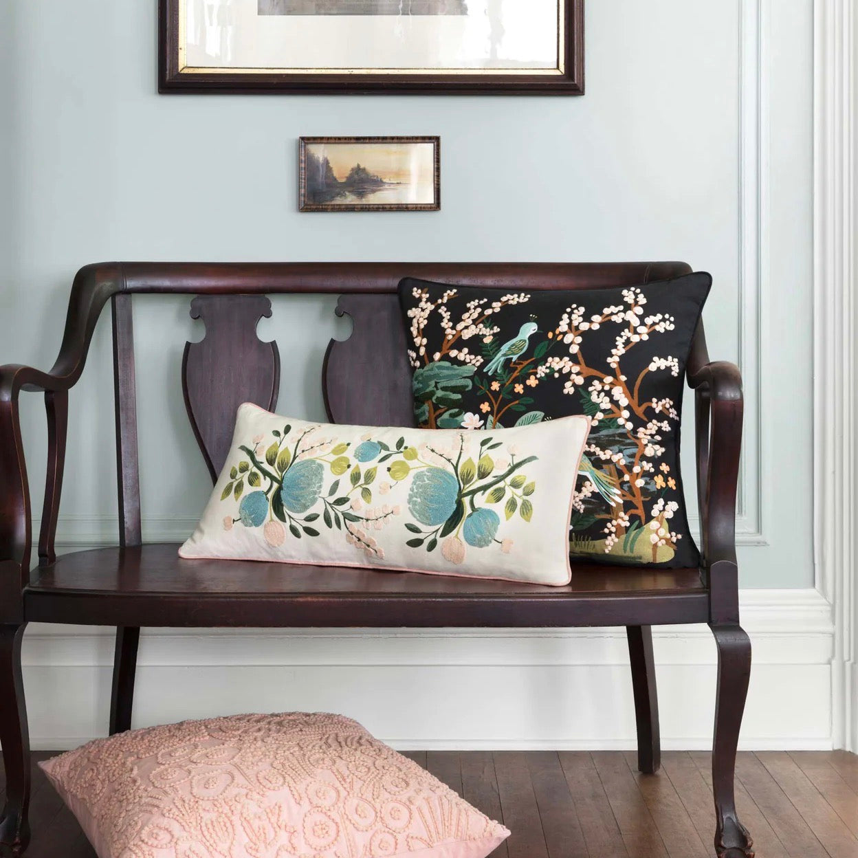 Bring a timeless charm to your living space with the Floral Spice Lumbar from Rifle Paper Co. This classic pillow features a beautiful floral pattern with rich colors and piped in a light linen blush, ideal for adding a gentle and calming atmosphere to any room. The perfect accent piece for a traditional and sophisticated design. Cover zips off for cleaning. Down-filled insert included. Made in India. Blended varieties of materials. Spot clean. 12"x27"