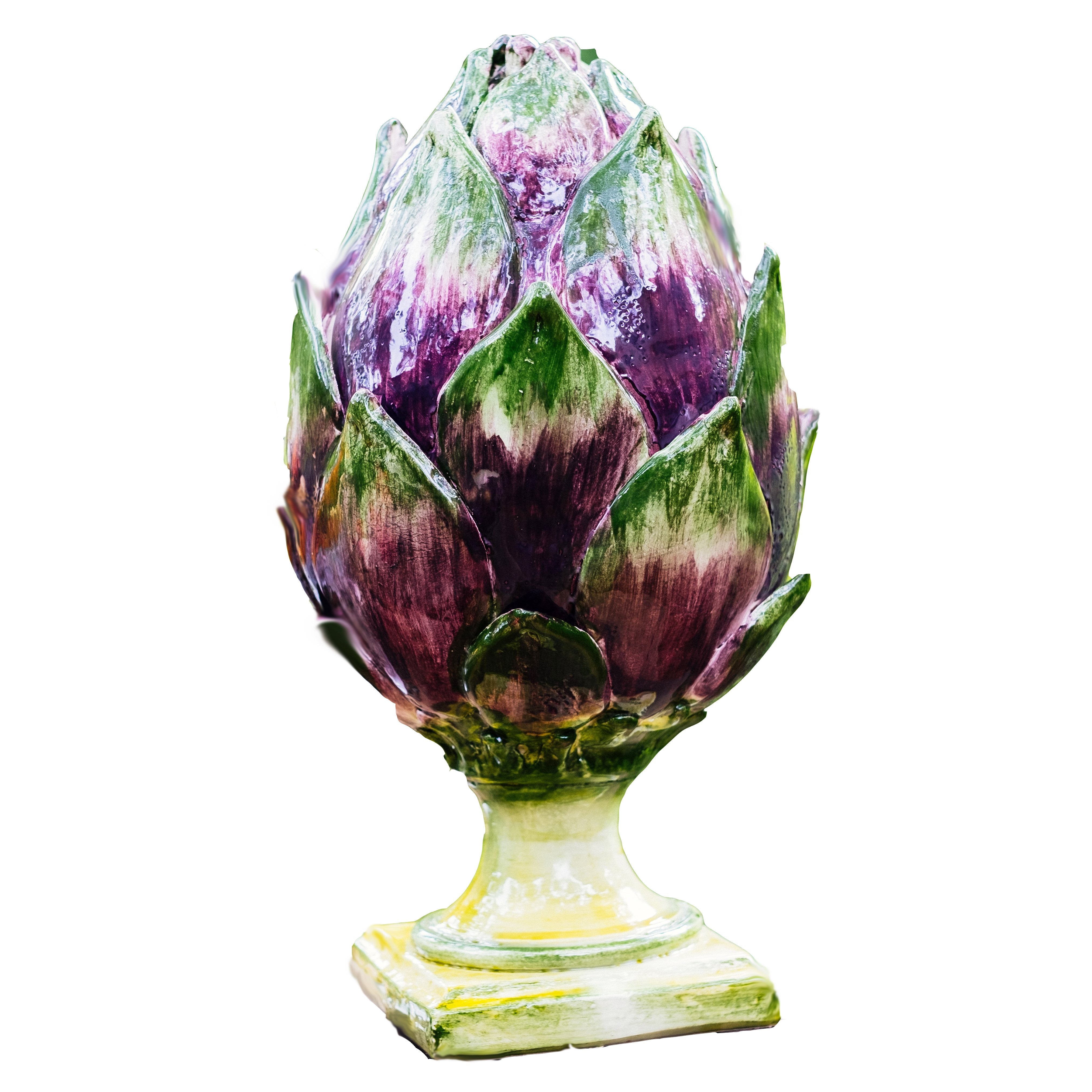In nature, an artichoke is a beautiful sculptural entity. Handmade in Italy, this ceramic piece looks lovely in any garden setting. Rich in colors and classic traditional shape, pair two finials on either side of a console or dining table. 10"Wx17"H