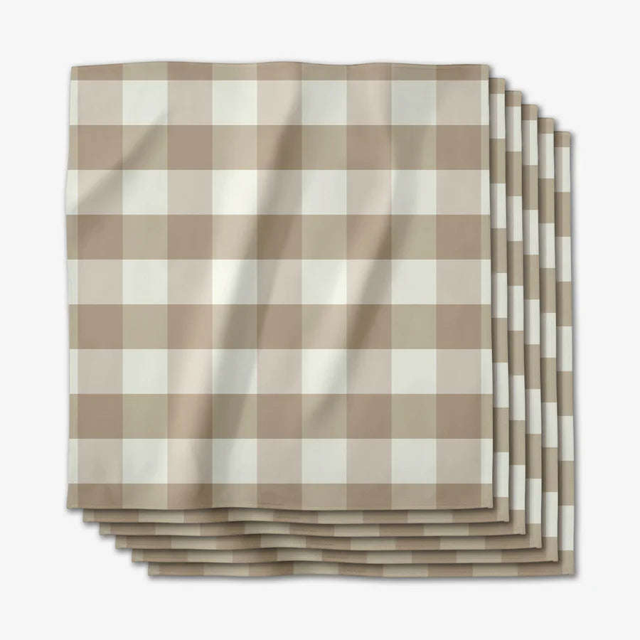 These Gingham Cottage Dinner Napkins bring the charming vibe of the countryside into your own dining room. Plus, their tan and white color combo is the epitome of classic taste! You'll want to don these dapper napkins any night you're feeling extra fancy. Dance around the dinner table knowing these napkins hold up to 7x its weight! Saving the planet using cloth napkins and less paper and looking good doing it! They wash great and come out of the dryer looking new! Set of 6, 19x19, single sided print.