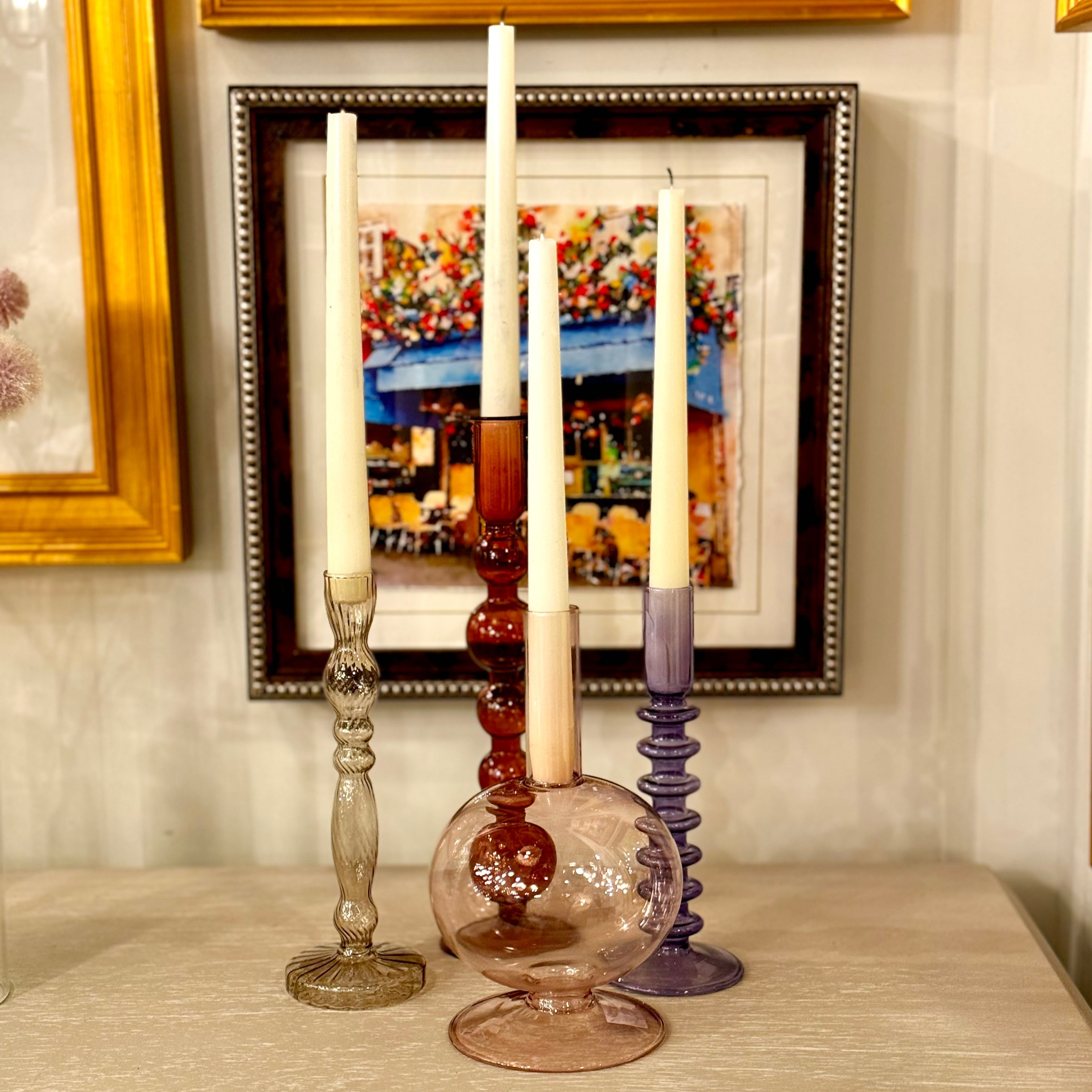 Experience timeless elegance and refined sophistication with the Glass Spool Candleholder in a muted violet hue. Designed for a standard taper candle and lightweight for easy display, this piece exudes uncommon elegance. Pair it with our other colored glass candlesticks for a truly tasteful display. 2.75"Wx7.75"H