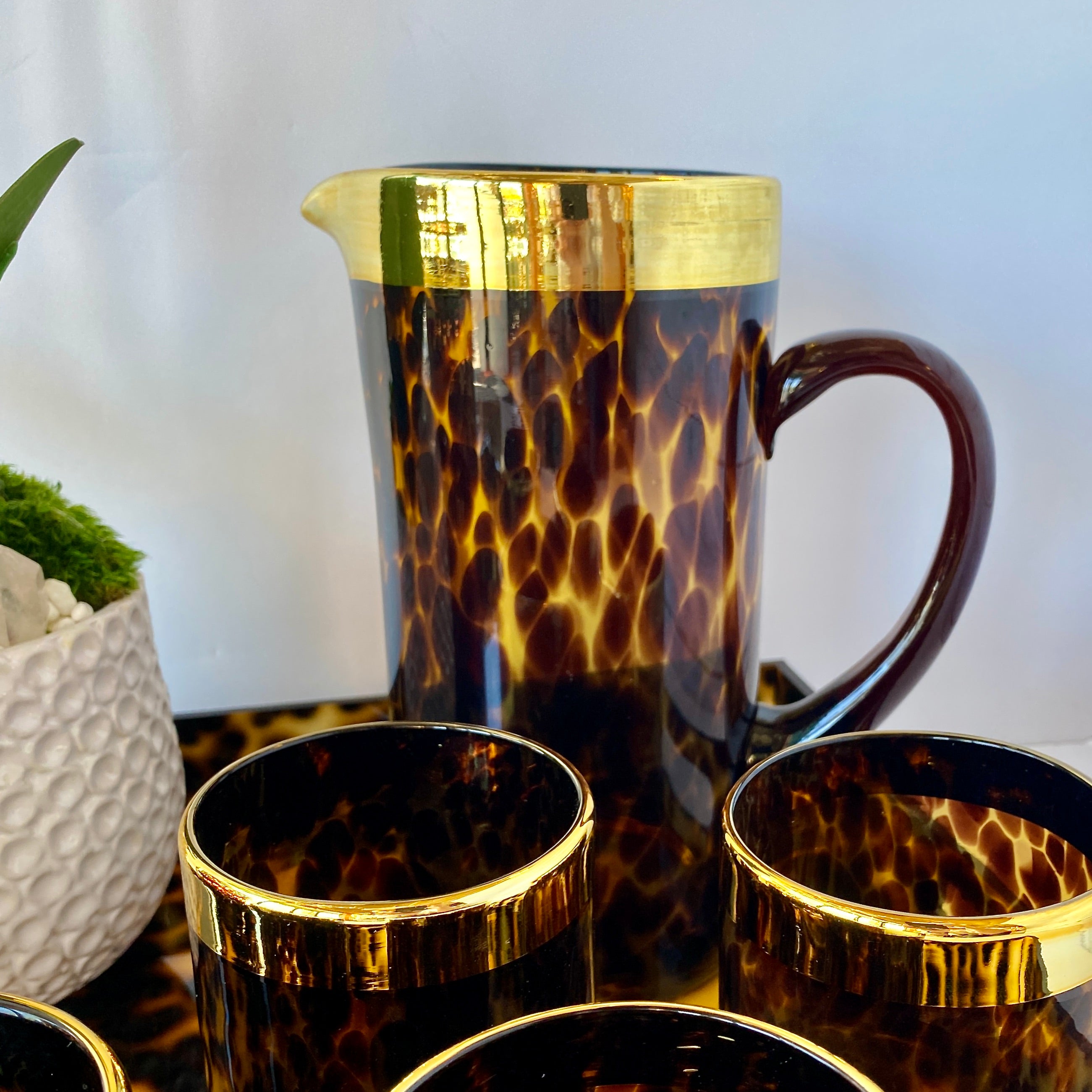 Experience the height of sophistication with the new Tortoise and Gold grouping featuring classic, elegant pieces in dappled amber and chocolate tones finished off with a brilliant gold border. Handcrafted and unique, these pieces are sure to impress. Combine with other tortoiseshell acrylic pieces for a truly extraordinary look. This Glass Tortoise and Gold Pitcher boasts a gracefully curved handle that will bring sophistication to any setting. Handwash. 5"Wx5"Dx9"H