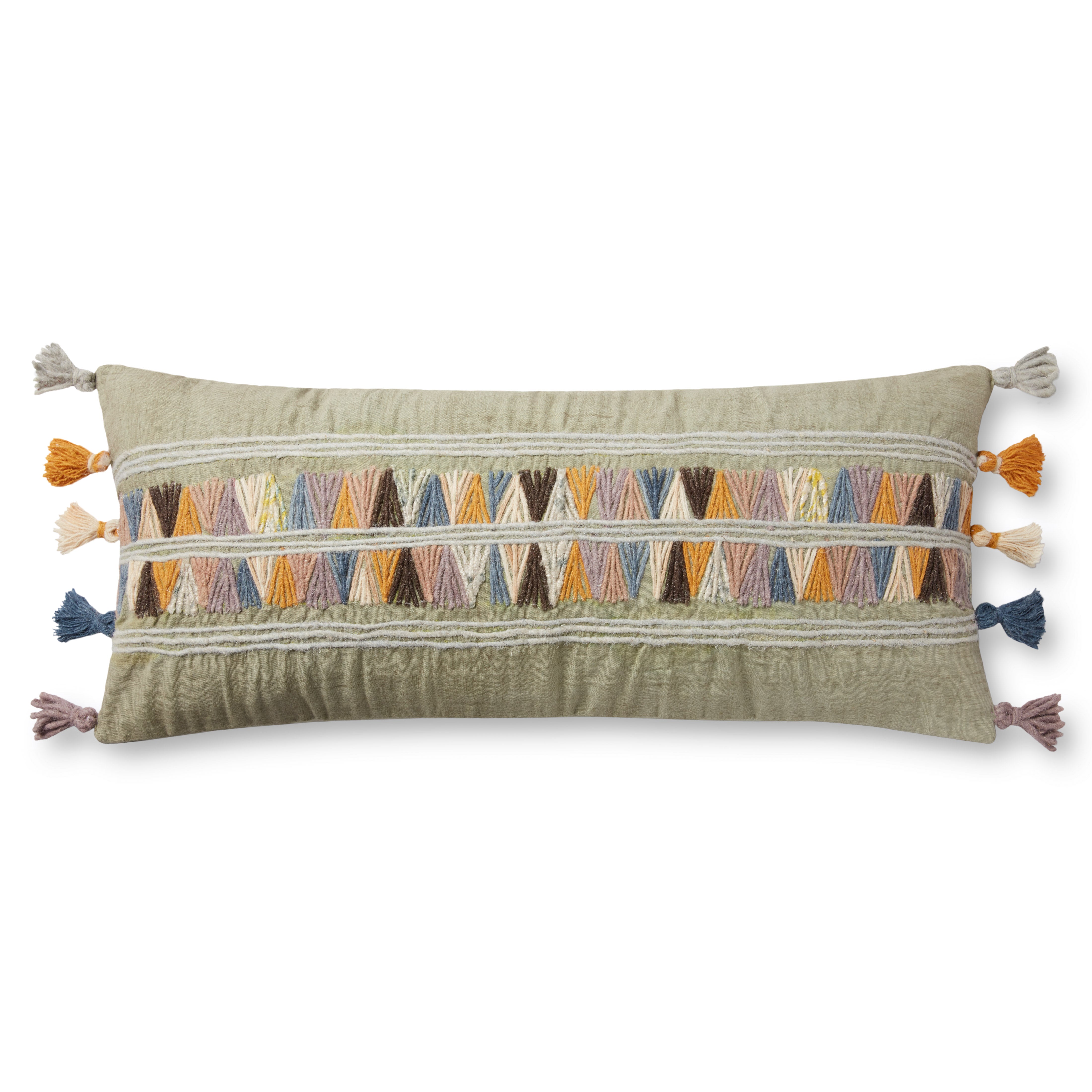 Earth tone yarns create a geometric pattern across the front of this lumbar pillow. The natural background and tassels add an ethnic detail to the overall style. By itself or grouped with several other pillows, the size is perfect. Cover zips off for cleaning. Down-filled insert included.