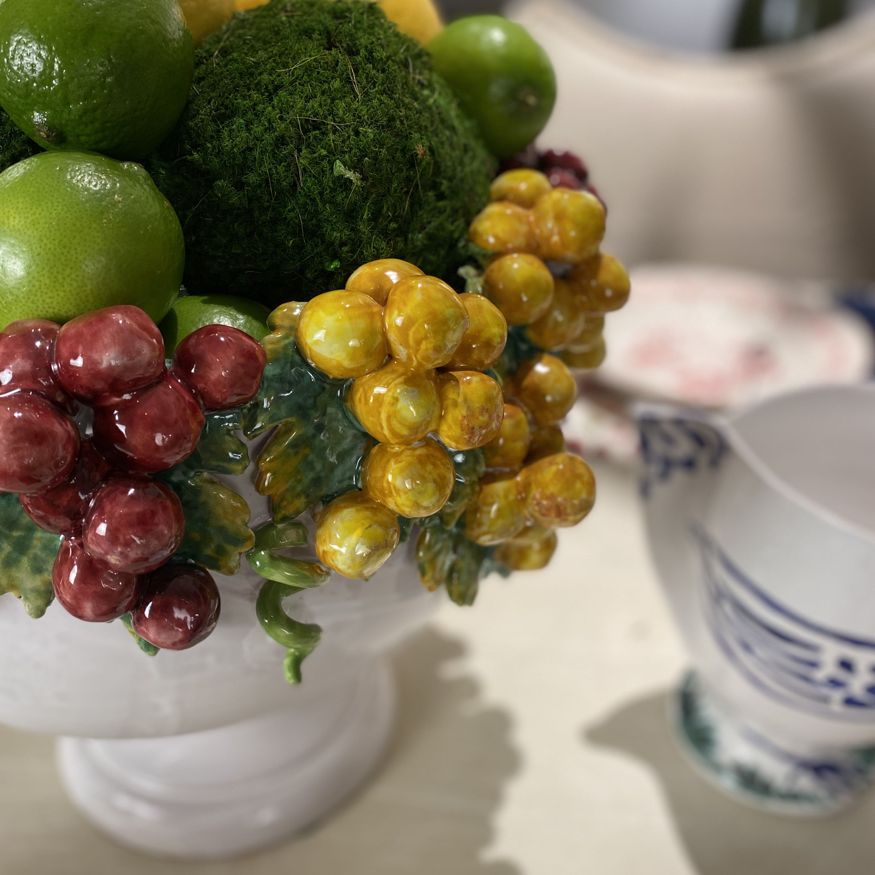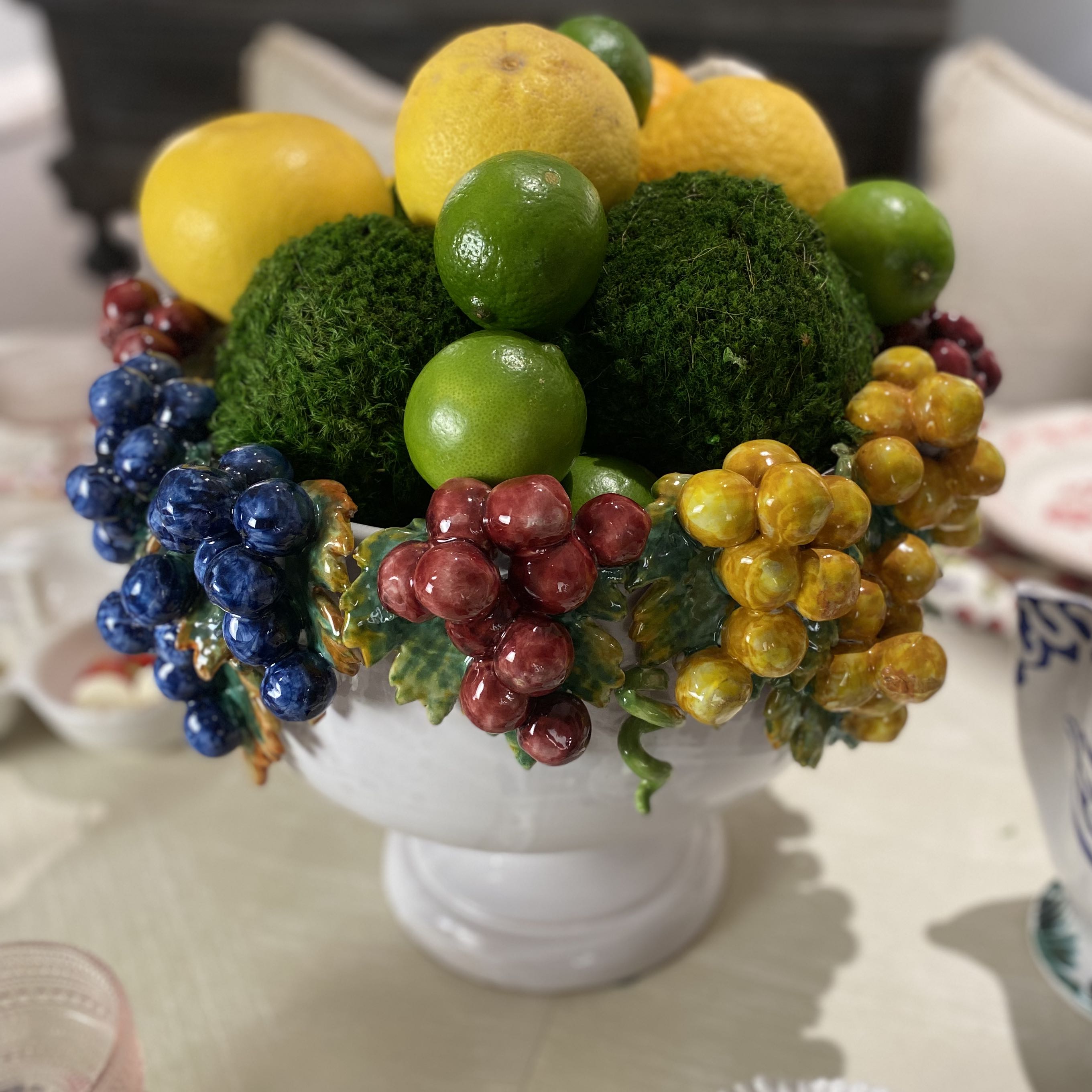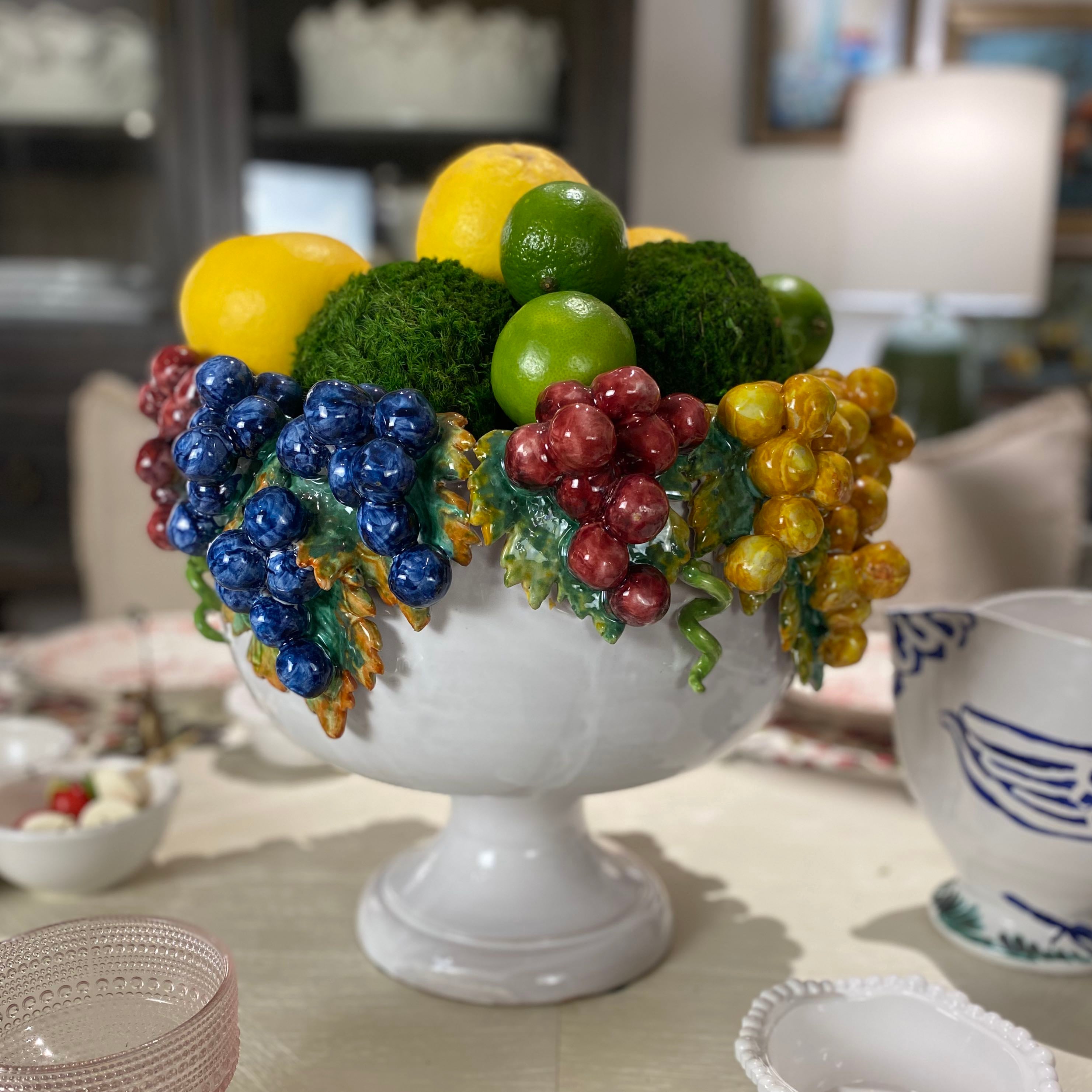 You don't have to travel to Italy to acquire the gorgeous craftsmanship of their ceramics. The classic Italian footed ceramic compote bowl is stunning piece for a floral arrangement, wine cooler or just stand a lone as a centerpiece. The glazed ceramic bowl is decorated with hand-crafted grapes and leaves. Handmade in Italy 16"Wx11"H