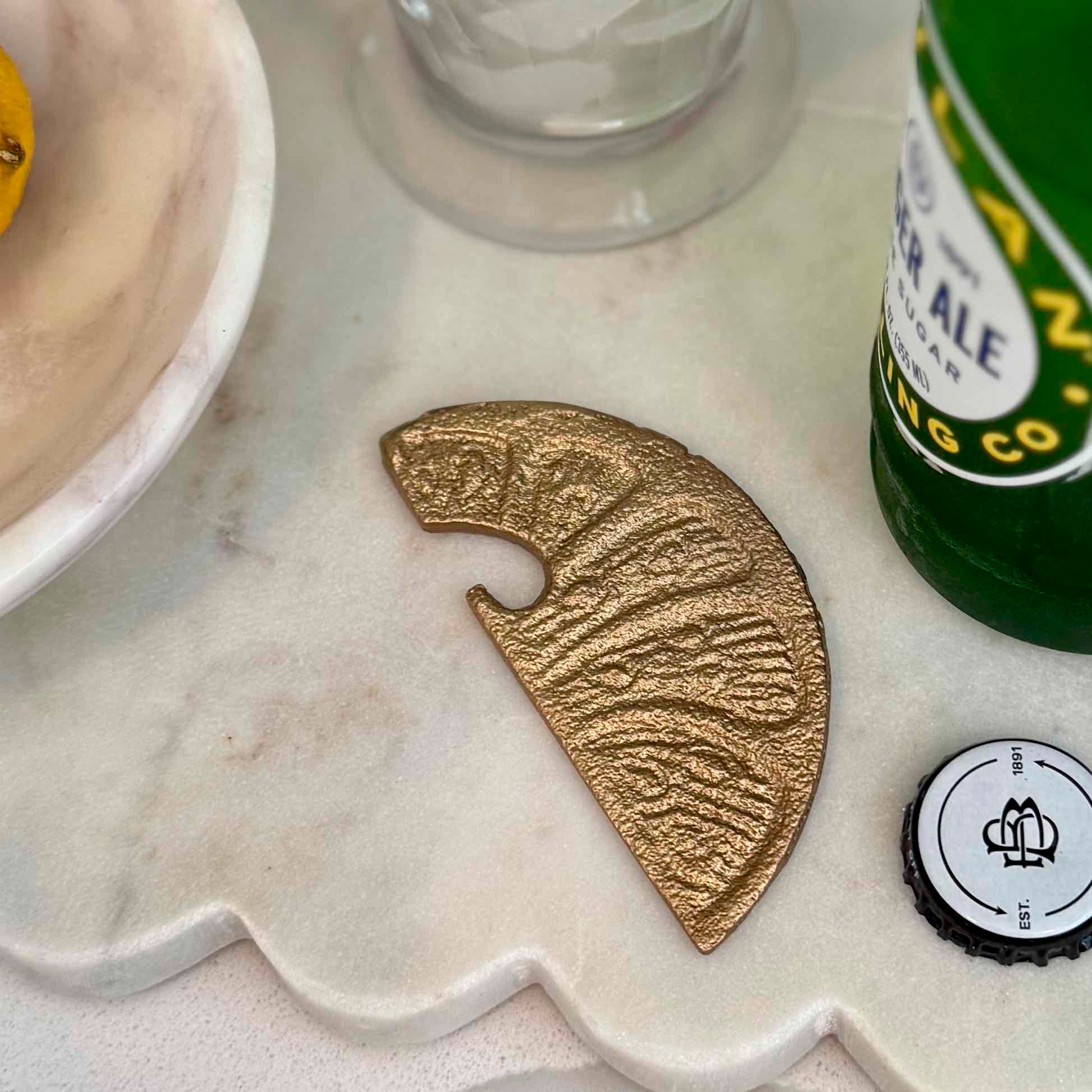 Add a zesty twist to your bar with this adorable lemon slice bottle opener. Compact and easy to toss into your cooler or picnic basket, it’s perfect for opening drinks wherever you go. Such a charming little gift! Pair it with our Lemon Love cocktail napkins for a fun and unique present. Measuring 3.25"L by 1.5"H, this metal bottle opener features a vintage gold finish in the shape of a lemon slice.