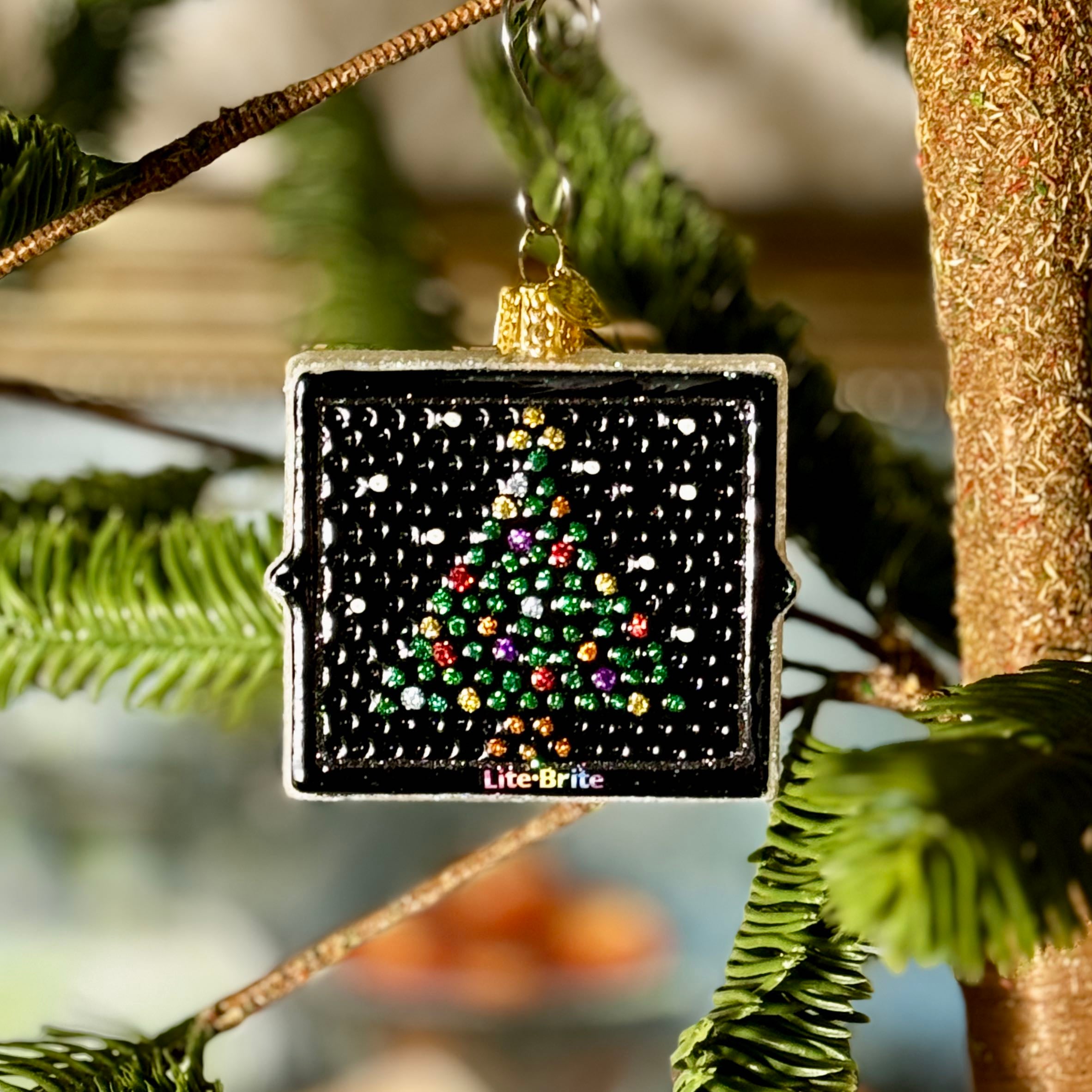 Relive the magical memories of creating Lite Brite-style art with this hand-crafted glass ornament. Like a neon sign, it lights up with customizable designs made from colorful pegs and templates. Children have happily received Lite Brite from Santa since 1967. 2"H