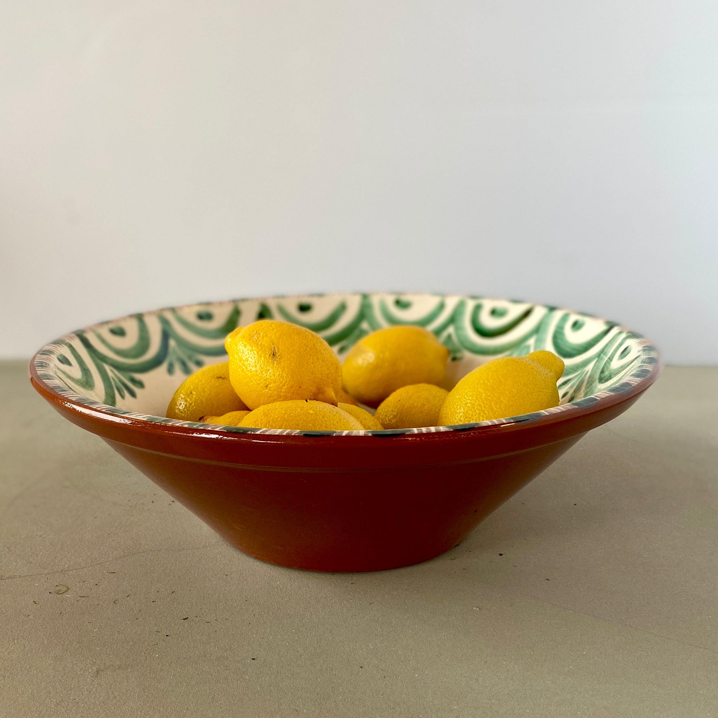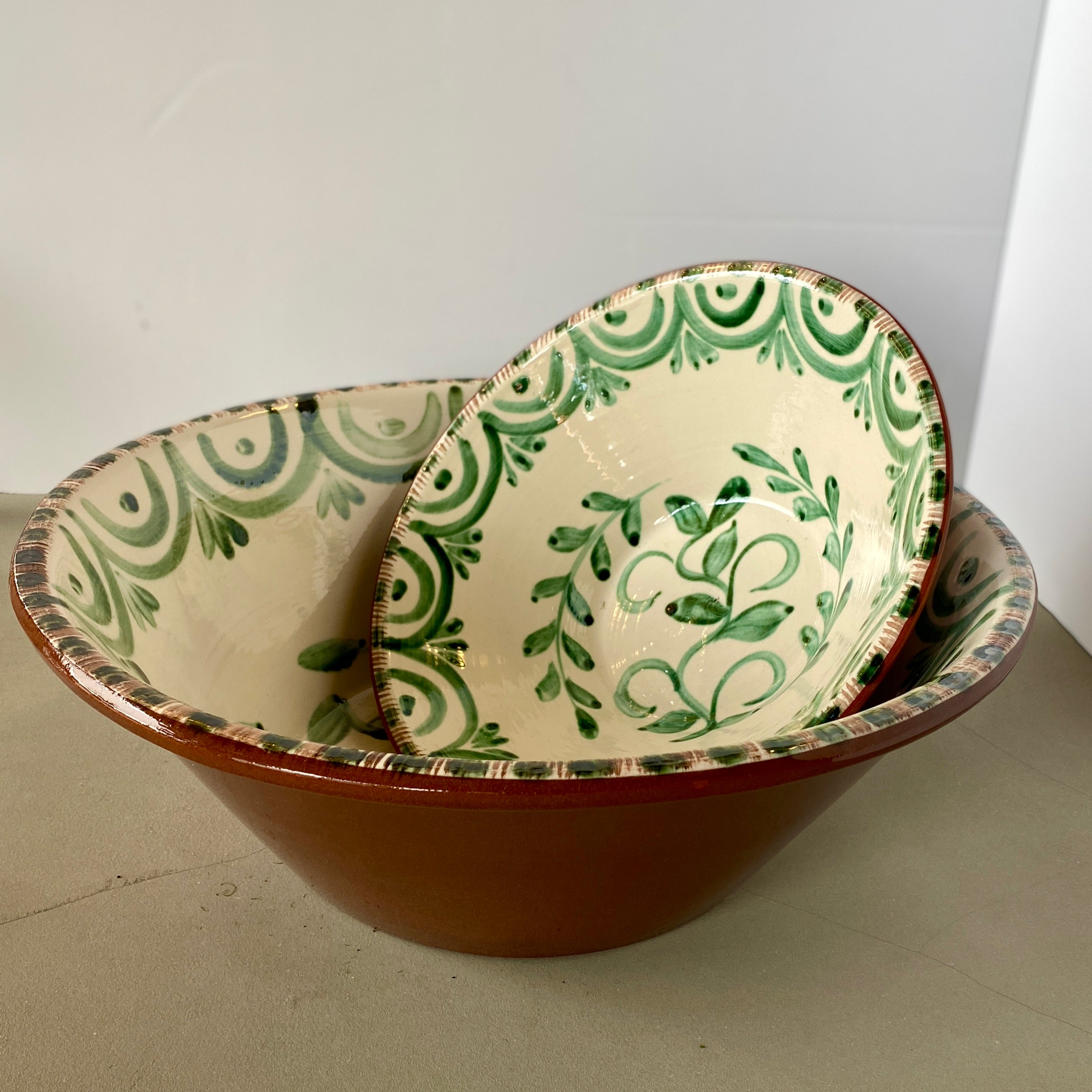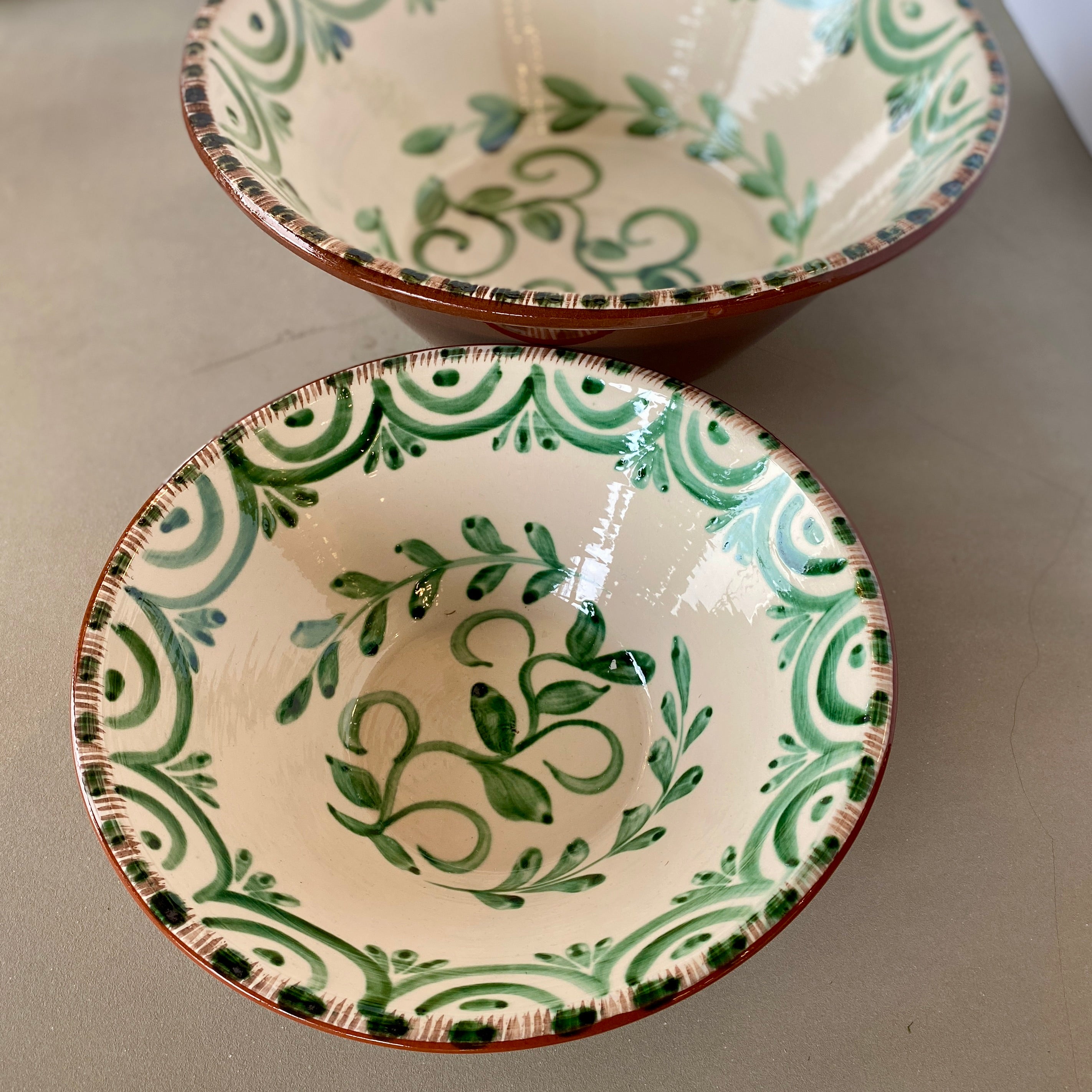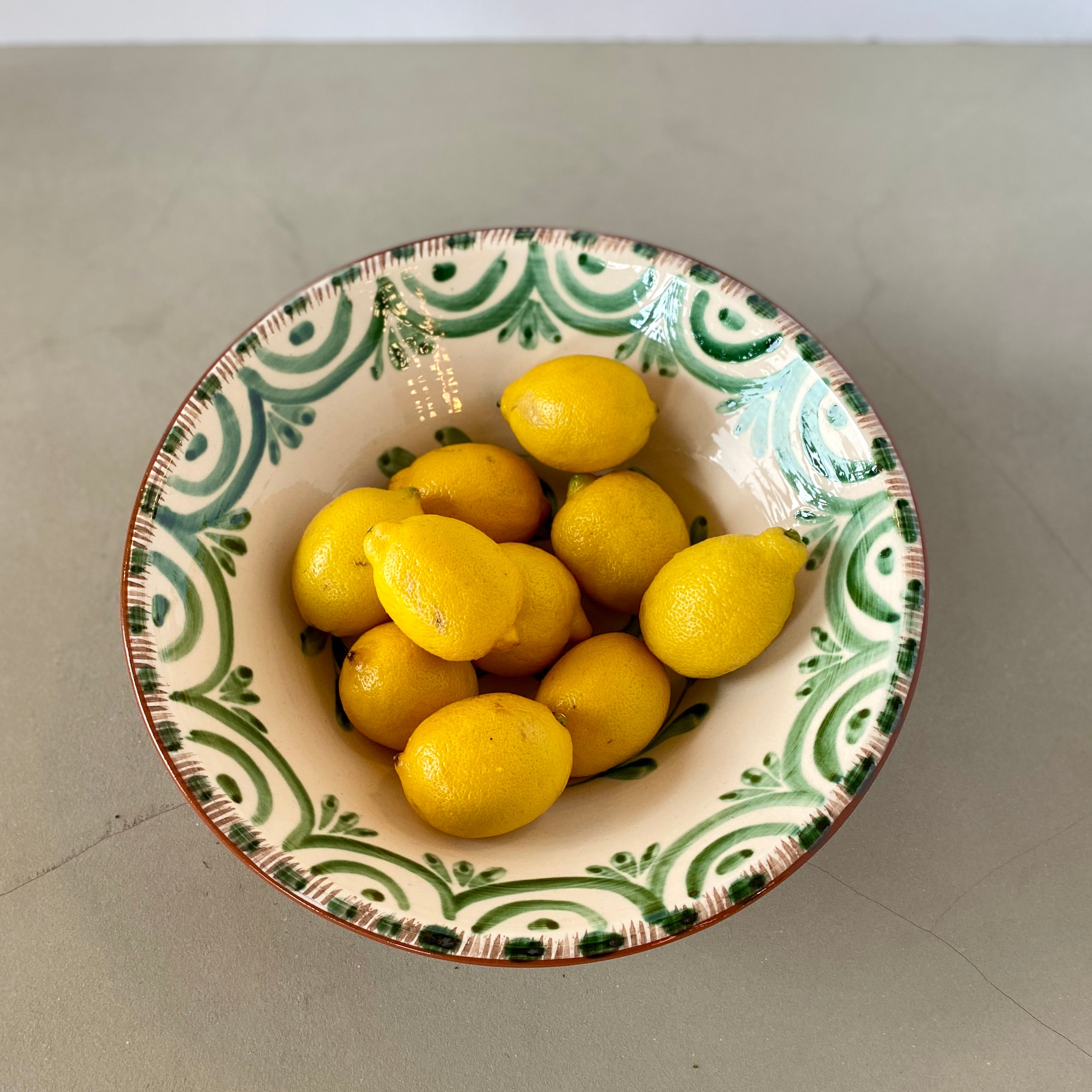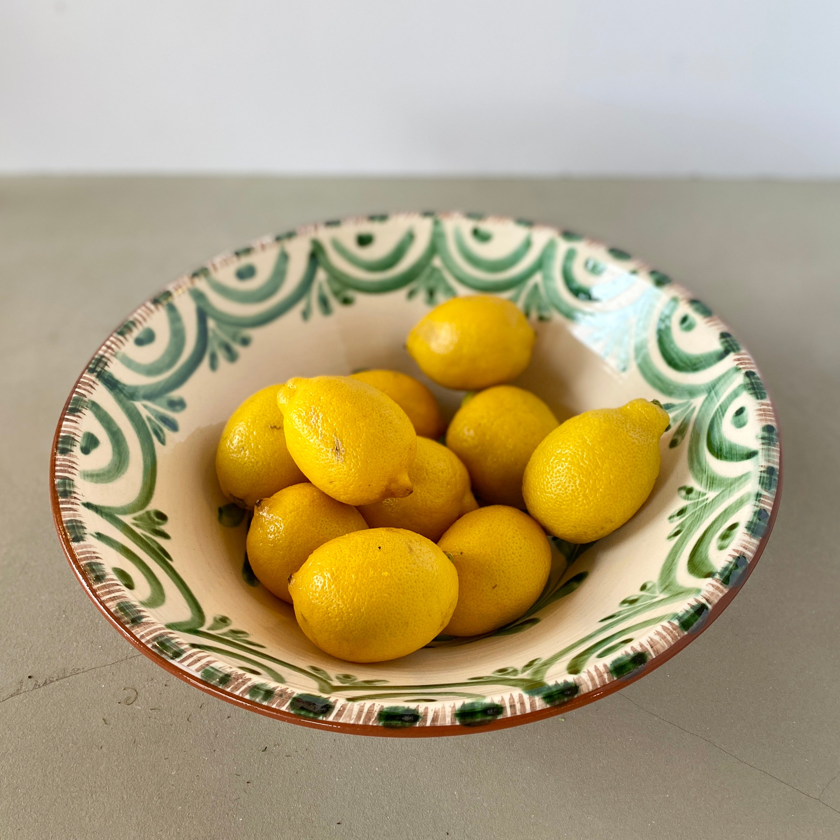 A new take on an old tradition. We are excited about the Luzia Collection of hand-painted dishes. The hand-painted bowls are influenced by the beautiful antique Portuguese and Spanish Talevera. The green and white colors add to the charming floral designs. Microwave and Dishwasher Safe. Made in Portugal. 12.75"Wx4"H
