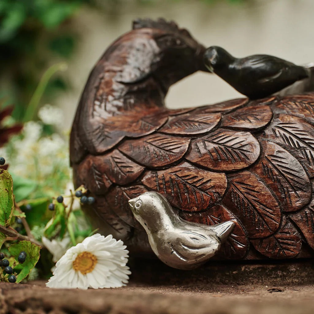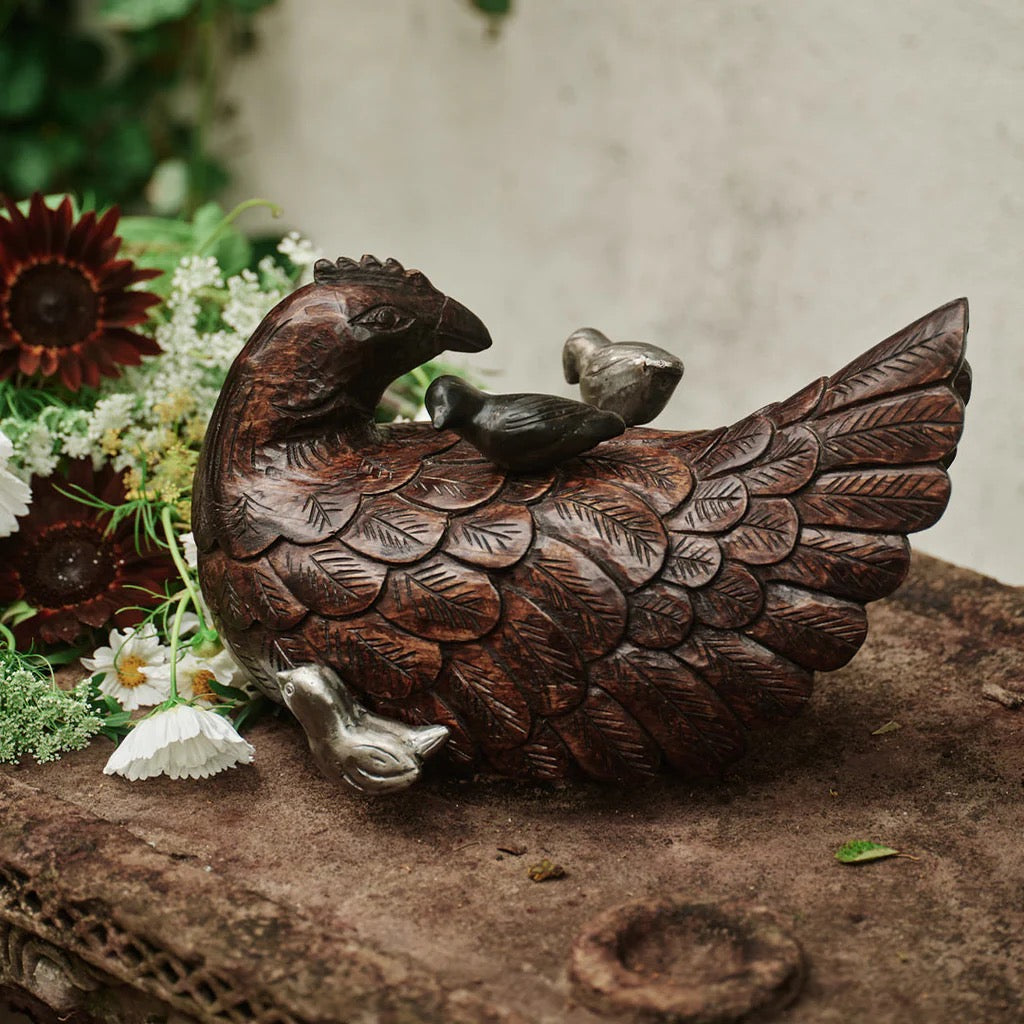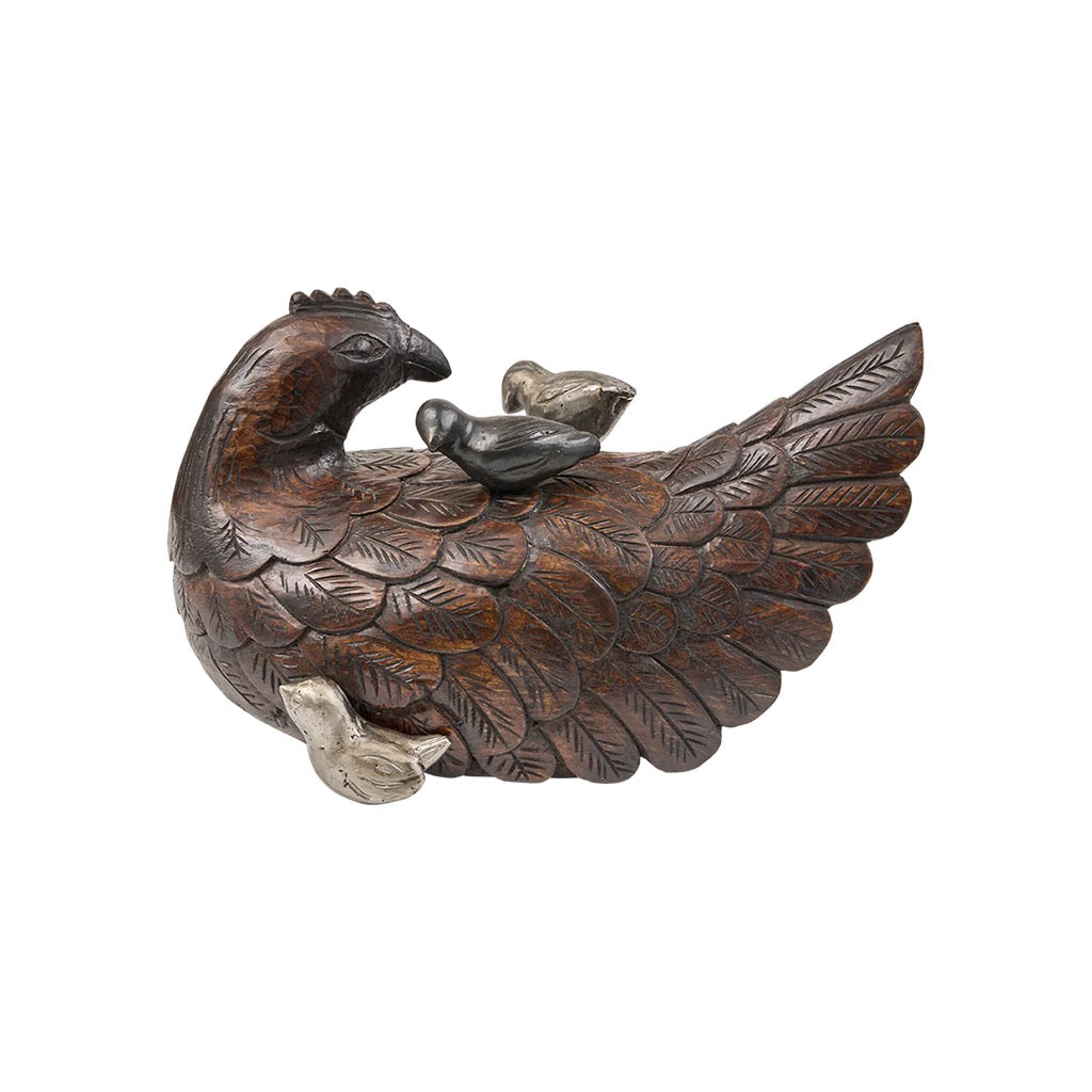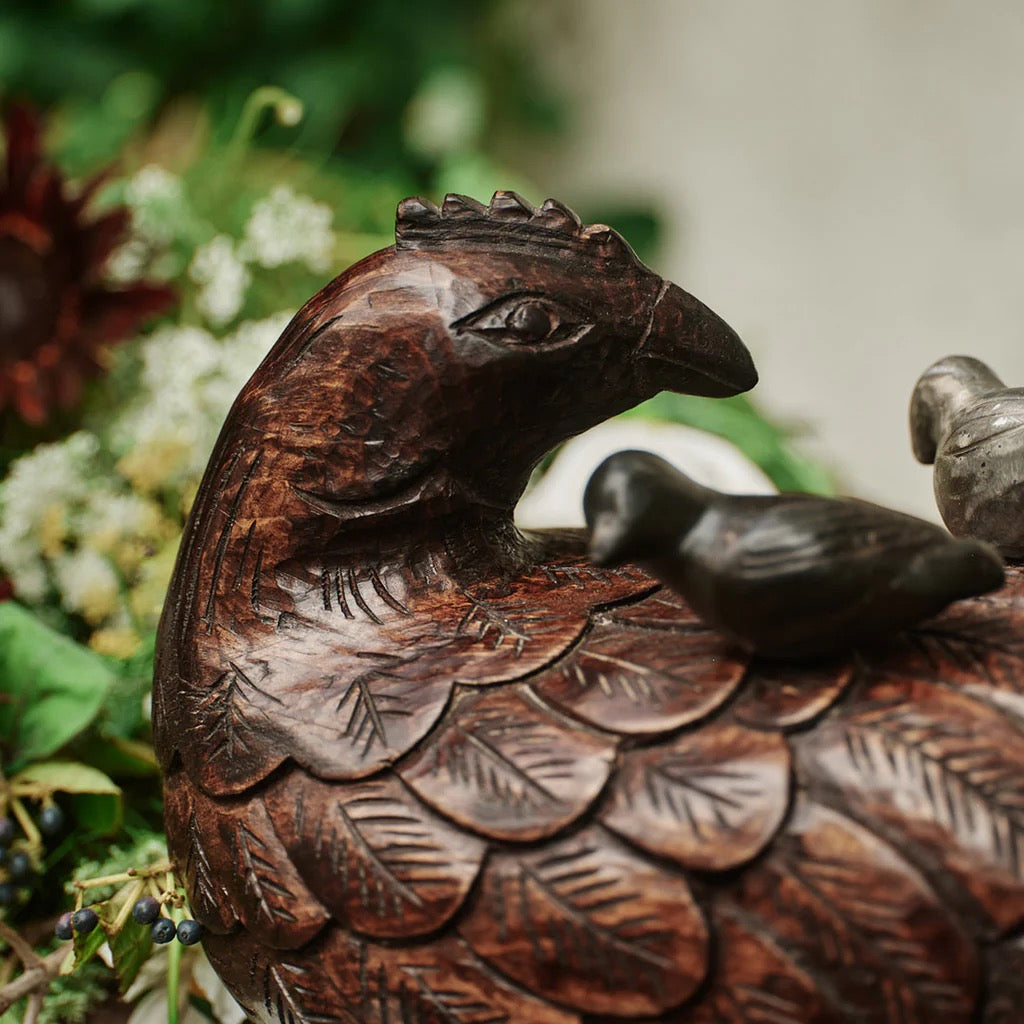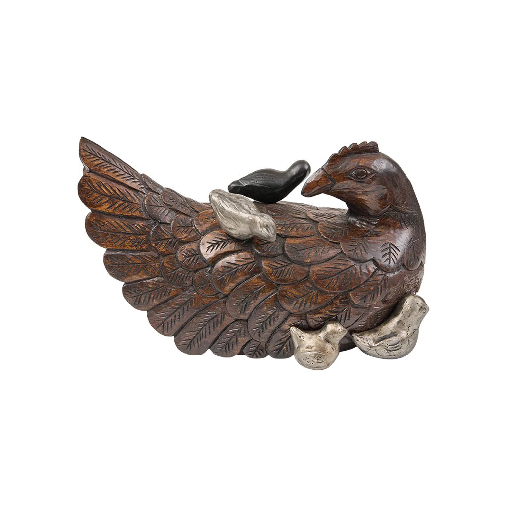 Elegantly crafted wooden mother hen accompanied by cast iron baby chicks from the renowned Jan Barboglio studio. A must-have for any avid collector. Each piece is uniquely individual, showcasing stunning detail and exquisite craftsmanship. 8"wx14"Lx8"H.