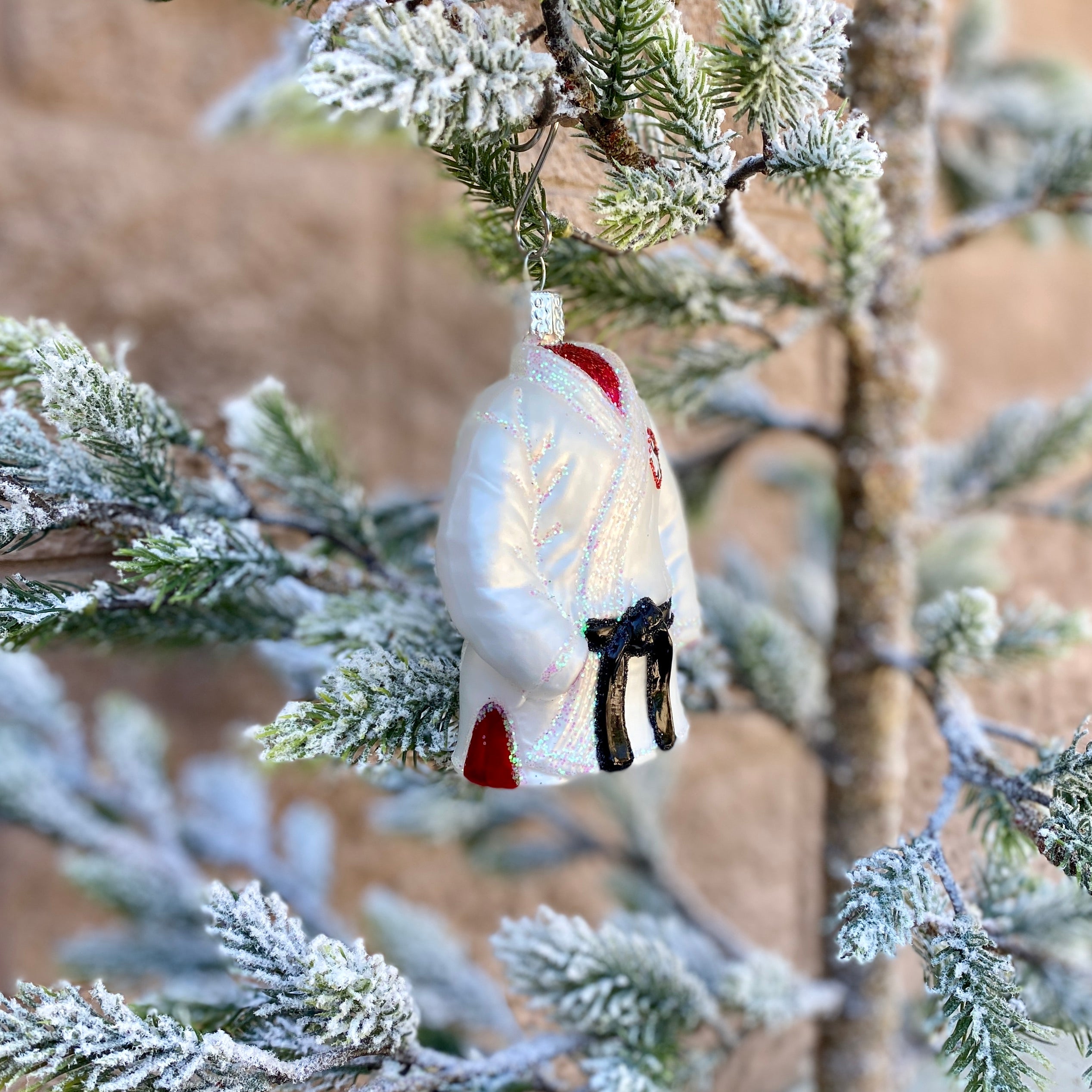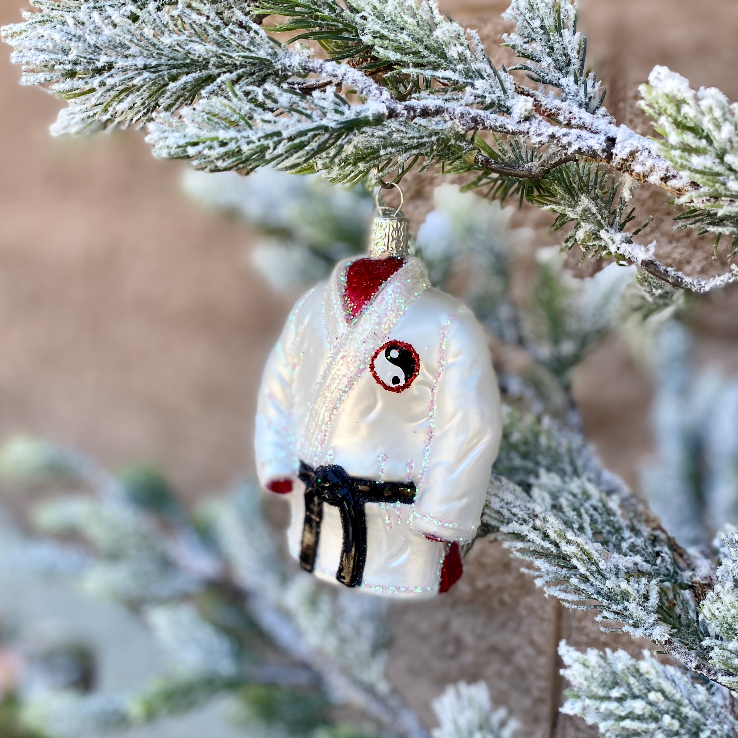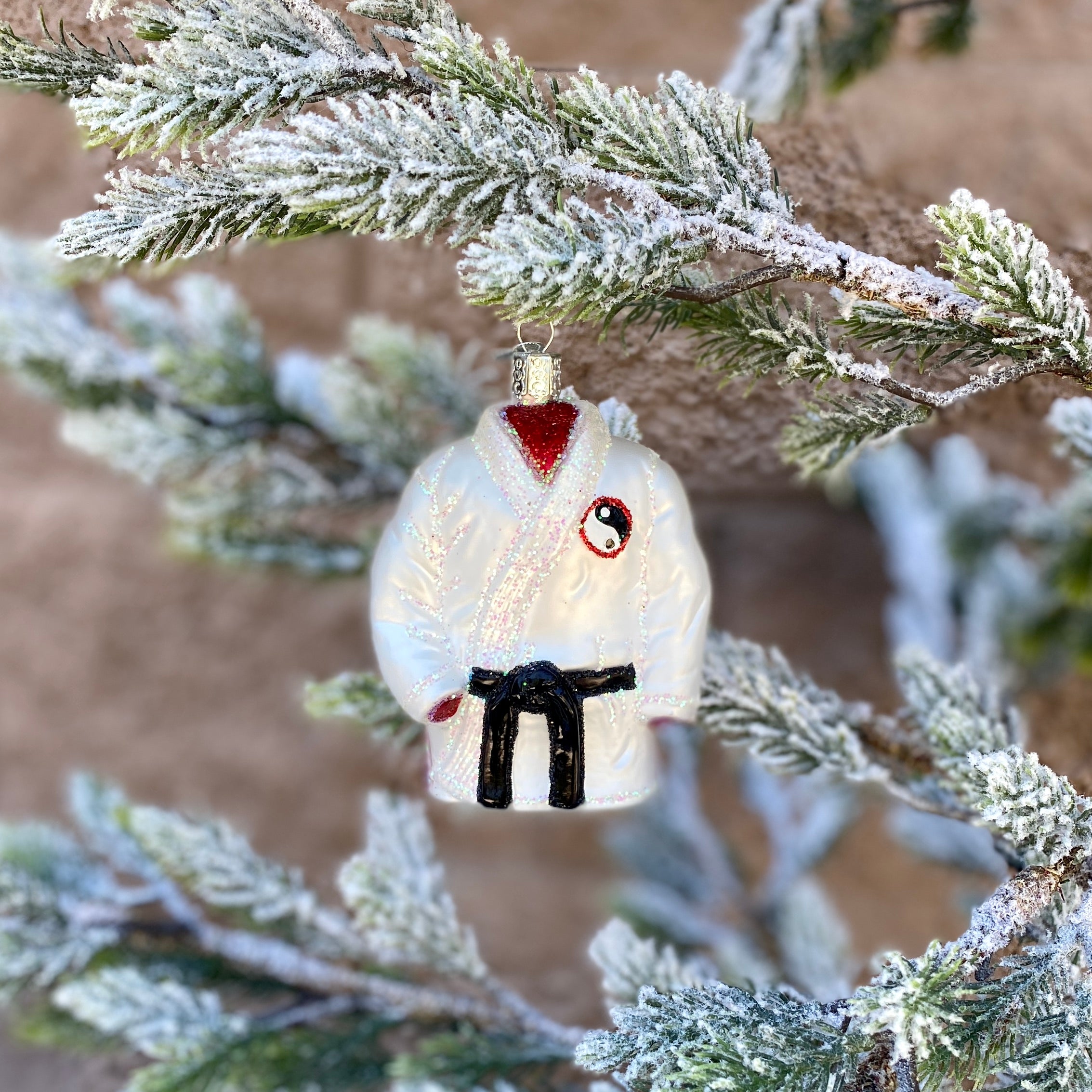 The karate gi is a must-have for those who take on karate, judo, and jiu-jitsu! Crafted from a durable, cotton canvas, this gi can take a beating and stay as comfy as can be. Colored belts are used to show the skill level of the wearer, and patches with the dojo name are sewn on the front. If you're a martial arts enthusiast, grab this unique ornament and add it to your collection! 4"H X 3.25"L X 1.5"W
