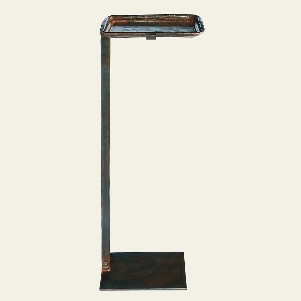 Indulge in the sophistication and functionality of Jan Barboglio's stunning iron forged drink table, complete with a wax cast iron tray that can be effortlessly removed. With the ability to easily slide under furniture, this luxurious piece ensures that your drink is always within reach. A must-have for every chair in your home. 30"Hx6"Wx10"L