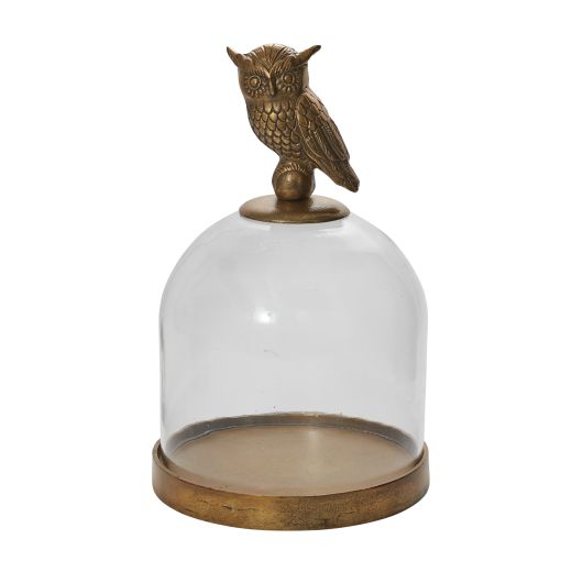 Designed to display the eeriest of collections, the Owl Cloche has a large glass dome with a cast aluminum perched owl handle. The glass fits inside the lip of a large circular aluminum base. Serve your favorite cheeses, add your favorite cake or even plant! 10.25"Wx16.25"H