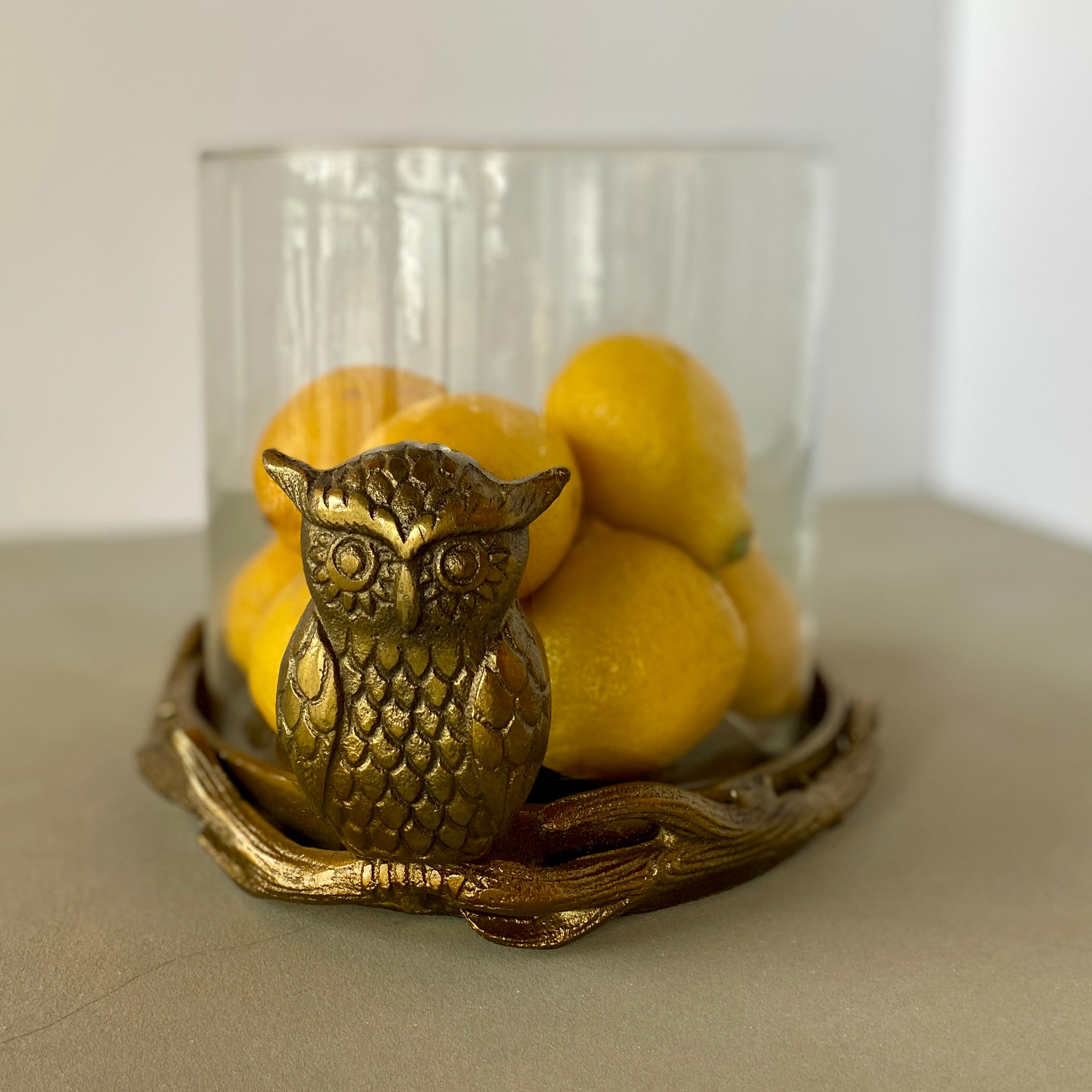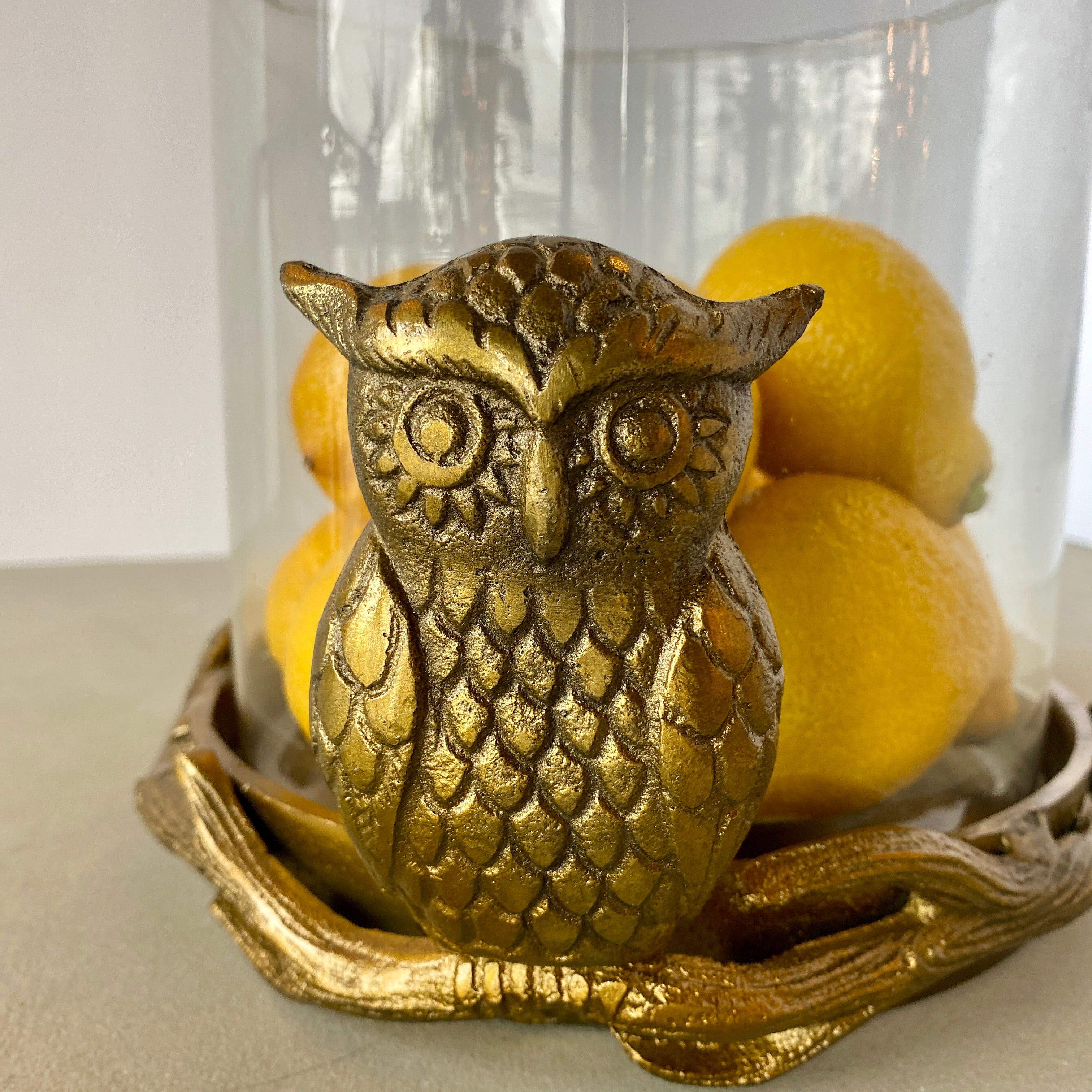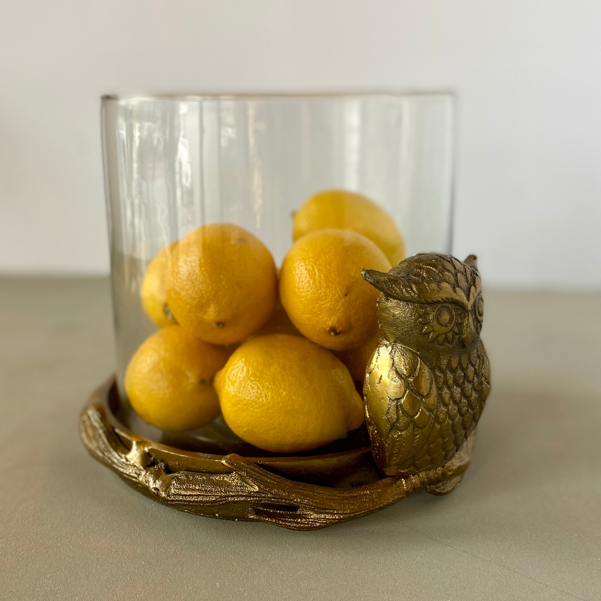 The Owl Pot features a large glass container that sits inside of a gold cast aluminum tray. The tray is decorated with an etched owl and branchy details that wrap around the lip of the tray. The Owl Pot has versatile uses and can be planted it, used for a flower arrangement, or hold a large pillar candle. 9.25"Wx7.5"H