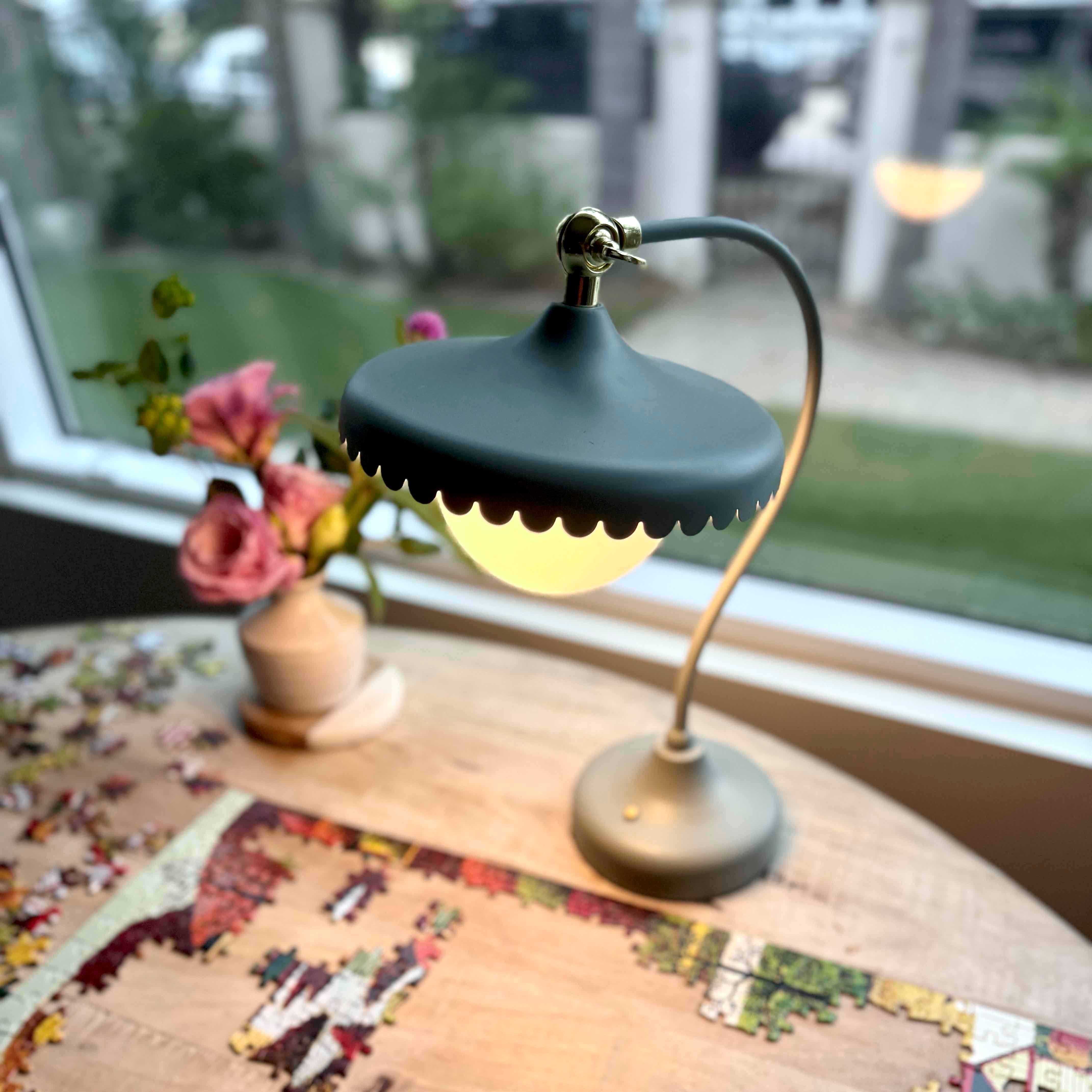 Brighten your space with the charming Paris Parlor Rechargeable Table Lamp, measuring 8-1/2”L x 12-1/2”H. Its scalloped silhouette and light sage finish brings a fun, stylish flair, while sturdy metal and glass build means it’s here to stay. No cords or fuss—just recharge and shine! Perfect for bedside, desk, or living room nooks, it casts a cozy glow that invites you to relax. Give your room a delightful lighting upgrade with this playful and practical lamp.