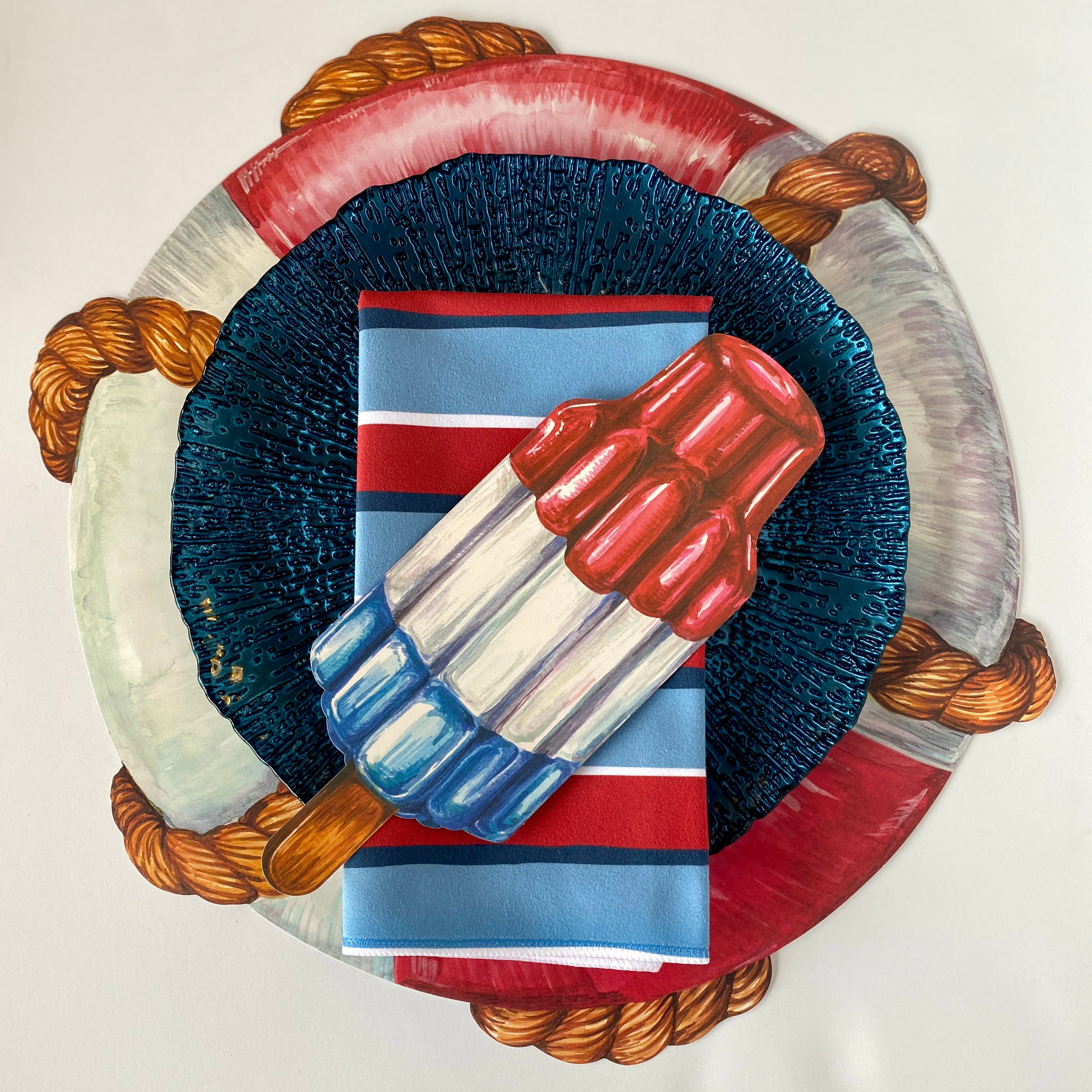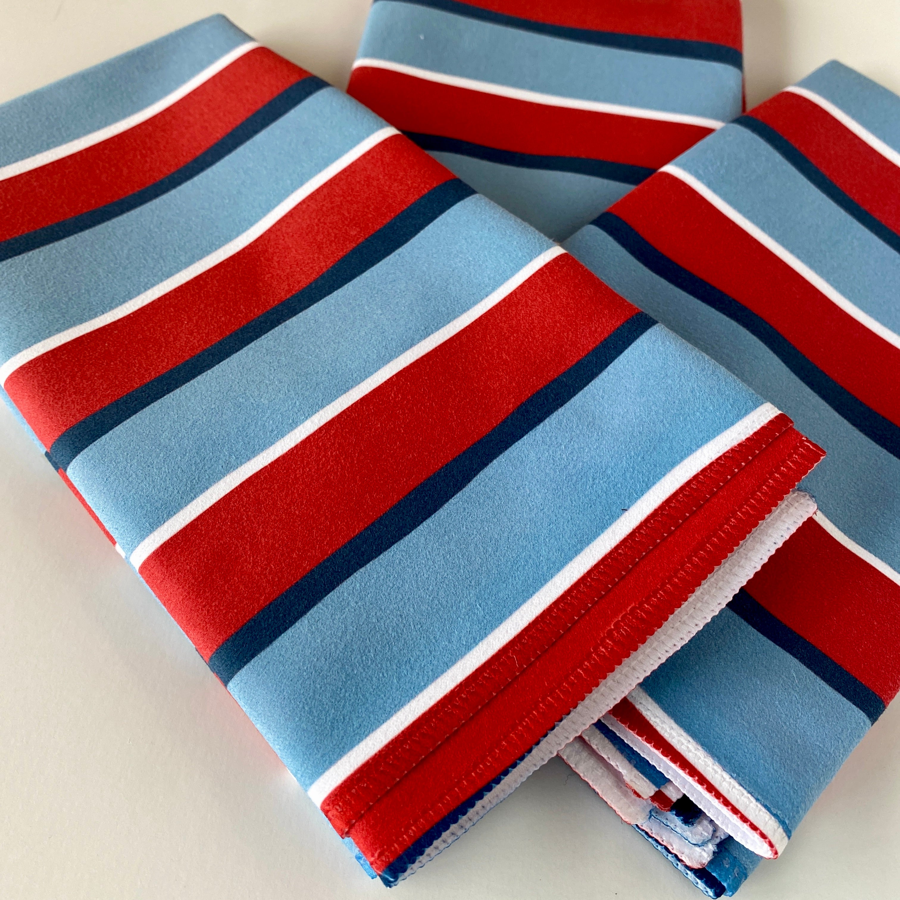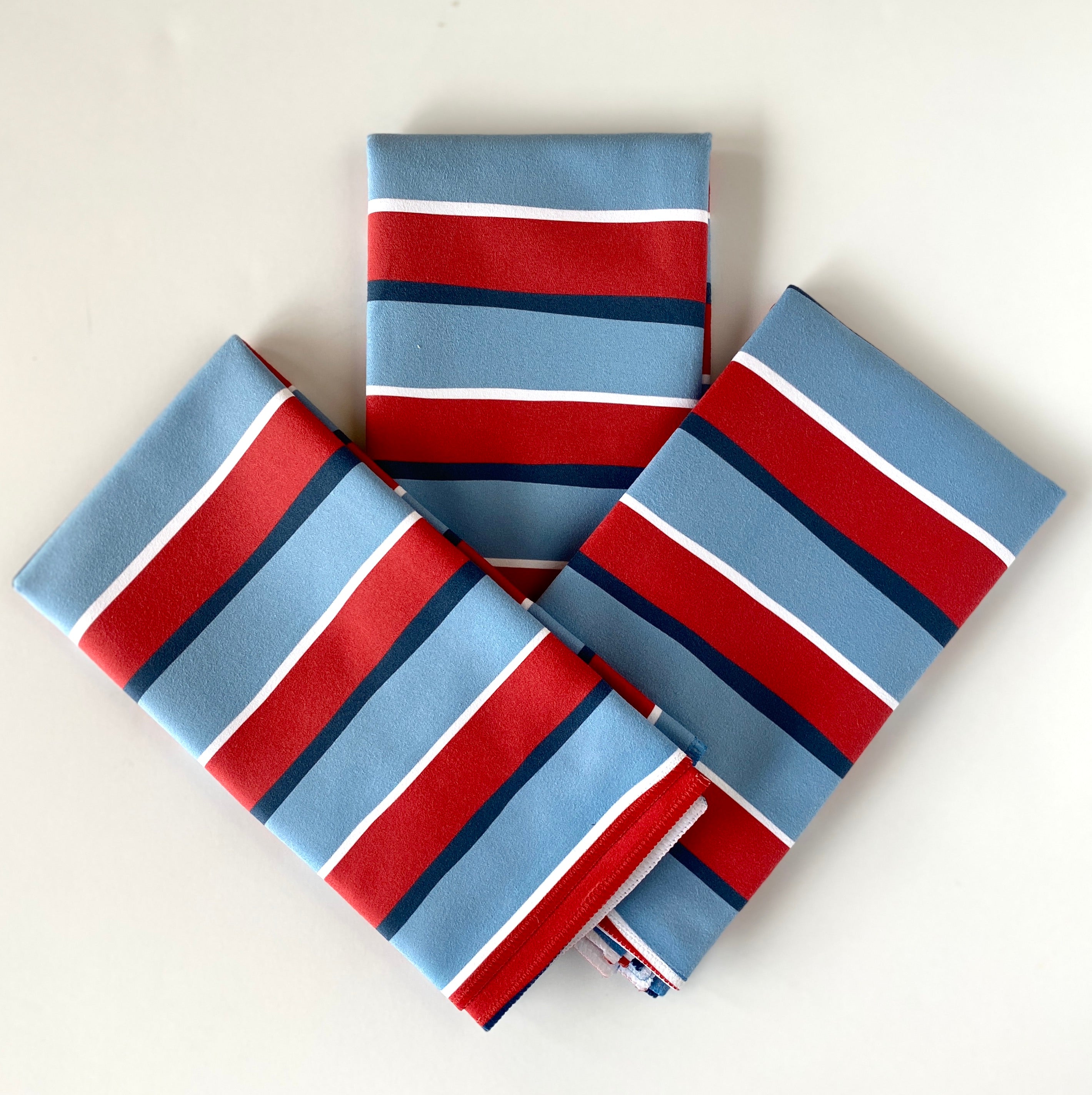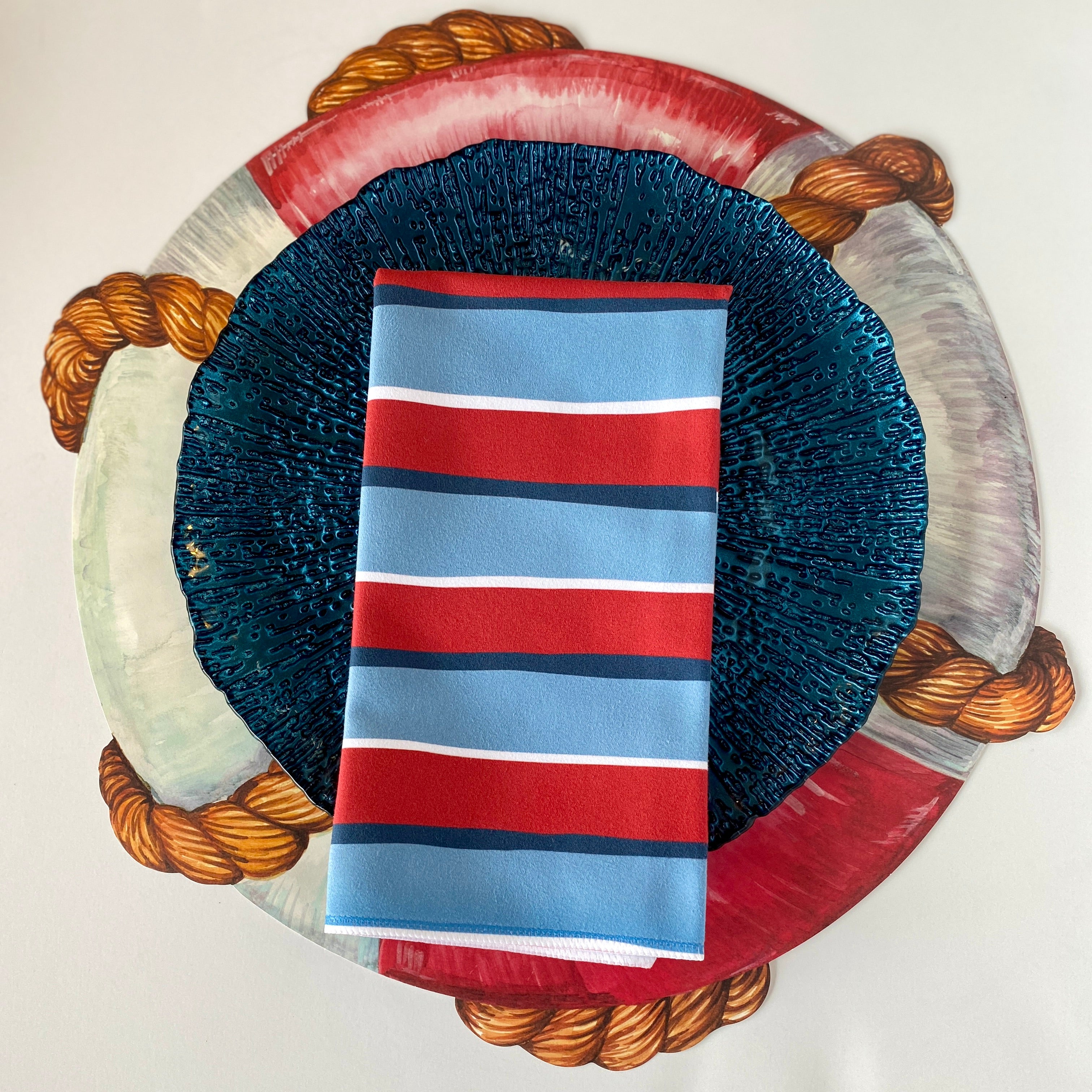 Add a delightful dose of summer vibes to your dinner party with our Patriotic Stripe Napkins. These super-soft and durable cloth napkins are made from recycled plastic bottles and dry quickly – so you can party all night without the worrying about the mess! Dance around the dinner table knowing these napkins hold up to 7x its weight! Saving the planet using cloth napkins and less paper and looking good doing it! They wash great and come out of the dryer looking new! Set of 6, 19x19, single sided print.