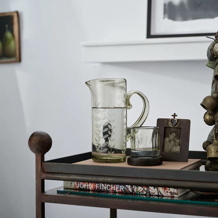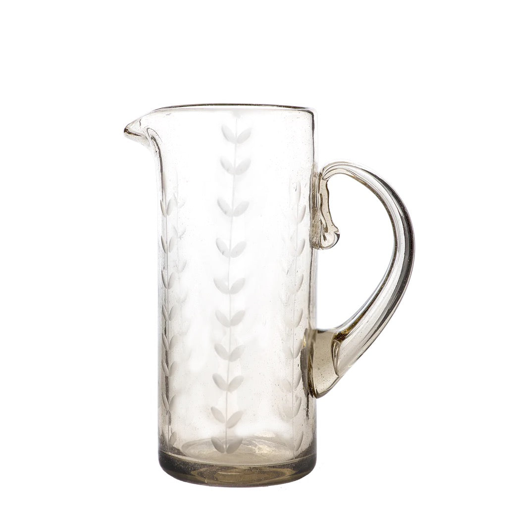 Jan Barboglio is known for her beautiful mouth blown glass pieces and she stays true to her style with the Pepe Pitcher. Beautifully mouth blown with vertical etched laurel leaves and rustic shape. We love this pitcher paired with the Vidrio d'Laurel glasses and it also makes a lovely vase. 9"Hx4"Wx8"L