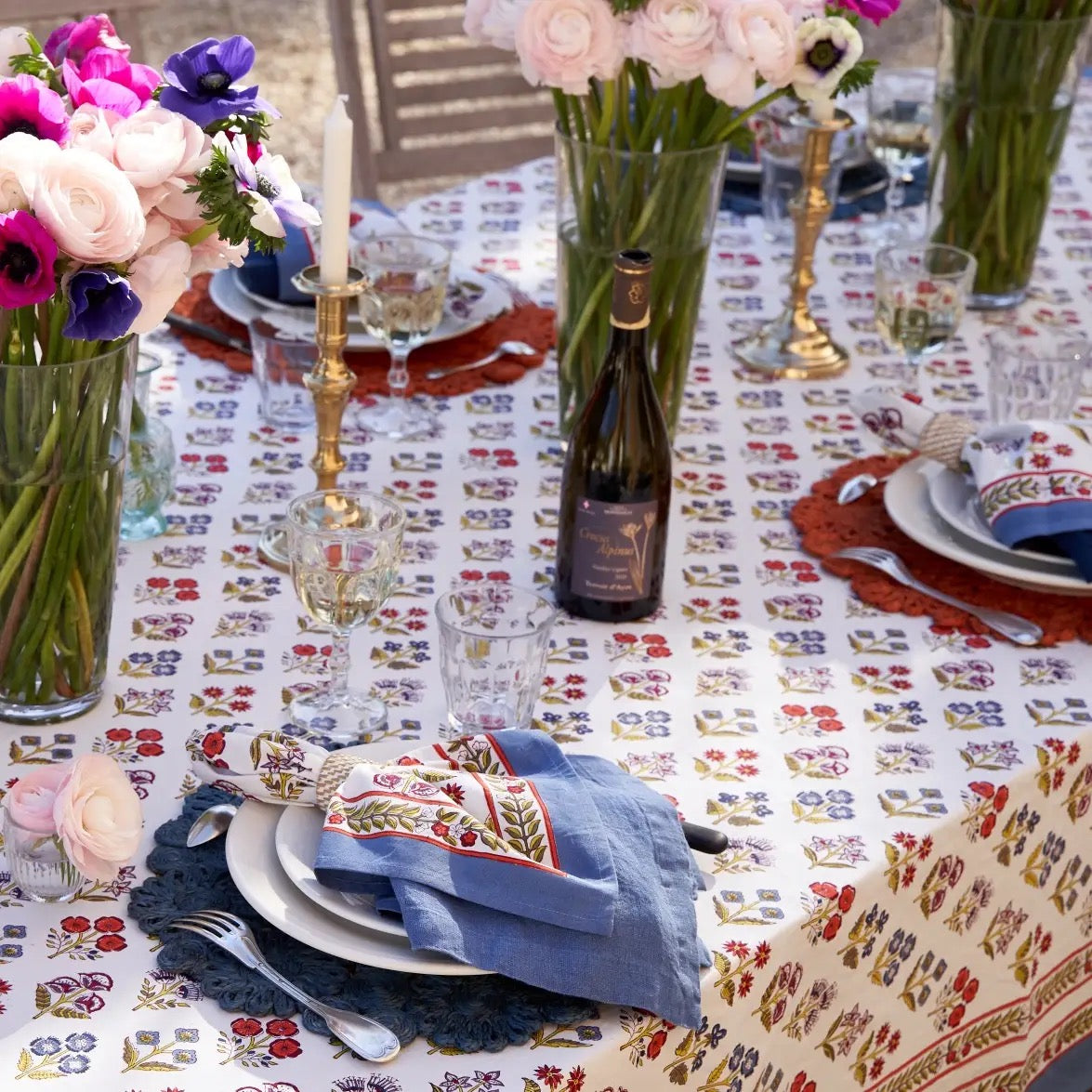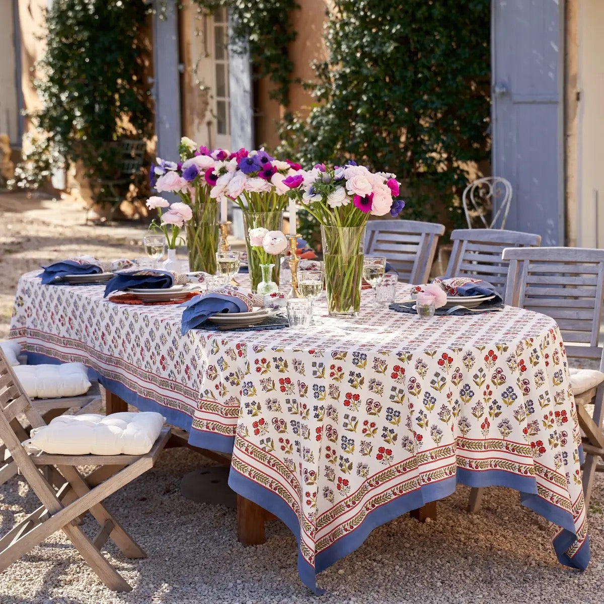 This French tablecloth features a colorful and playful design inspired by the beautiful patterns of Provence. Whether for special occasions or everyday use, it adds a touch of vibrancy to any table. Hand-printed by skilled artisans using a time-honored technique, it is a unique and carefully crafted piece. Designed by Parisian artist Bruno Lamy, with a nod to the verdant landscape of Southern France. Made from 100% cotton, it is both easy to care for and suitable for daily use. Hand-block printed by artisans. 71"x106".