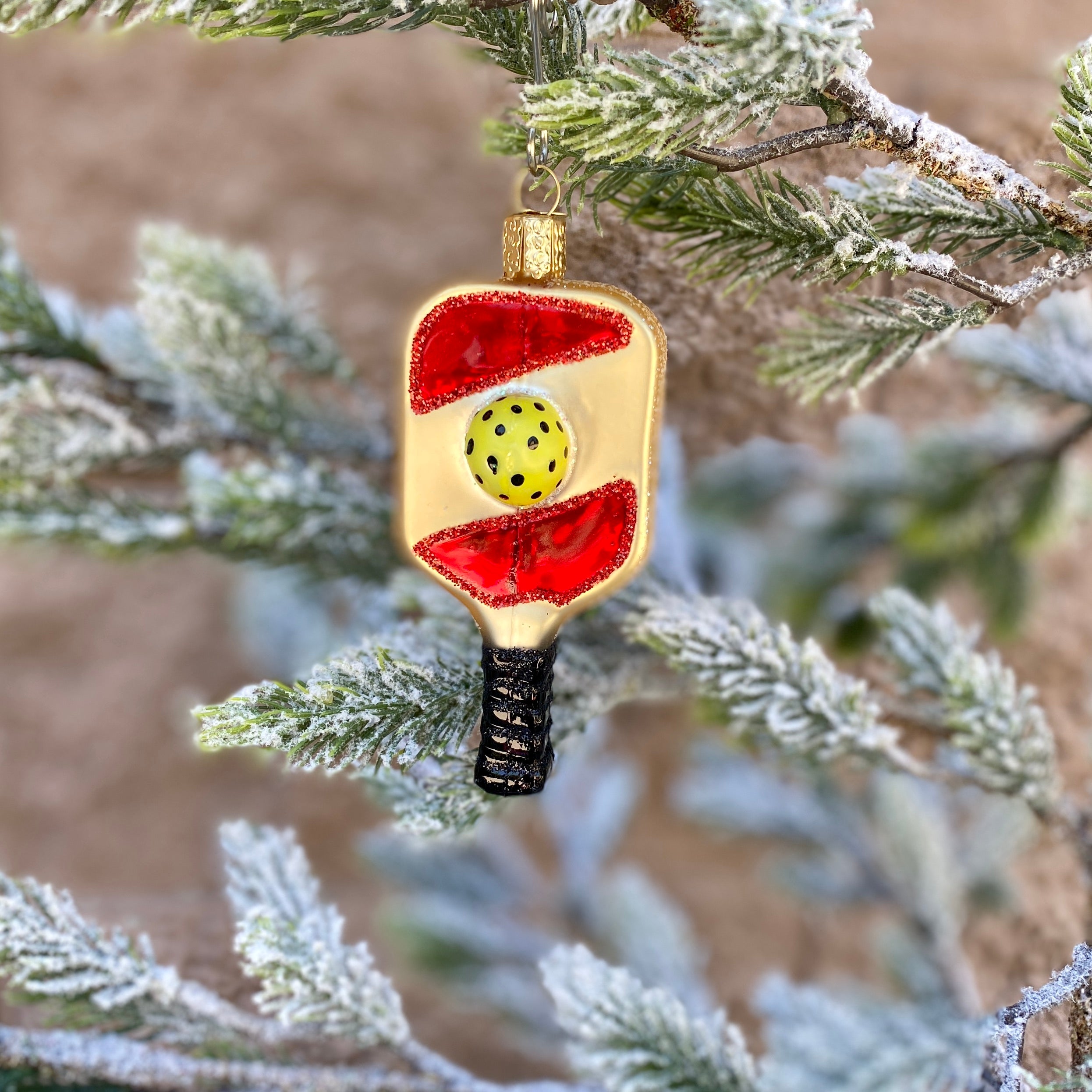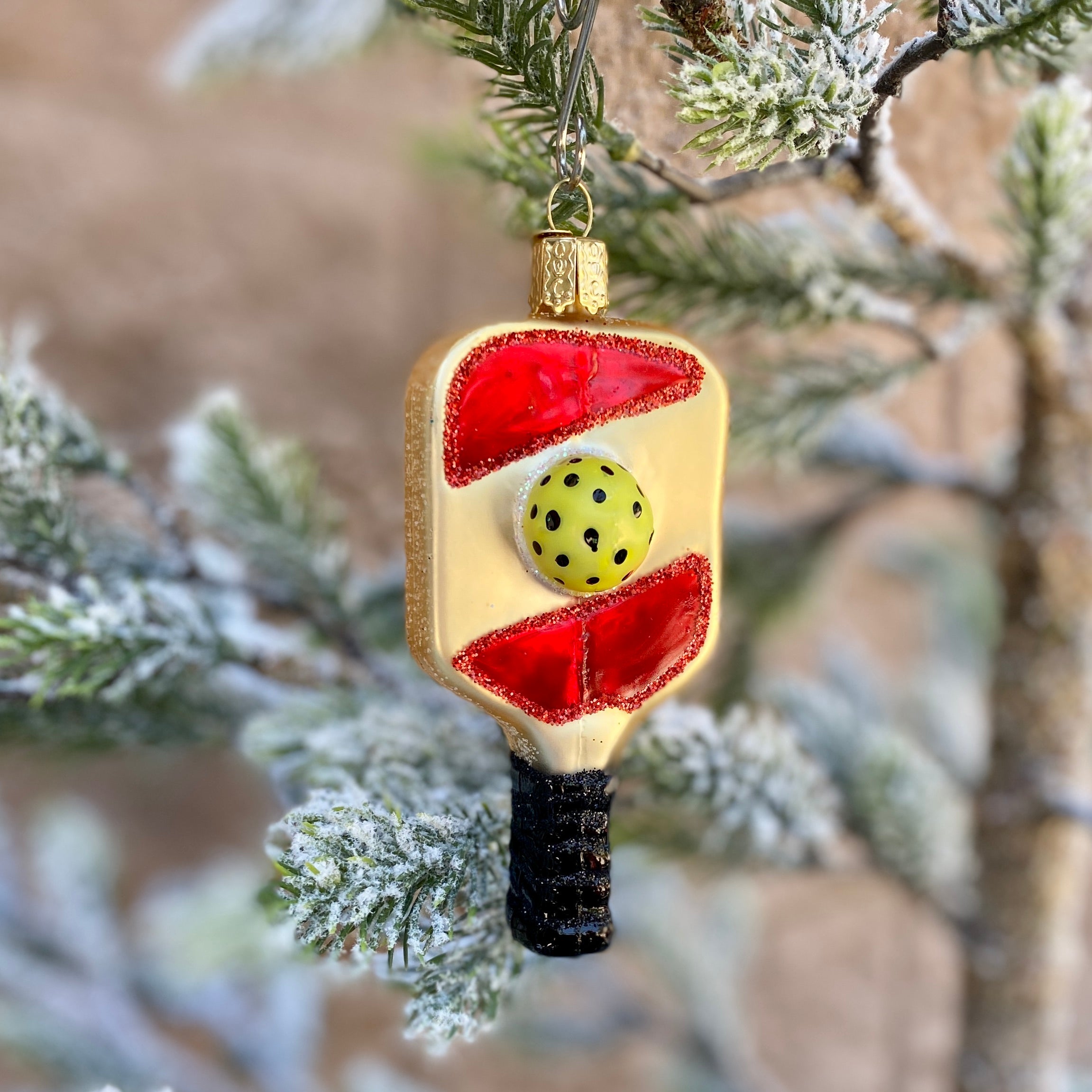 This Pickleball Paddle Ornament is sure to be a hit at any holiday gathering! Crafted from hand-blown glass, it's the perfect way to show off your love of pickleball--in a festive, quirky way. Add some fun to your tree this year with this unique addition! 4.25"H X 1"L X 2"W